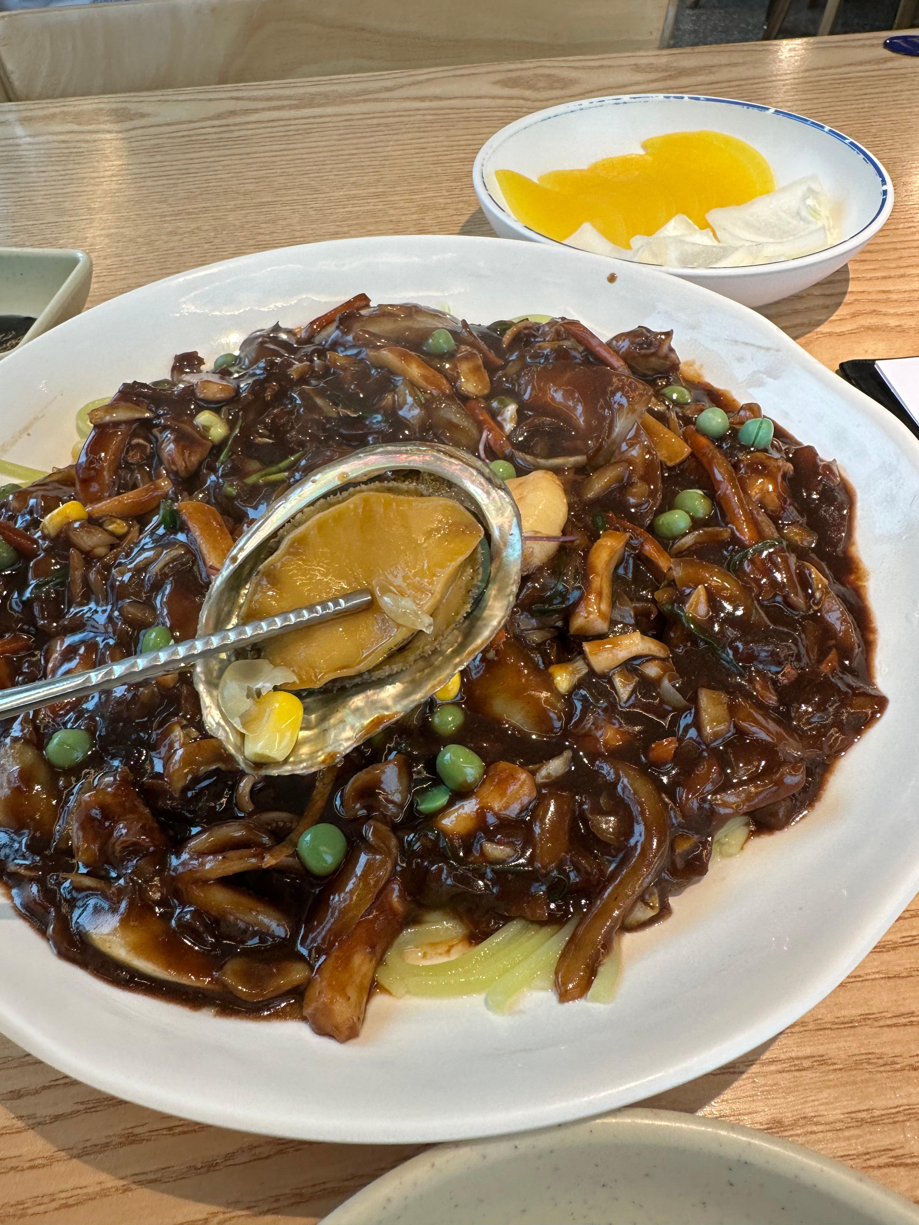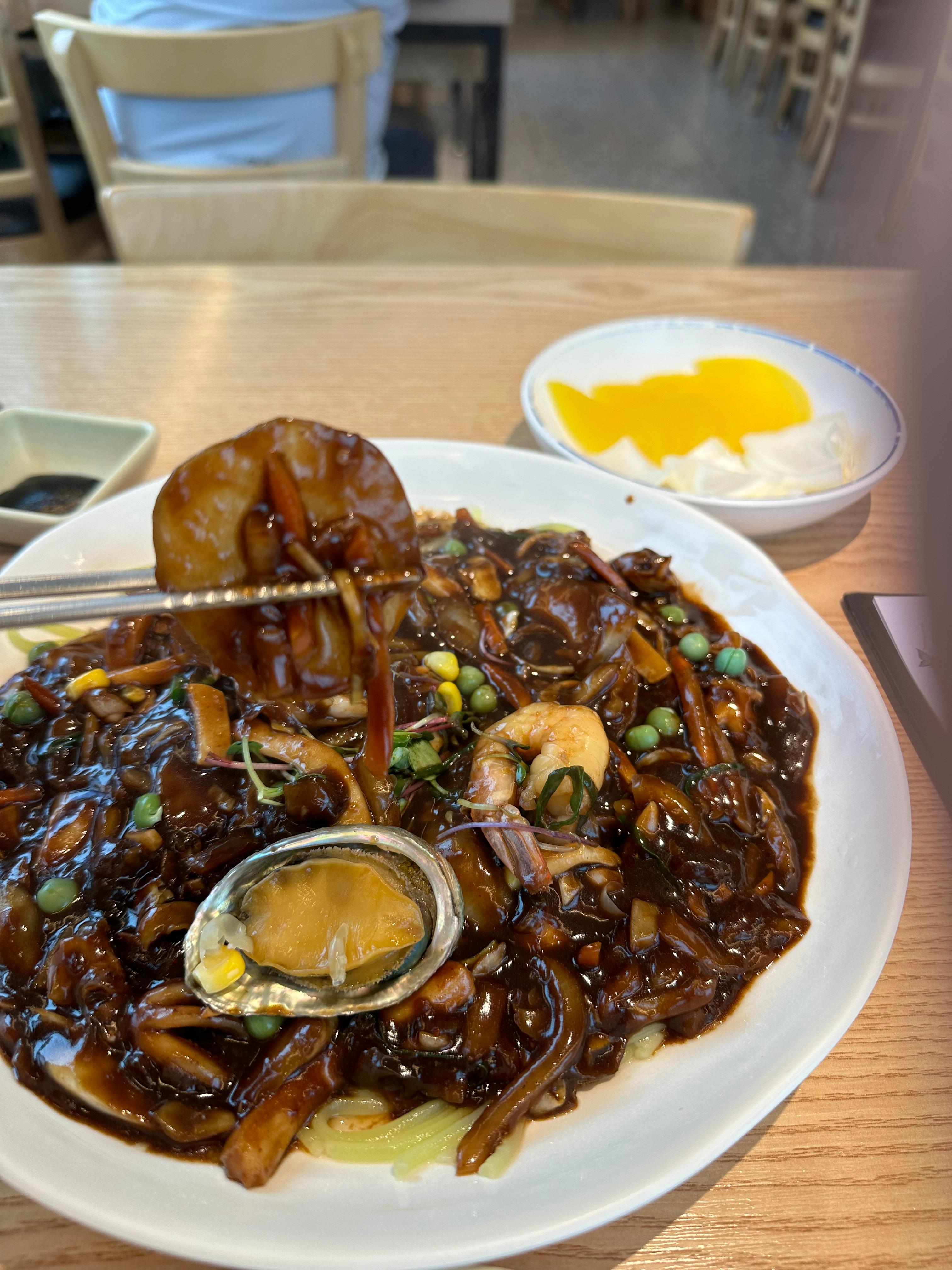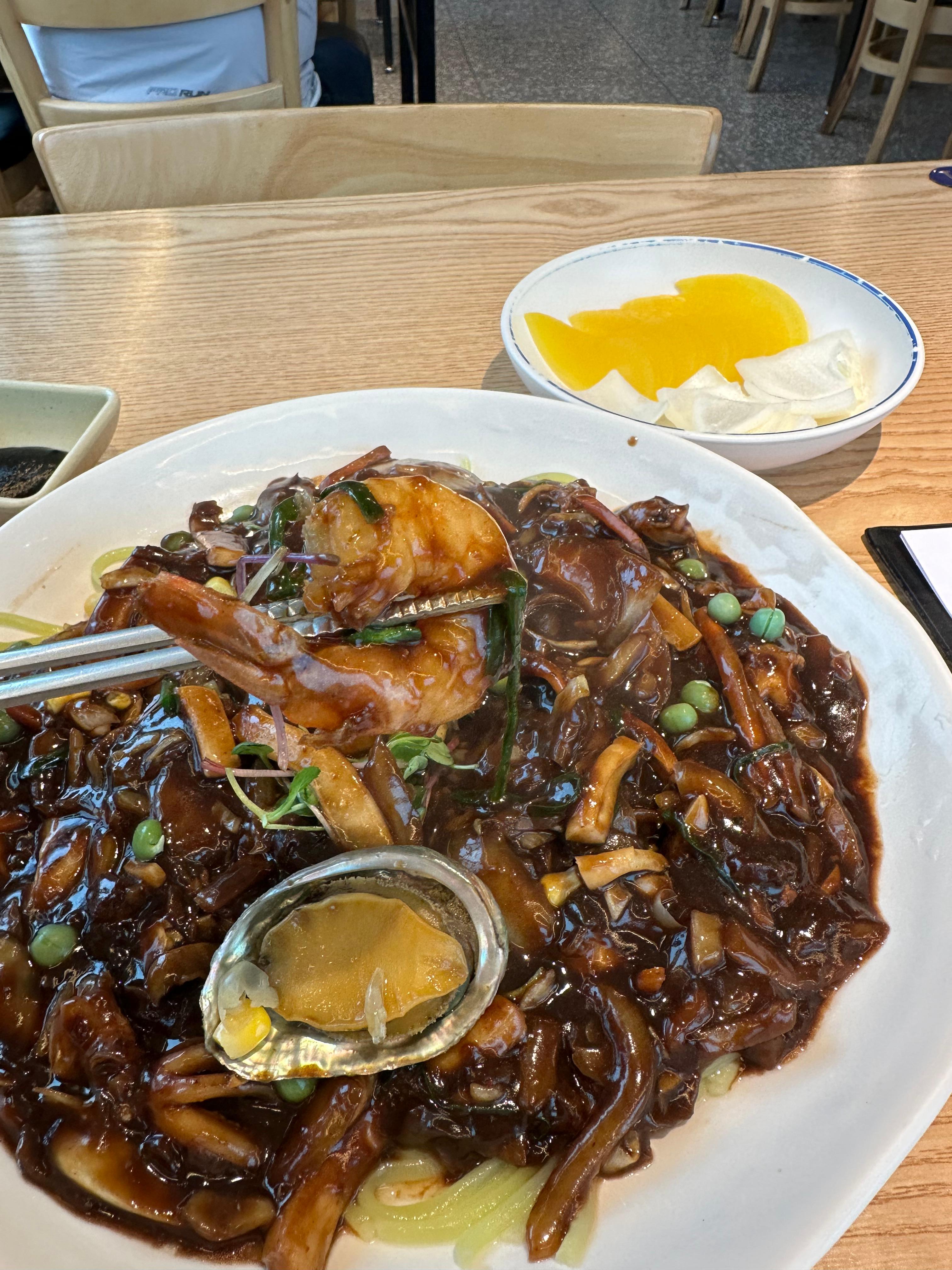 해동용궁사 맛집 용궁해물쟁반짜장에서 해물쟁반짜장을 주문해서 나오기까지는 5분 정도 걸렸지만 그 5분동안 매장을 돌아보며 넓은 창문으로 용궁쟁반짜장이 있는 주위를 보았습니다. 해물쟁반짜장에는 이렇게 전복 큰거 하나가 들어있었습니다. 전복외에도 먹다보니까 새우를 포함해서 다양한 해산물이 들어있었는데요.