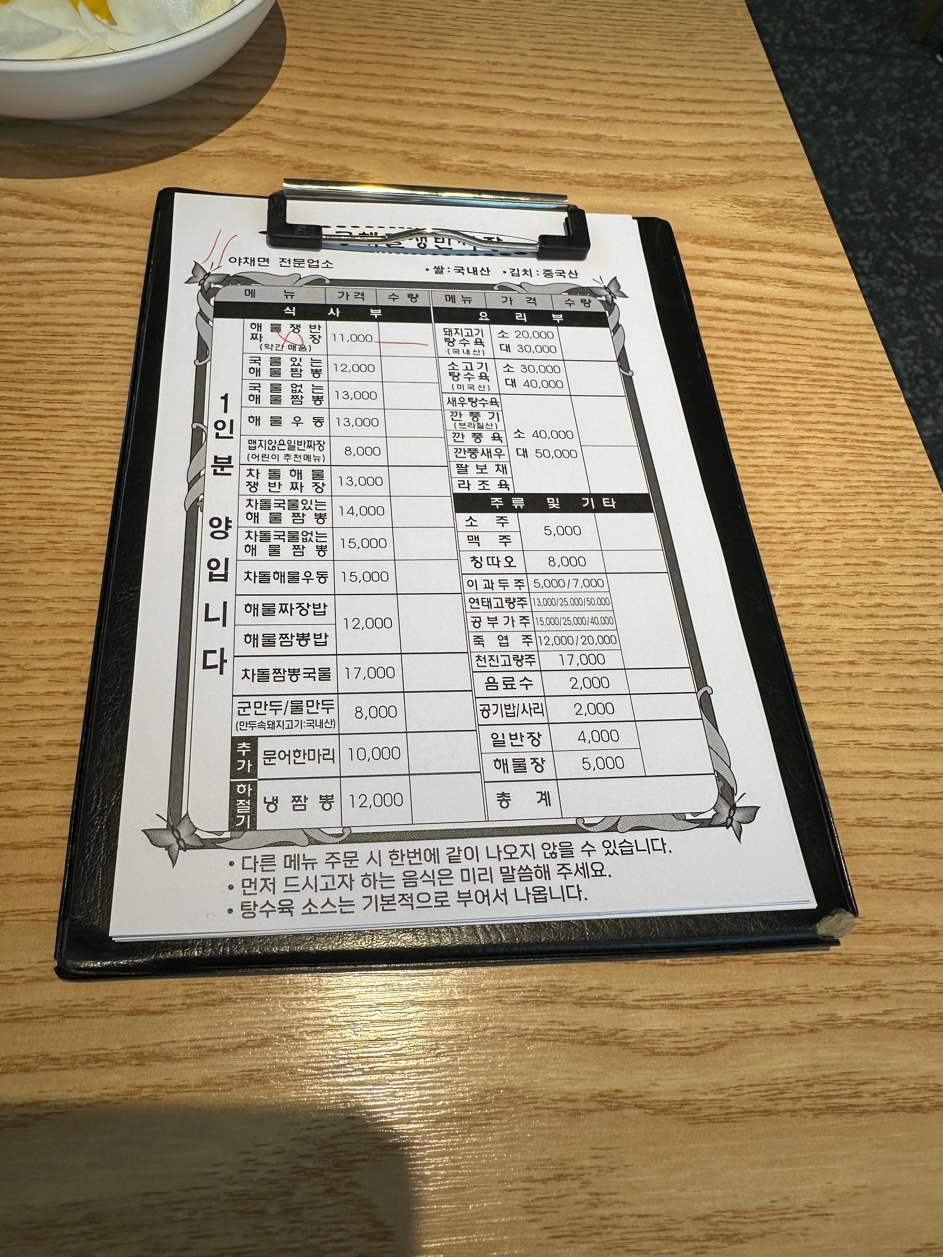- 해물쟁반짜장이 주 메뉴입니다. 해물쟁반짜장은 2인분부터 쟁반으로 나온다고 메뉴판에서 볼 수 있는데요. 저는 혼자인데 쟁반으로 나왔습니다.