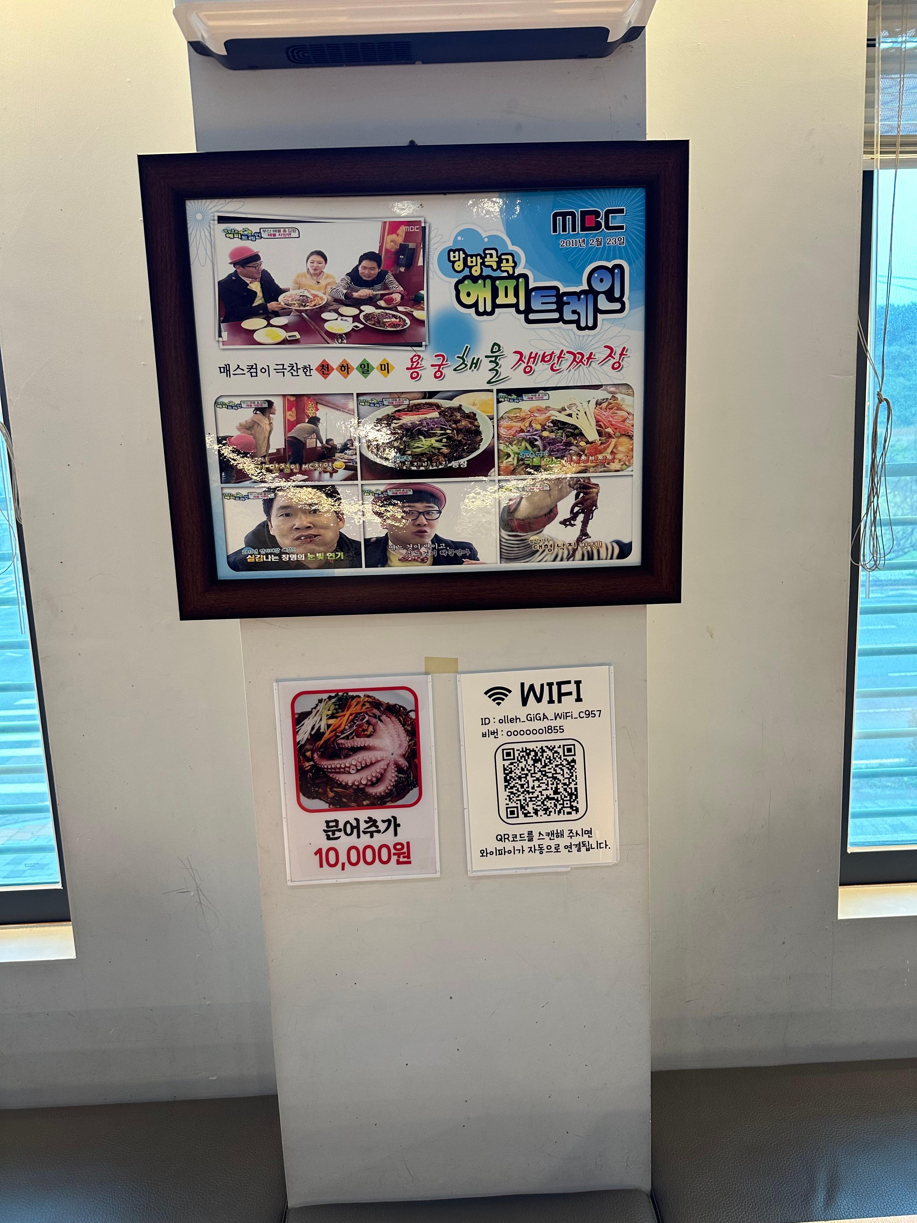 식사를 하기 위해 계단을 통해 2층으로 올라가고 있었습니다. 메뉴판을 볼 수 있었구요. 바닷가 주변이라 그런지 입구에서부터 문어 추가 할 수 있다는 것을 볼 수 있었습니다. 문어 추가시 만원밖에 되지 않는 것 같습니다. 바다 주변이라 그런지 메뉴 대부분이 메뉴명에 해물이라는 단어가 들어가있는 것을 볼 수 있었습니다. 주말에는 관광객이 많다보니 아무래도 주차해놓고 출차 안하고 용궁사나 그 외에 관광지 가는 사람이 있는지 식사후 출차 안하면 주차 요금에 시간당 일정금액이 부과된다는 것을 볼 수 있었습니다.