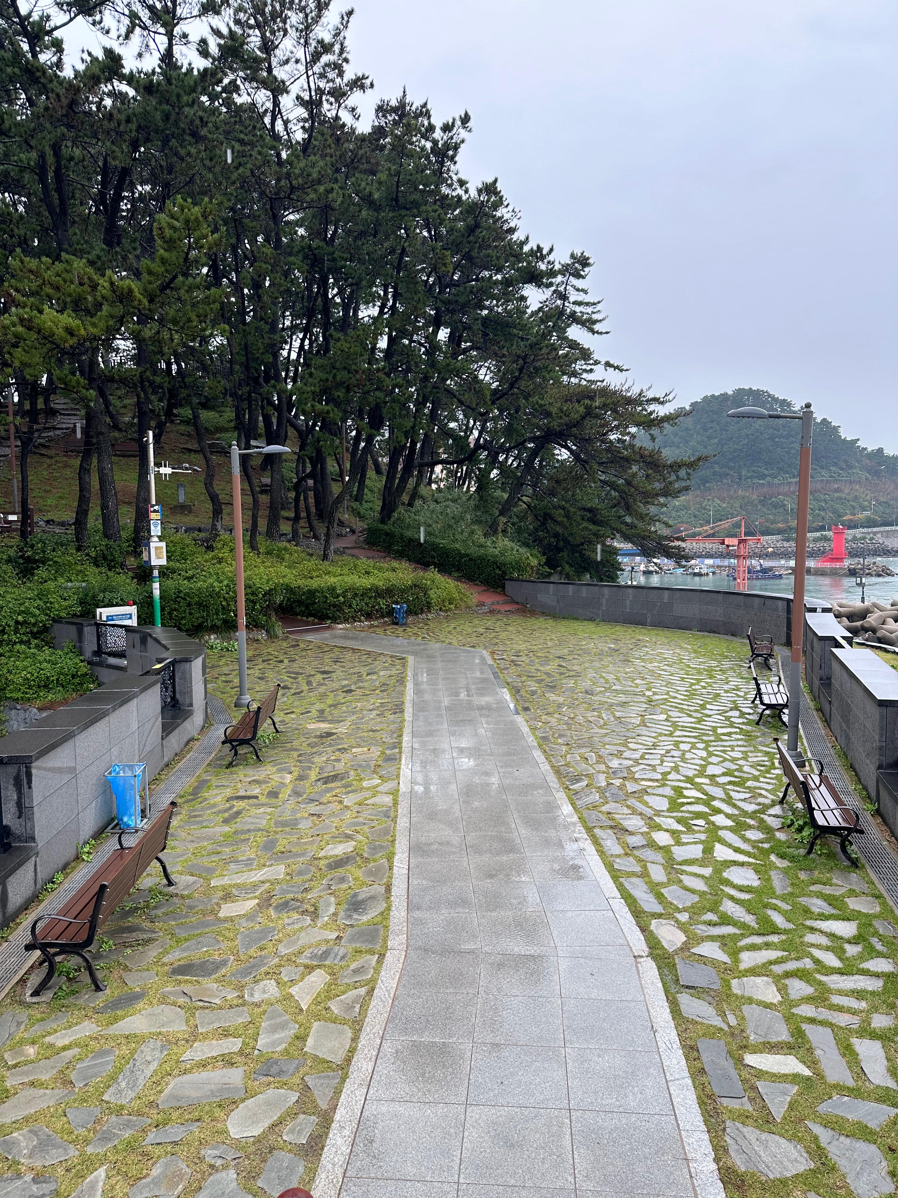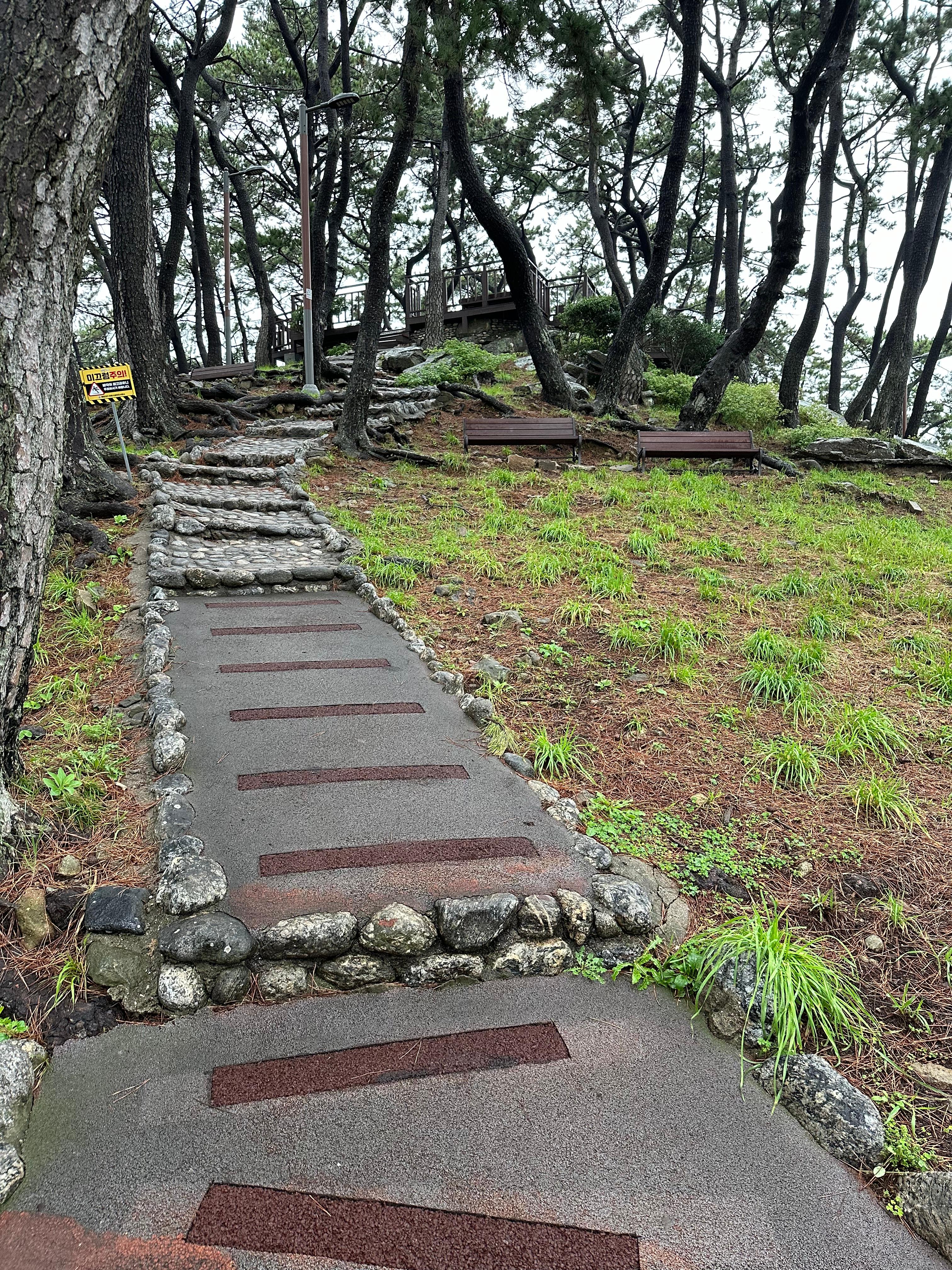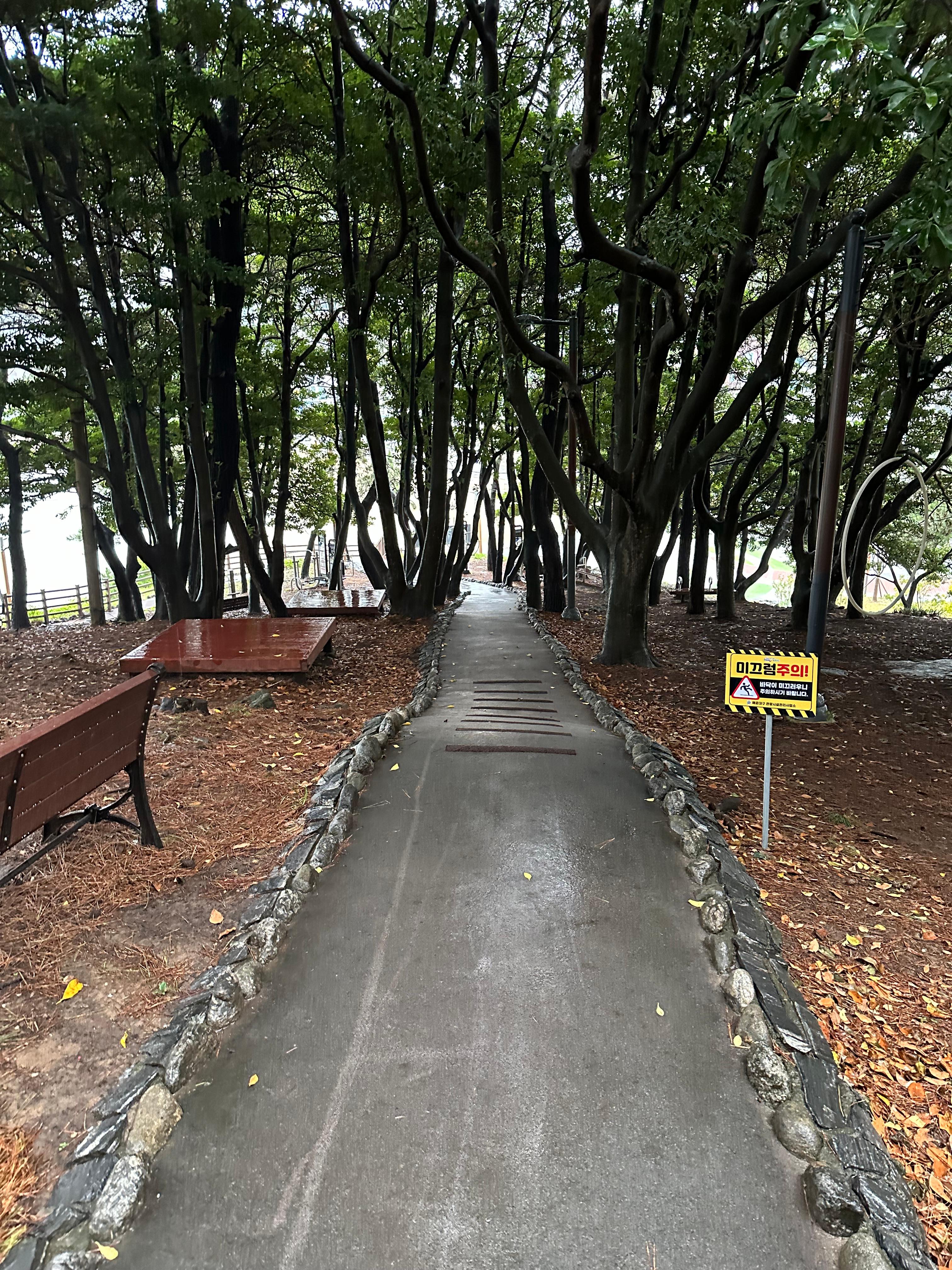 해동용궁사에서 181번 버스를 타고 내린 송정해수욕장에서는 죽도공원이 더 가까웠는데요. 그래서 죽도공원 입구에서 산책로를 따라 걷기 시작했습니다. 비에 젖은 길이지만 미끄럽지 않아 걸을만 했습니다. 비가 와도 바람이 불지 않은 송정해수욕장이라 그런지 더욱 더 걸을만 했습다.