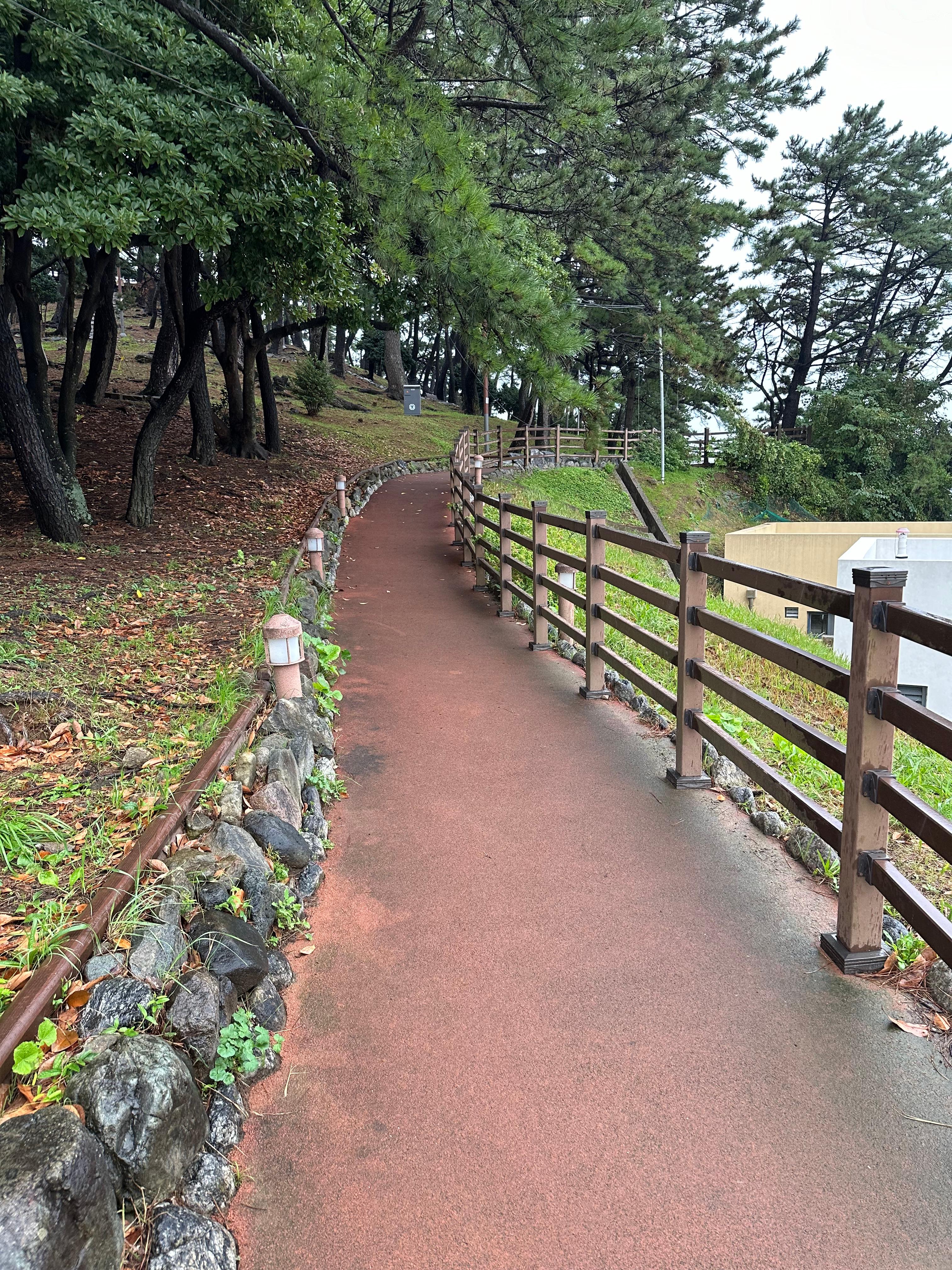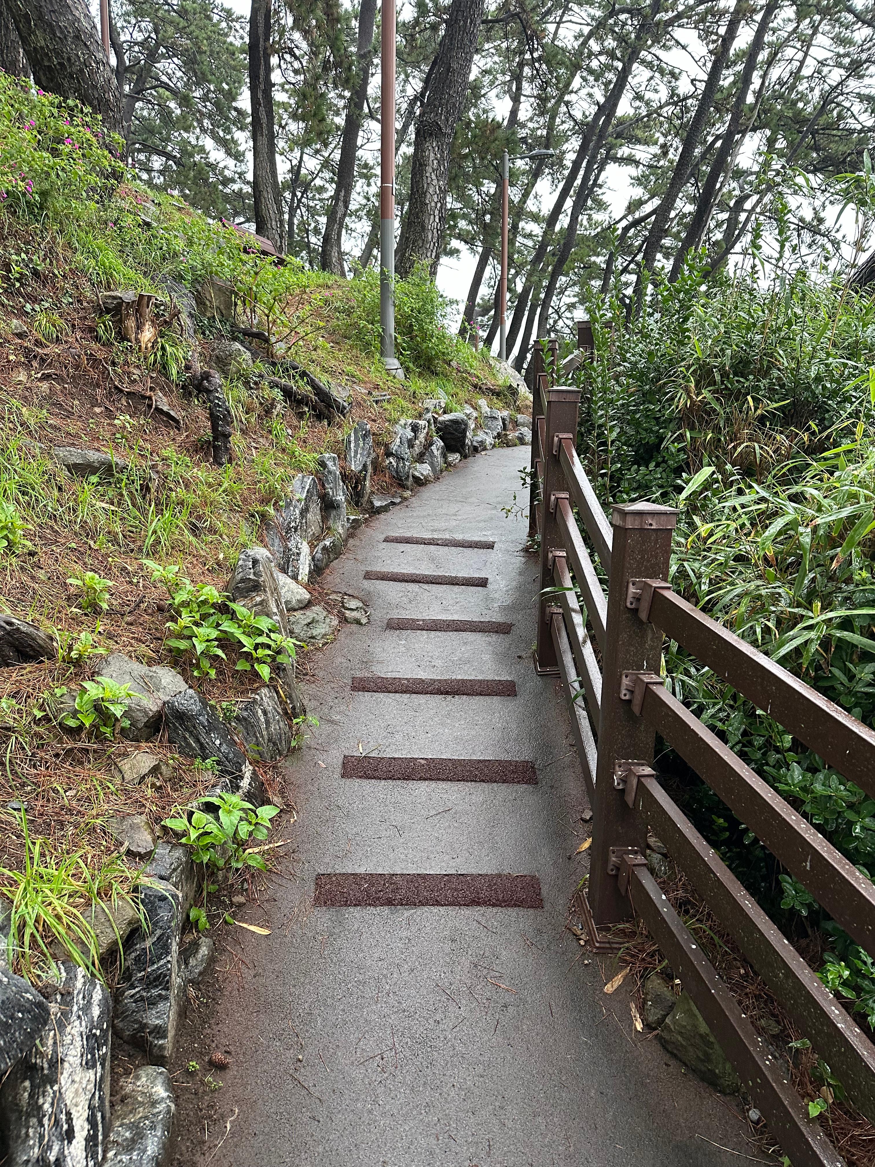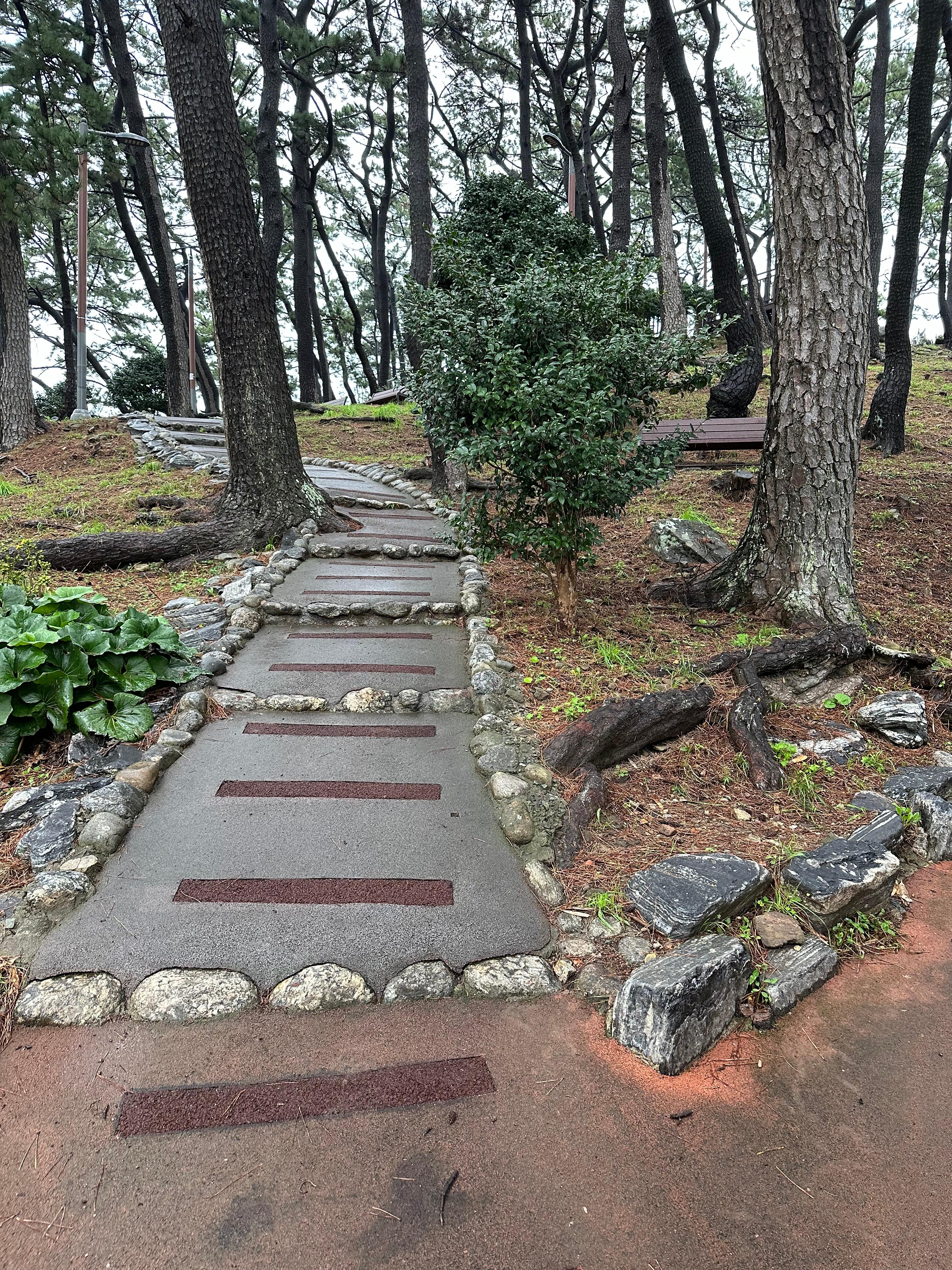 해동용궁사에서 181번 버스를 타고 내린 송정해수욕장에서는 죽도공원이 더 가까웠는데요. 그래서 죽도공원 입구에서 산책로를 따라 걷기 시작했습니다. 비에 젖은 길이지만 미끄럽지 않아 걸을만 했습니다. 비가 와도 바람이 불지 않은 송정해수욕장이라 그런지 더욱 더 걸을만 했습다.