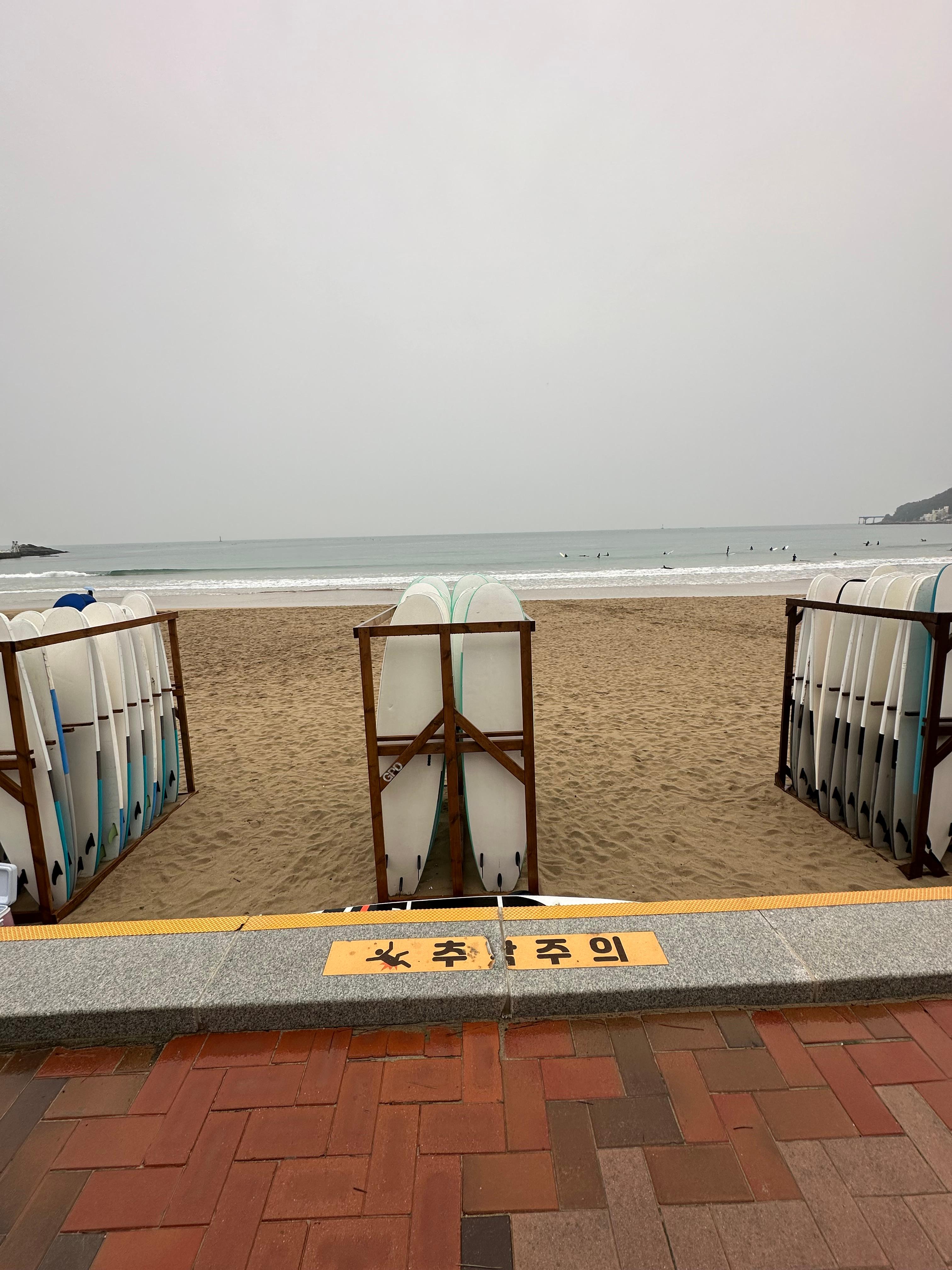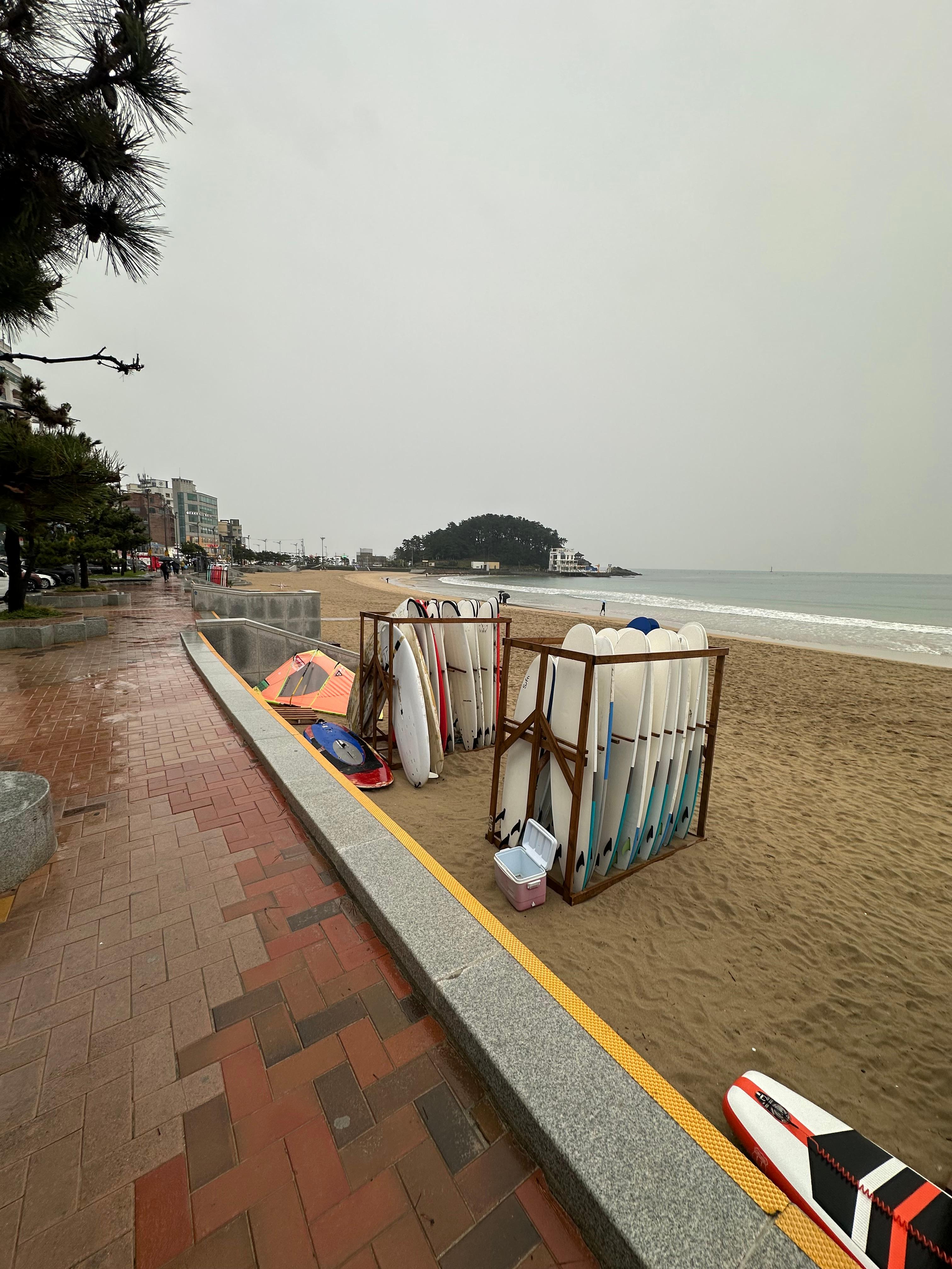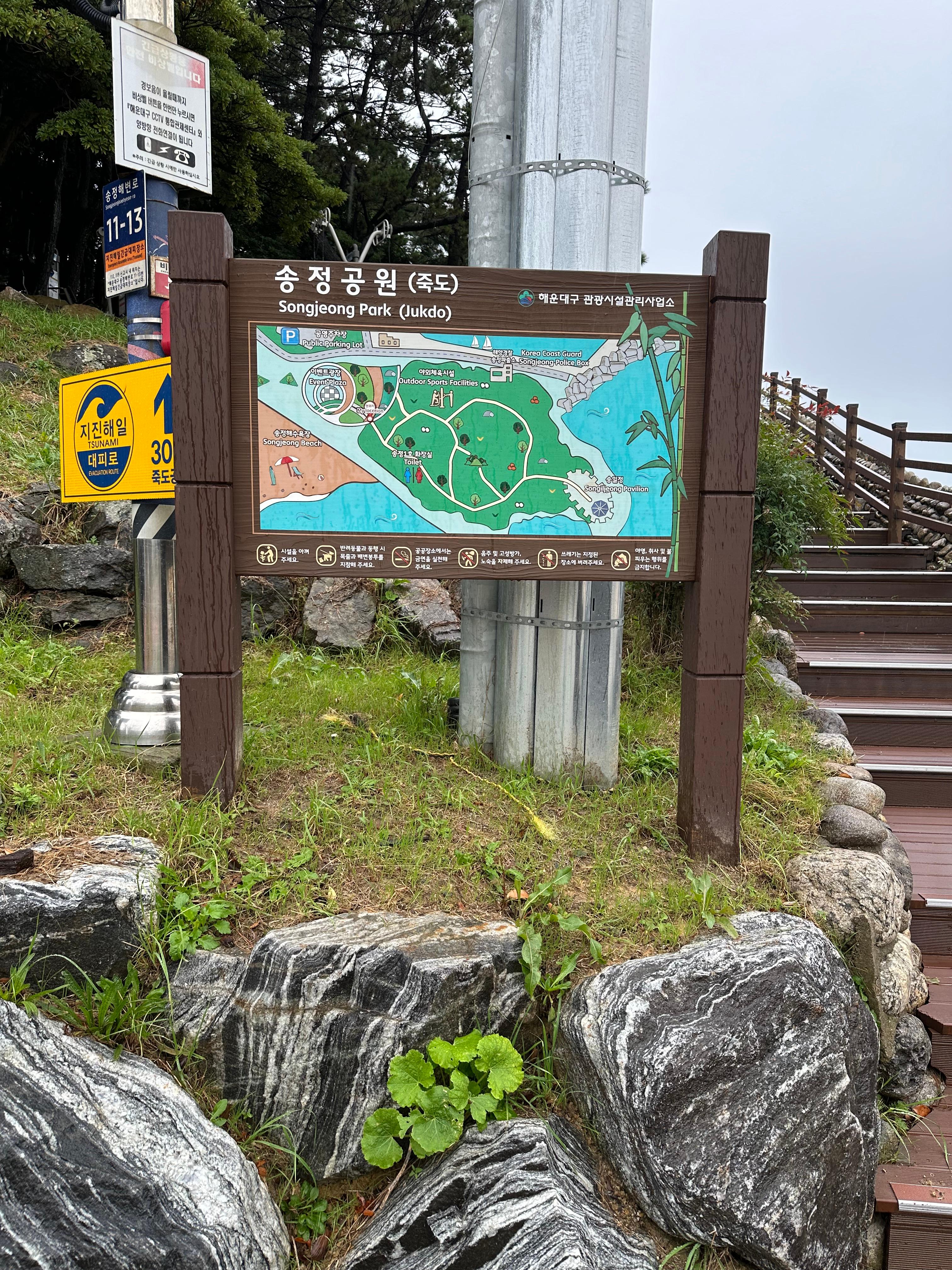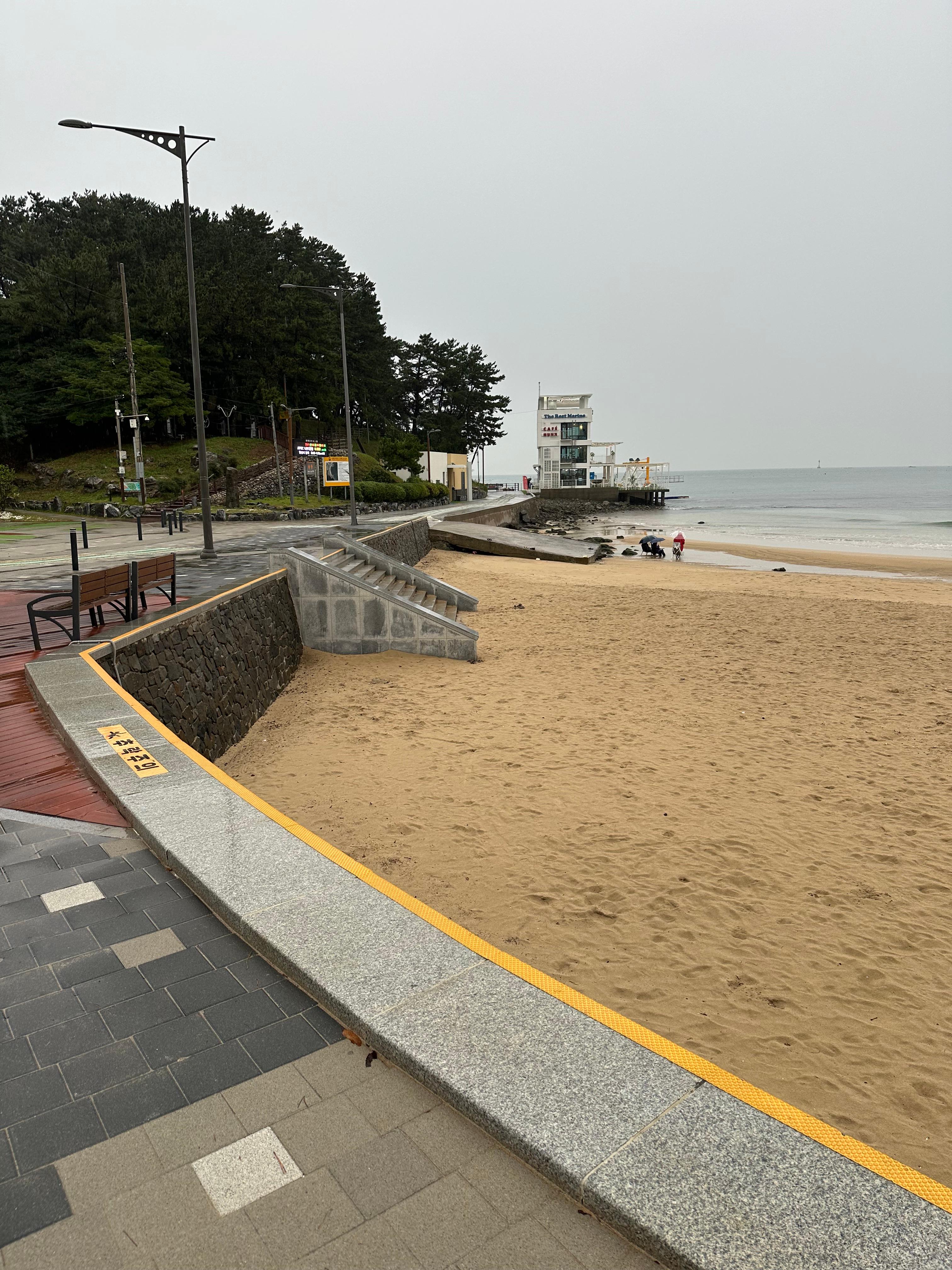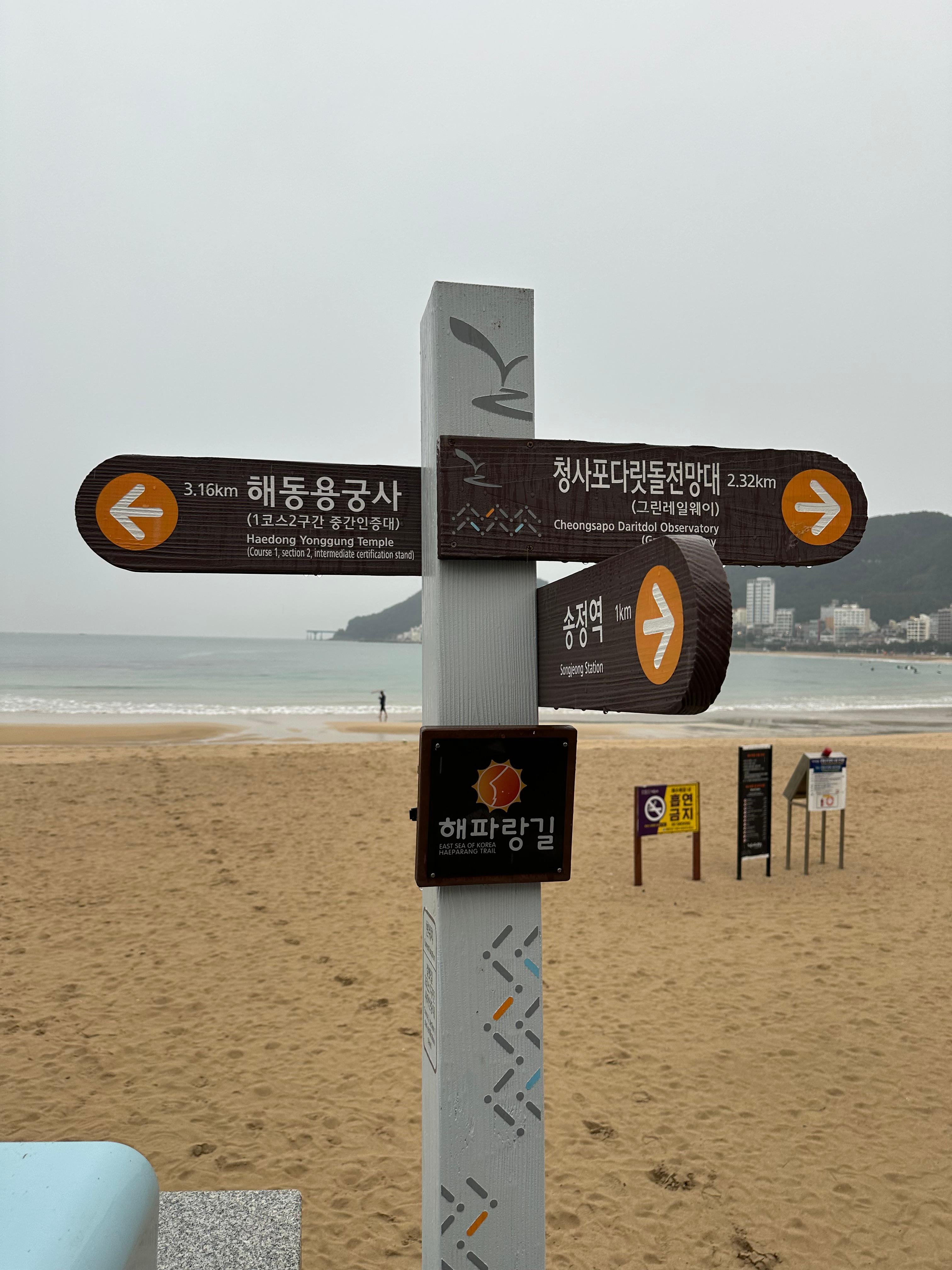 비오는 죽도공원을 벗어나서 송정해수욕장을 걷기 시작했습니다. 의외로 비가 오는데도 사람이 많았습니다. 아마 여행 왔는데 그냥 숙소에만 카페에만 있기는 그렇기 때문에 저처럼 비가 와도 움직이는 것 같았습니다. 무엇보다 당시 비가 우산쓰고 걸을만 했는데요. 옷도 많이 젖지 않고 바람도 불지 않았습니다. 송정해수욕장에서는 블루라인파크 해변열차를 타고 갈 수 있는 청사포 다릿돌전망대와 해동용궁사 안내도 볼 수 있는데요. 둘다 도보로 30분정도면 갈 수 있는 가까운 거리였습니다.