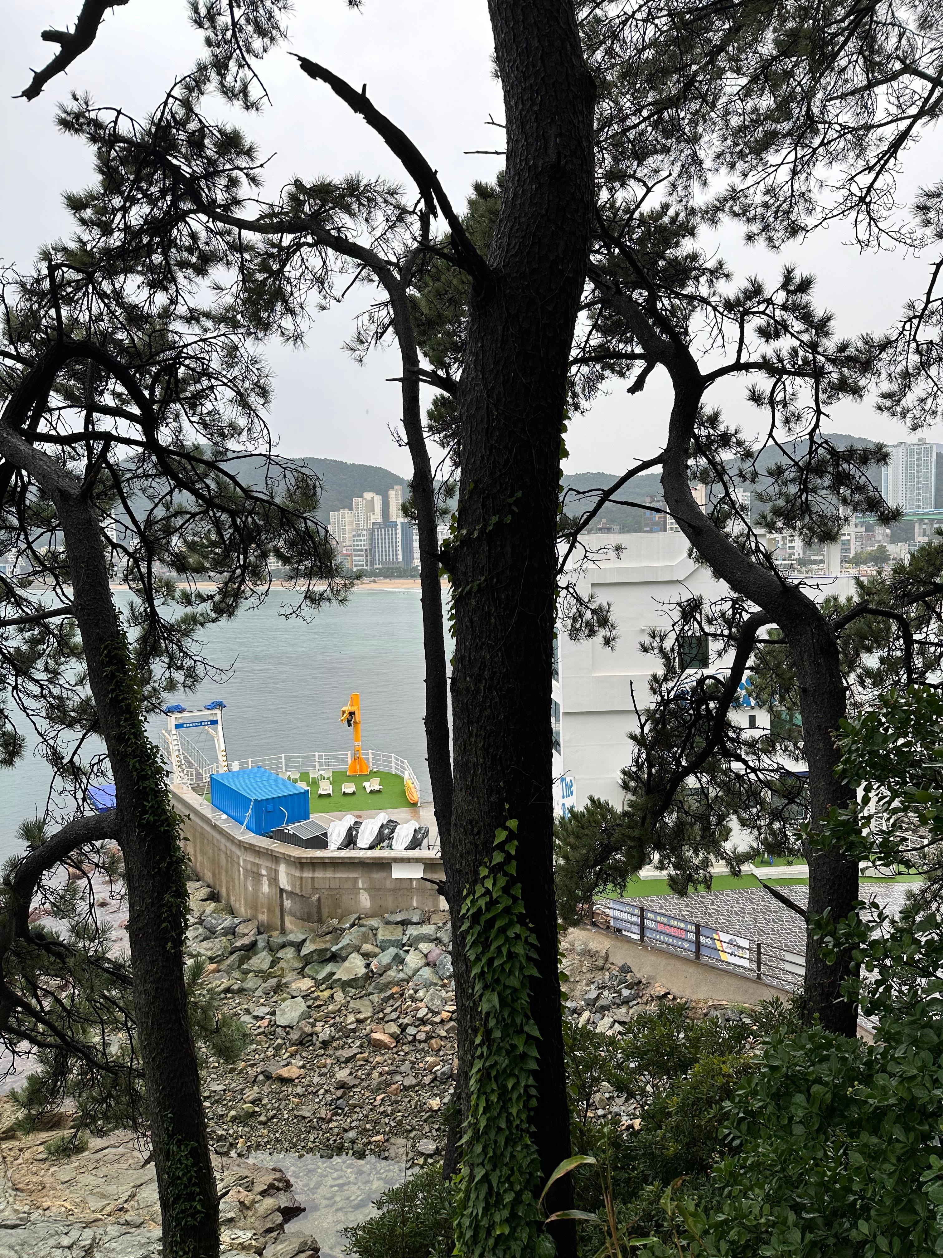죽도공원 초입에서 바라보는 송정해수욕장의 모습입니다. 비가 오니까 해는 없어서 덥지는 않은 모습이었습니다. 바닷물이 해운대와 광안리에 비해 제주도에 온것처럼 맑은 색을 볼 수 있습니다. 우리나라는 특히 동해와 제주도 가면 바다빛이 푸른것을 볼 수 있는데요. 남해의 경우데도 일부 바다에서는 푸른 빛 바다를 볼 수 있었습니다.