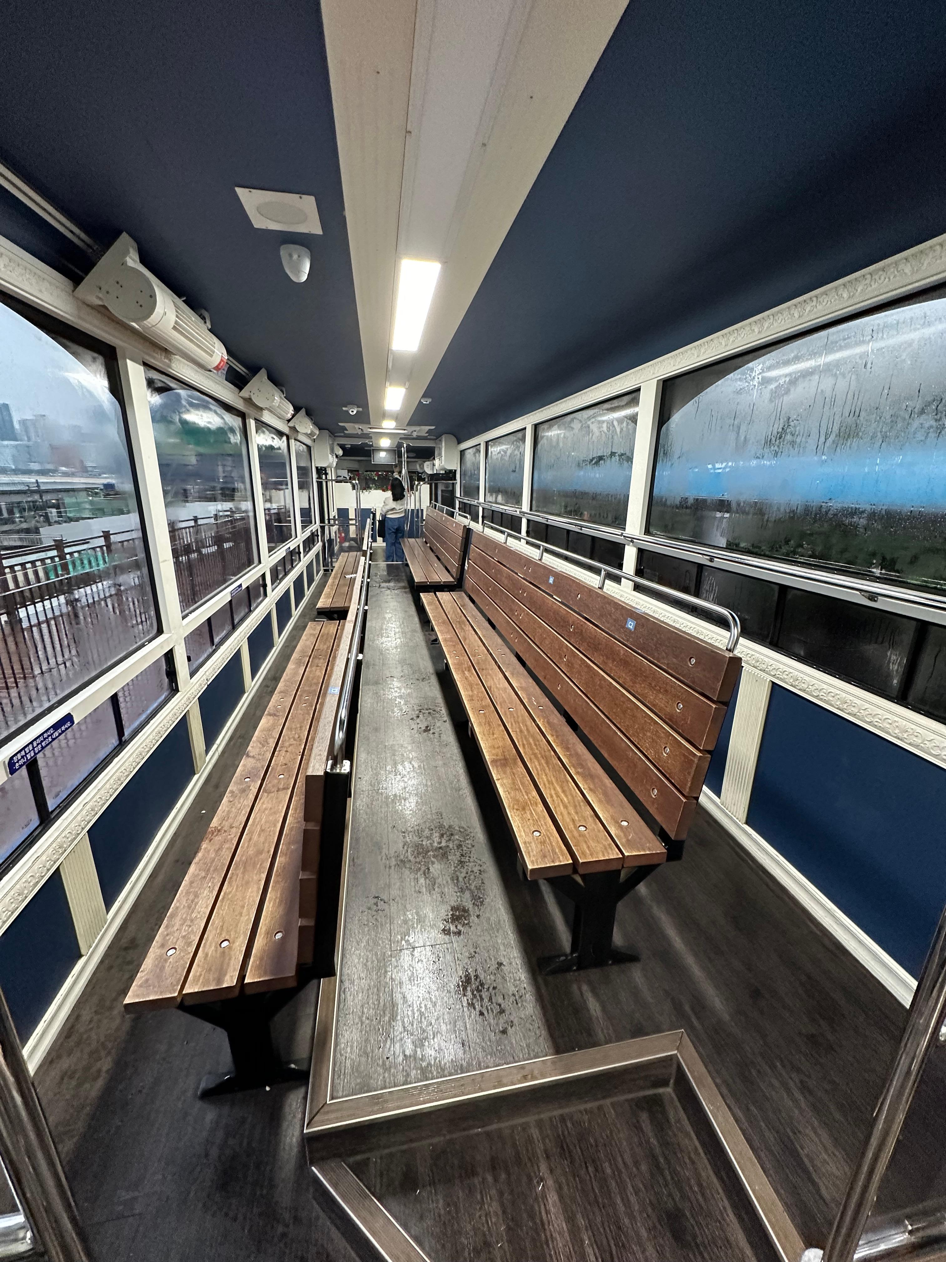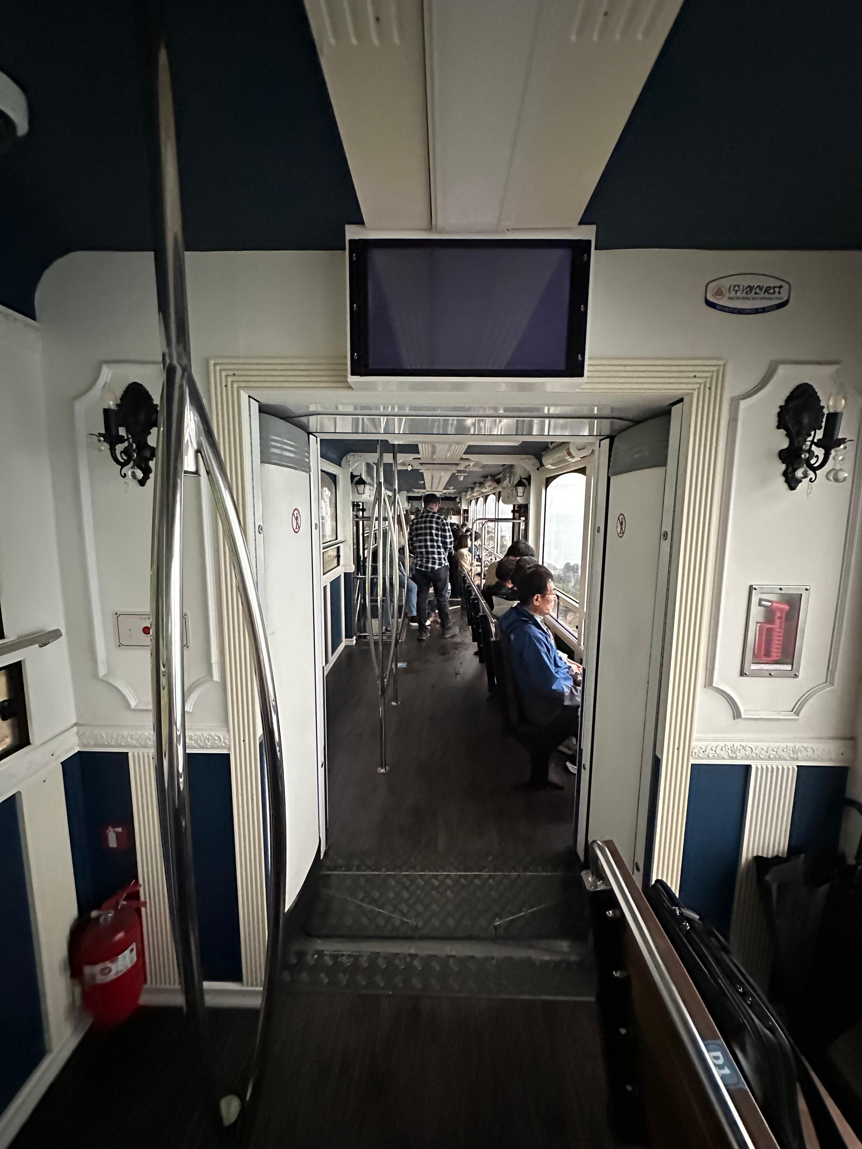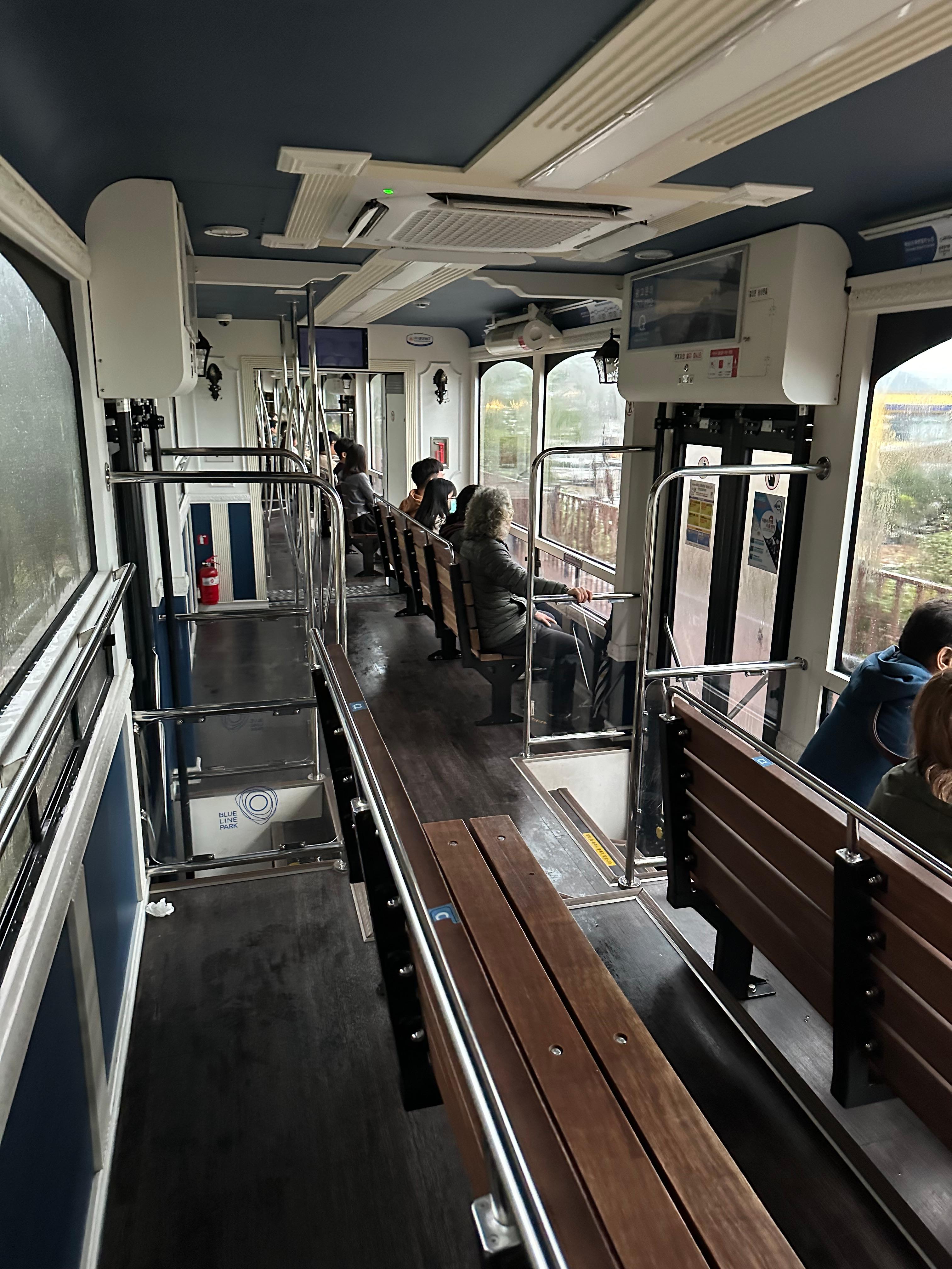 마지막으로 제가 앉았던 자리인데요. 탑승 20분전에 현장에서 발권했지만 운이 좋았는데 기다림 없이 바로 대기라인에 줄서서 앉았는데요. 보통 좌석은 1층과 2층석으로 되어있고 긴 좌석형태라 움직일 수 없었는데요 해변열차가 연결되는 칸 바로 앞에는 3-4명정도만 앚을 수 있는 좌석이 있습니다. 그래서 여기 앉으면 좀 더 자유롭게 입석으로도 다닐수있고 비교적 자유롭게 돌아다닐 수 있었던 좌석입니다.