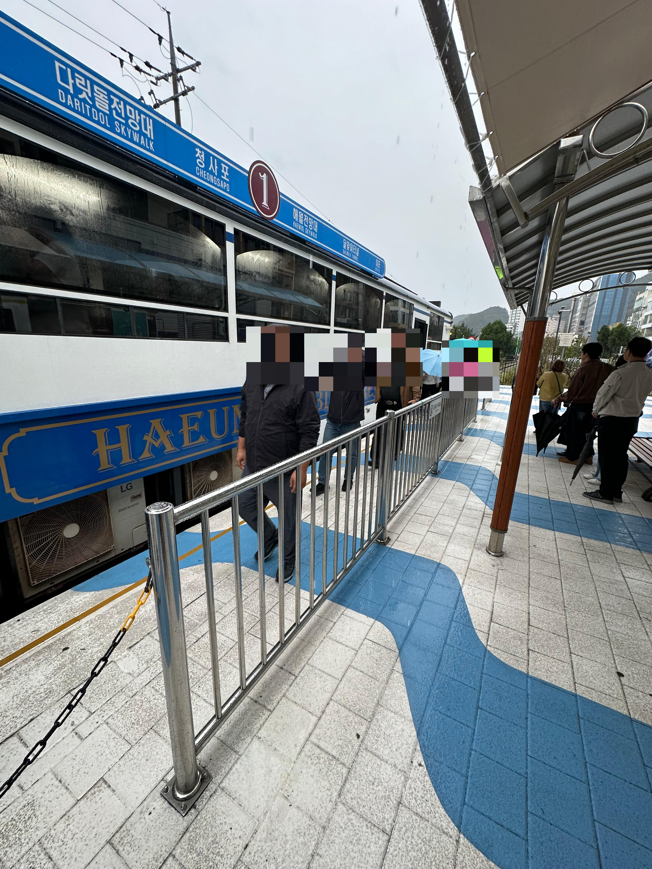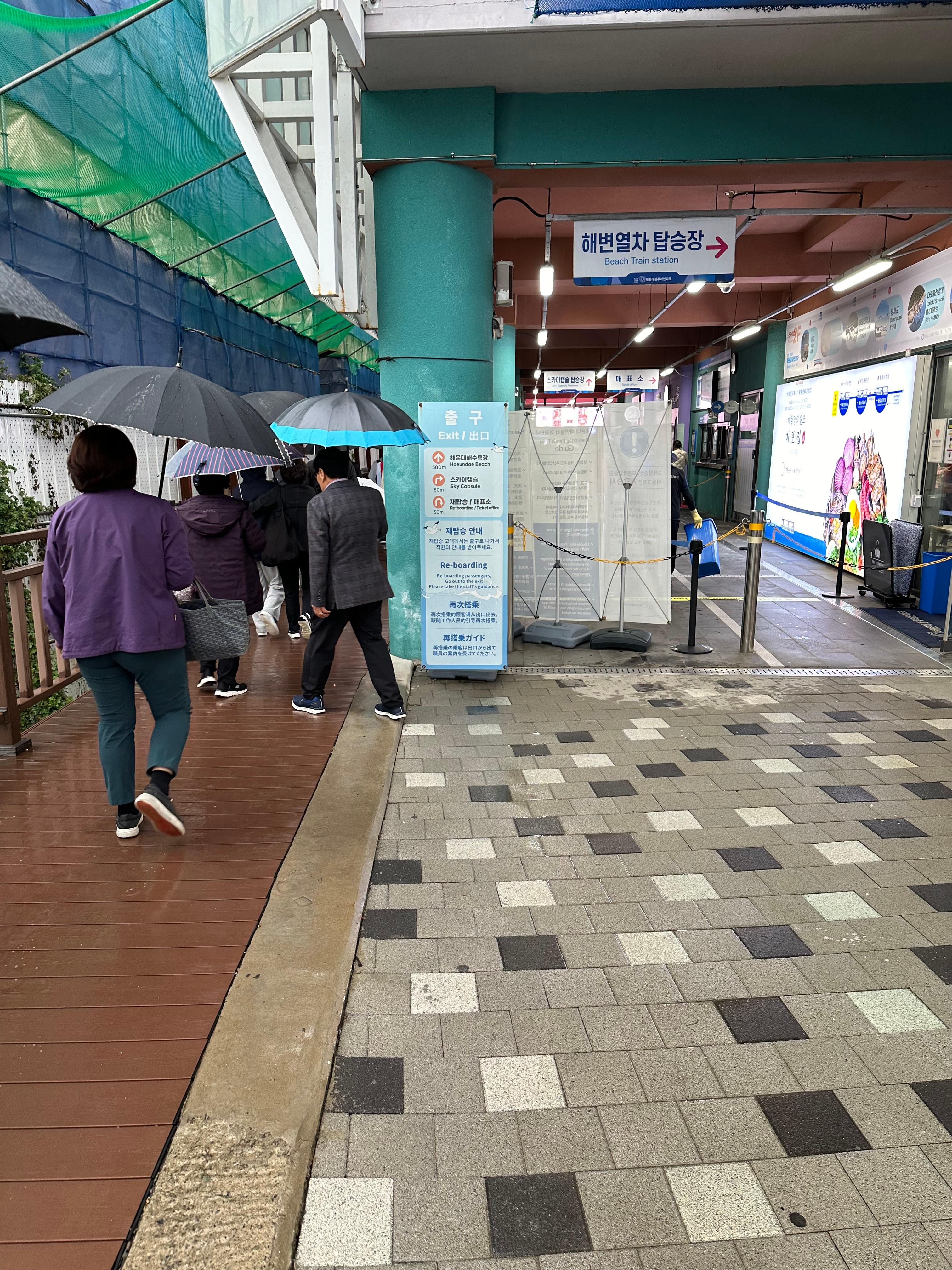 블루라인파크 해변열차를 타고 미포정거장에 도착했을 때도 여전히 비가 내리고 있었습니다. 특히 해운대에 가니까 바람까지 거세게 부는 것을 느꼈는데요. 송정해수욕장에서는 느끼지 못했던 바람이 해운대에서 세게 부는데 본격적으로 비가 거세게 내리는건지 알 수 없었습니다. 비가 오는 해운대 미포정거장에는 사람들이 우산을 쓰고 해변열차를 타기 위해 기다리는 모습을 볼 수 있었습니다.