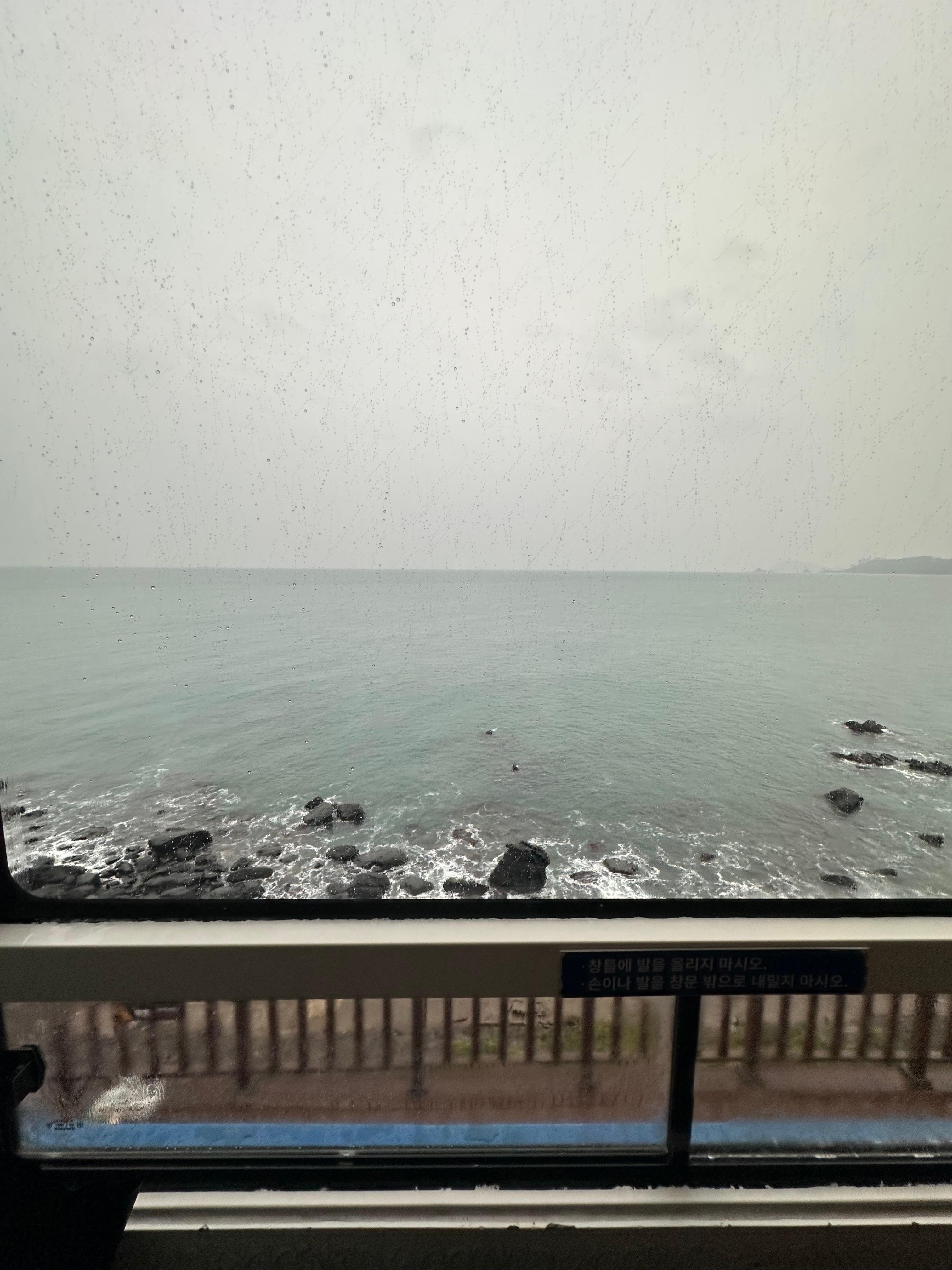 16시 12분에 탑승한 해운대 블루라인파크 해변열차는 비오는 송정 해수욕장을 출발하여 구덕포와 다릿돌전망대 정거장을 지나서 청사포로 향해 가고 있었습니다. 해동용궁사에서는 비를 맞아가면서 다닐 수 있었는데요. 시간이 지나 오후 시간대에는 비가 좀 더 거세게 내리는 것을 볼 수 있었습니다.