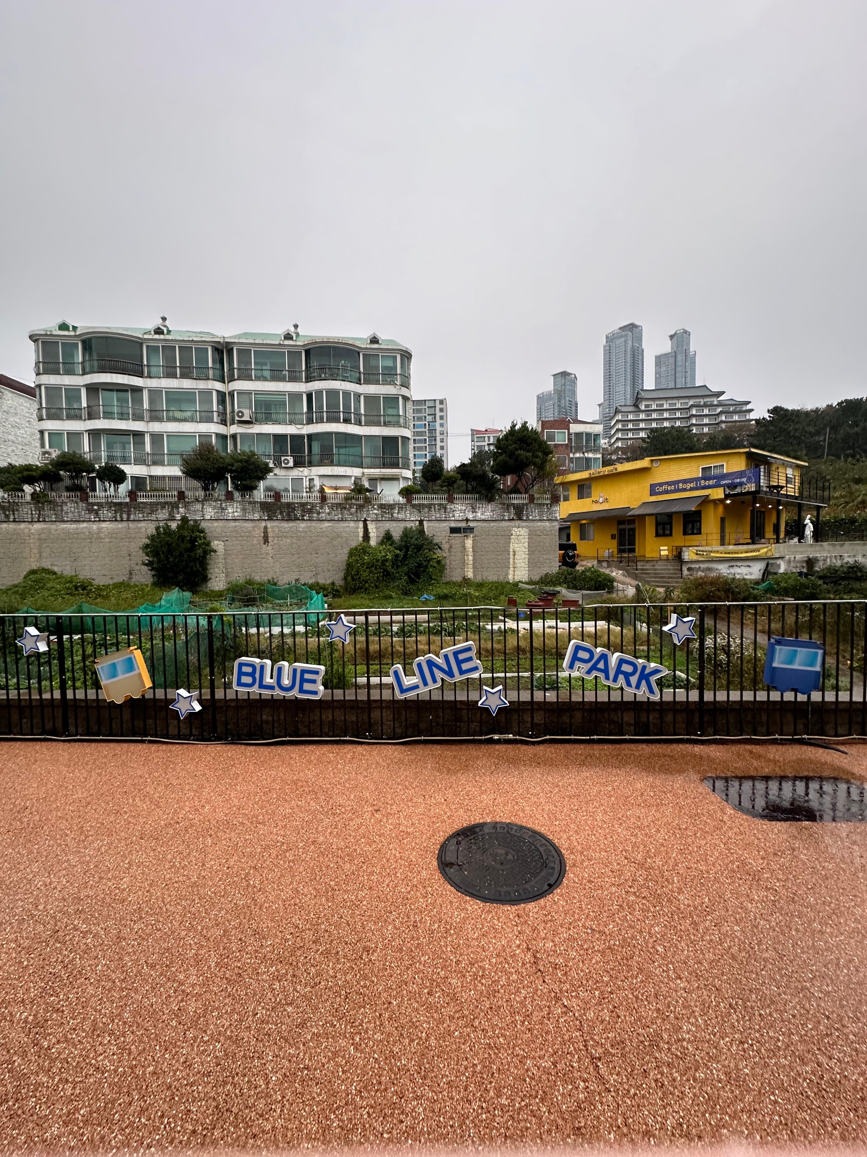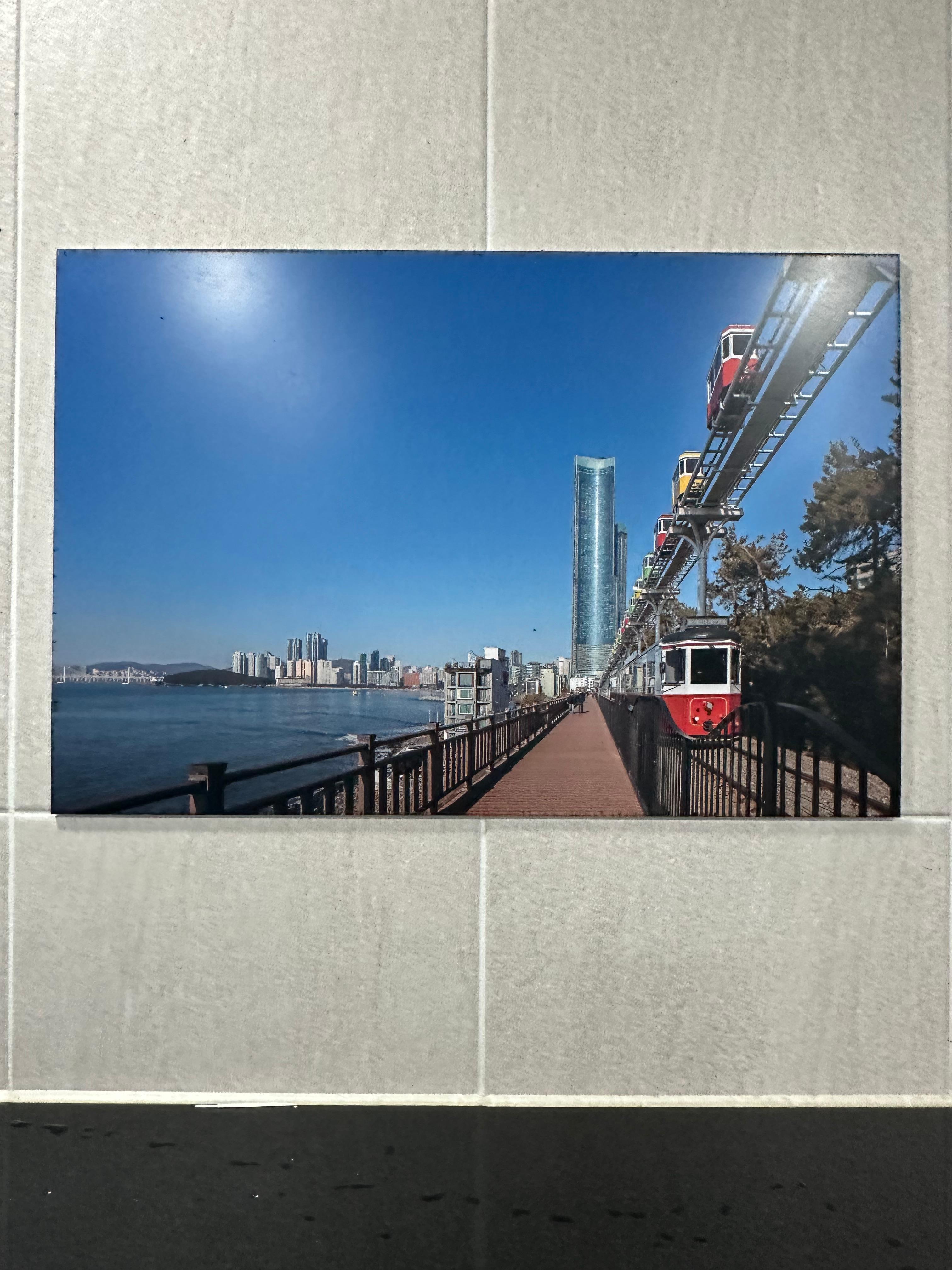 해운대 블루라인파크 미포정거장 화장실에서 발견한 그림이었는데요. 특히 블루라인파크 미포정거장을 기준으로 위로는 스카이 캡슈과 아래로는 노면전차 해변열차가 다니는 모습이 인상적입니다. 블루라인파크 뒤편으로 높은 건물과 해운대의 바다도 인상적이었습니다. 그 외에 해운대와 그 주변 일몰이 정말 아름다웠습니다.