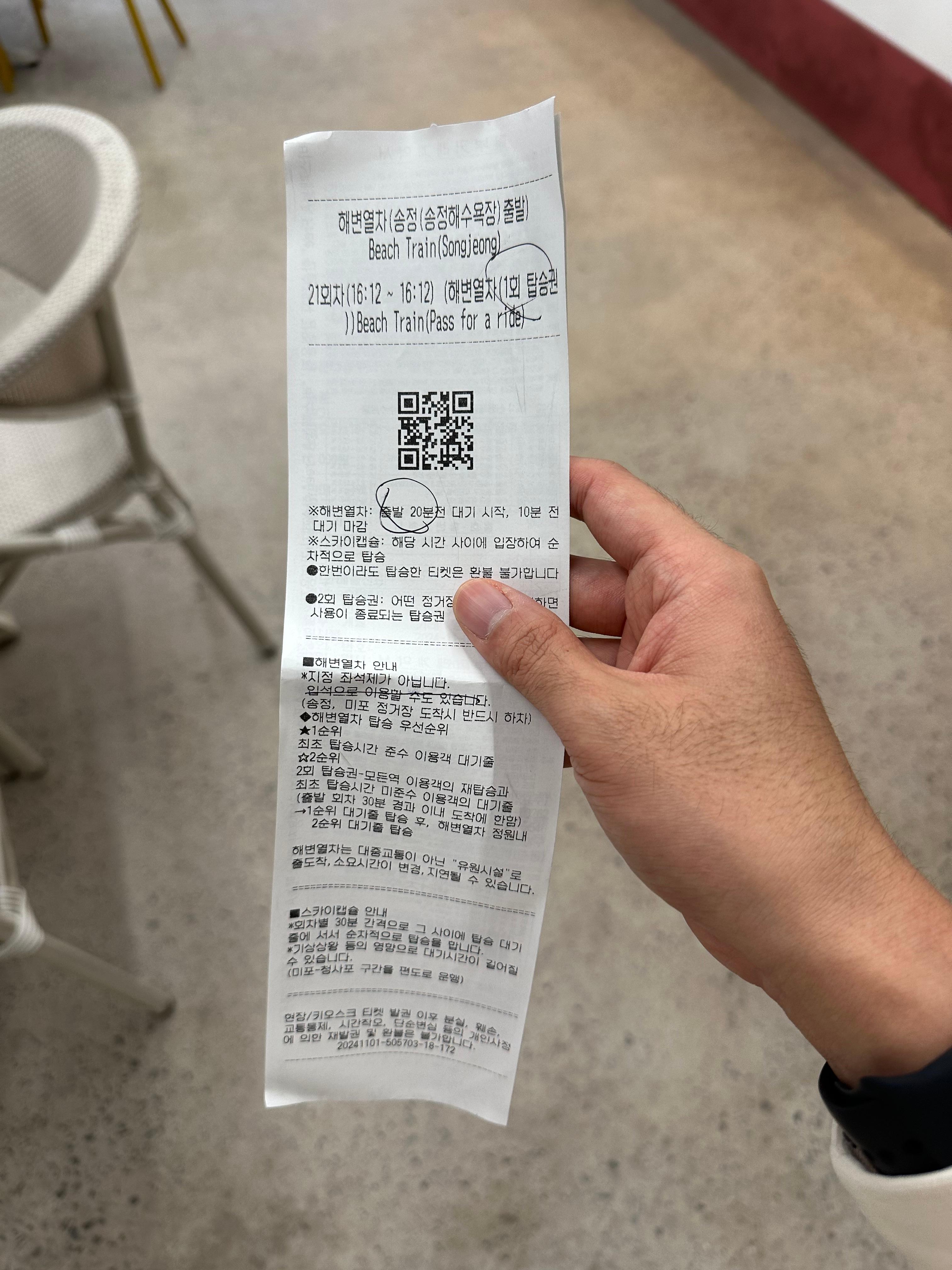 해운대 블루라인파크 해변열차 티켓입니다. 모바일로도 예약할 수 있는데요. 특히 성수기와 공휴일은 인기많으니 인터넷으로 사전 예약 추천합니다. 저는 금요일이고 비도 오고하니까 인터넷 예약 안했음에도 불구하고 송정역에서 해운대까지 티켓을 구했습니다. 물론 종이티켓이었구요. 종이티켓 위에는 바코드가 있어서 바코드로 탑승여부를 체크합니다. 종이티켓이라 그런가 먼저 줄서있는사람을 제치고 일등으로 탔습니다.