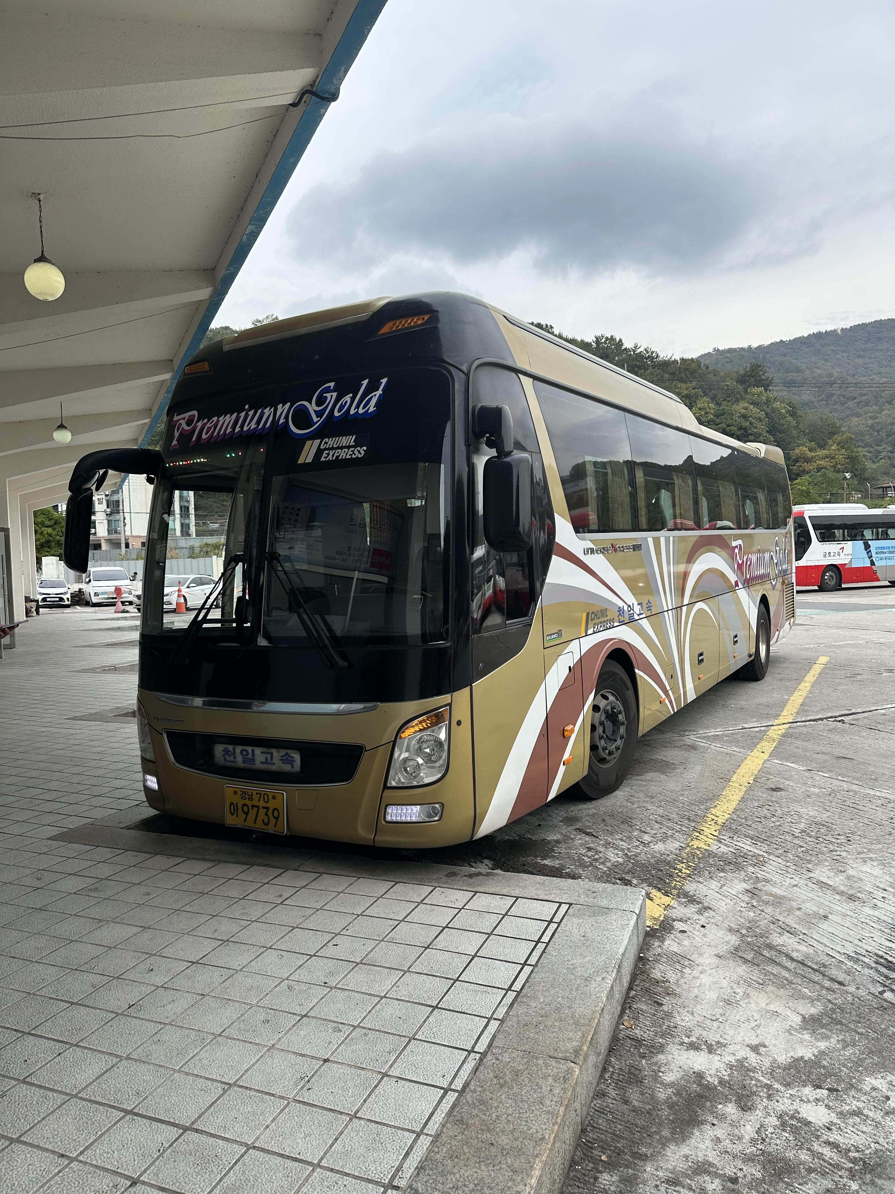 제가 타고 가게되는 서울 센트럴 시티까지 가는 천일고속 프리미엄 버스입니다. 이름도 프리미엄처럼 버스도 정말 고급 럭셔리 자체였습니다. 만약 프리미엄버스 색상이 골드색이 아니고 다른 버스처럼 하얀색이었다면 어땠을까요? 전 별로 생각하고 싶지 않았습니다.