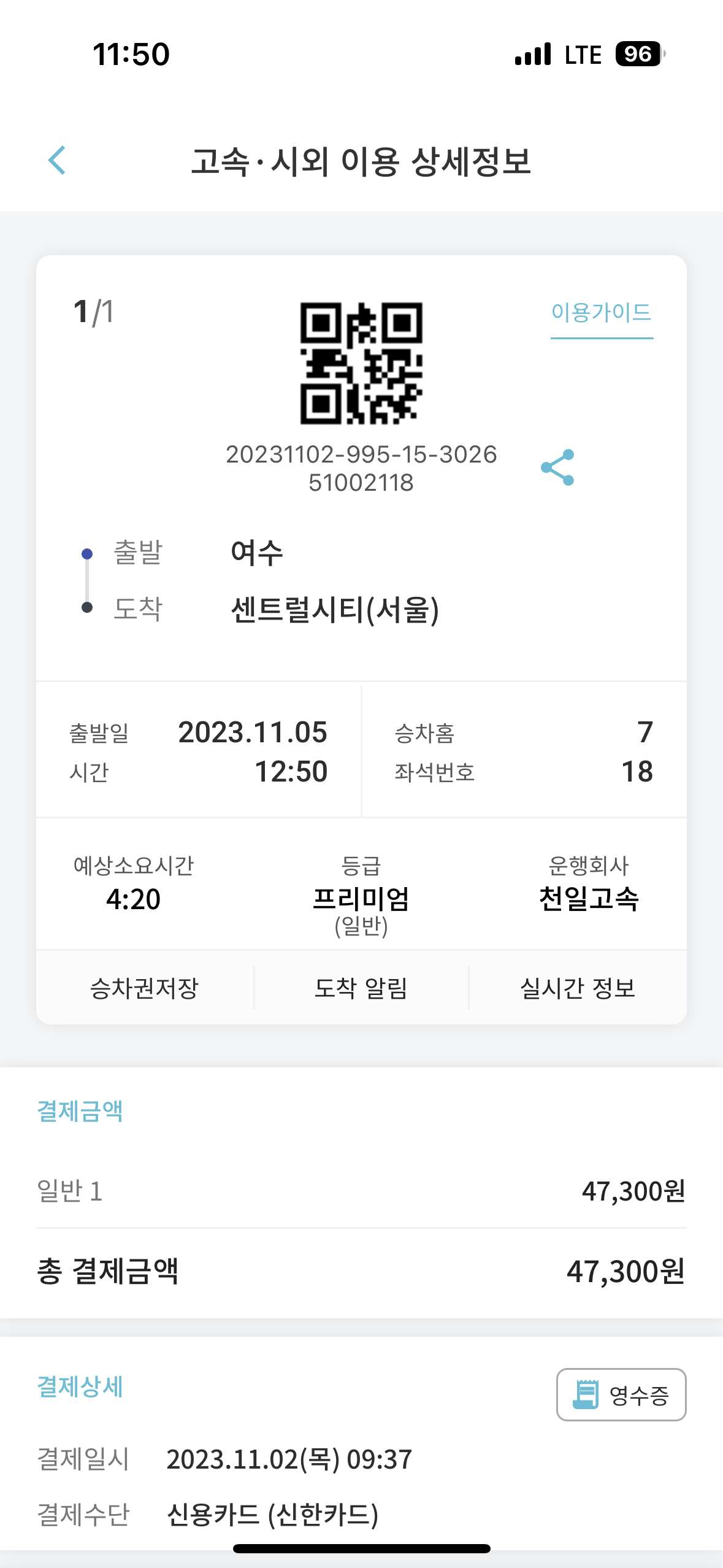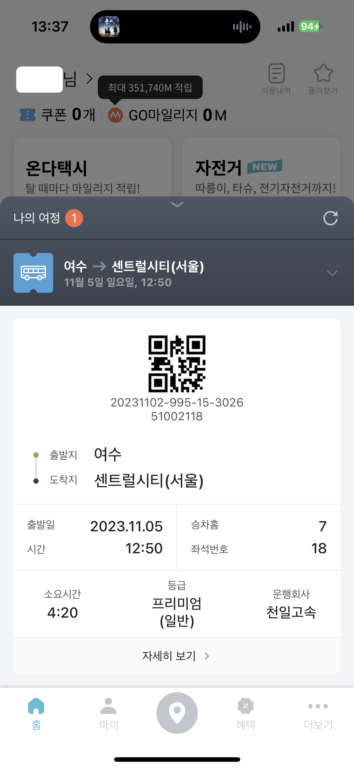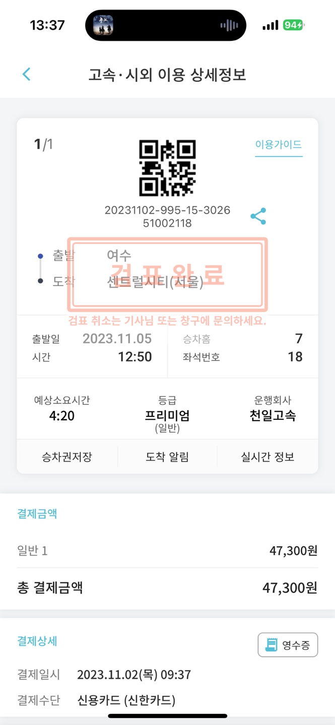모바일 티켓을 열먼 QR코드 보이죠? 이 큐알 코드를 버스 탑승할 때 기계에 인식을 하면 몇번 자리에 앉으라면서 안내하게 됩니다. 사진에는 없지만 버스 맨 앞에는 모니터가 있습니다. 큐알 코드를 찍으면 모니터내에 체크인 했다고 표시도 함께 나타나게 됩니다.