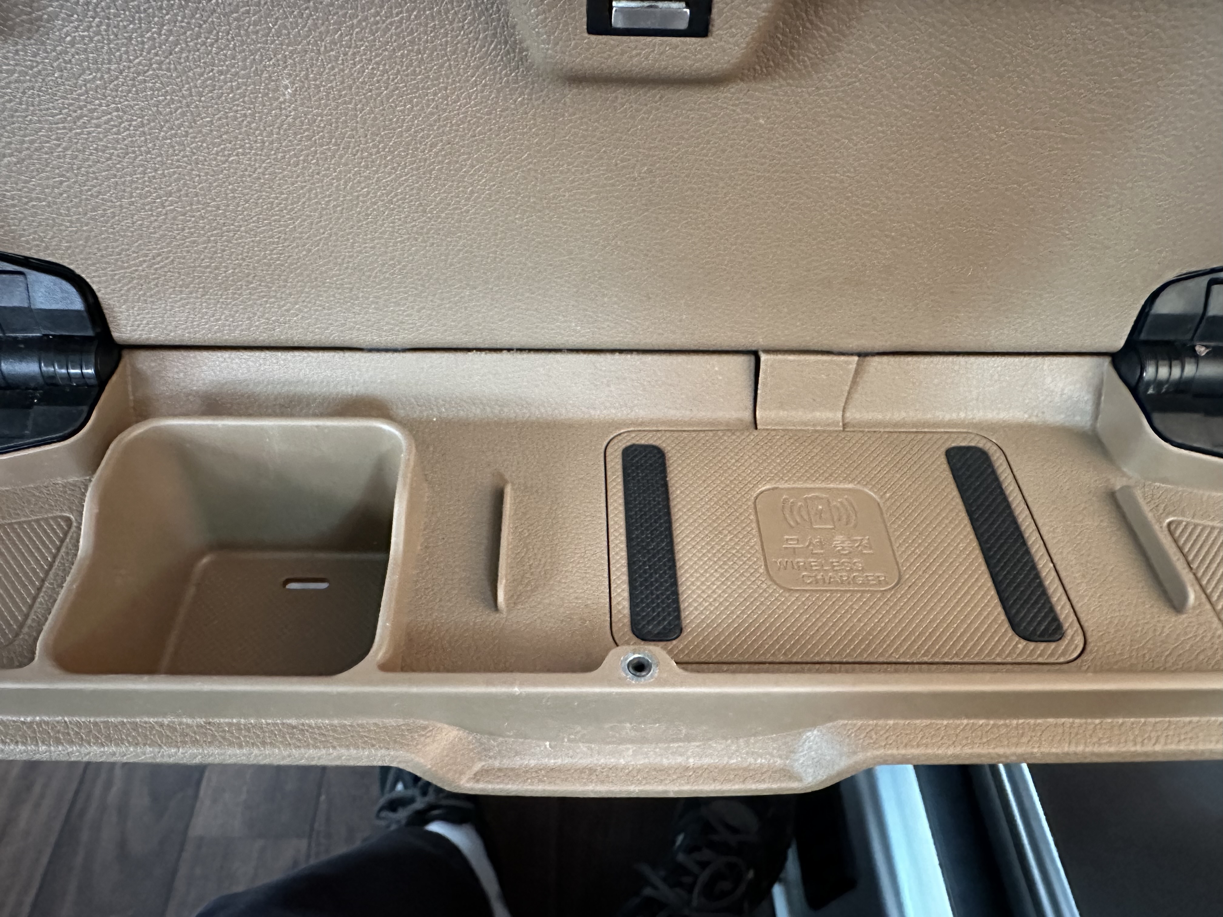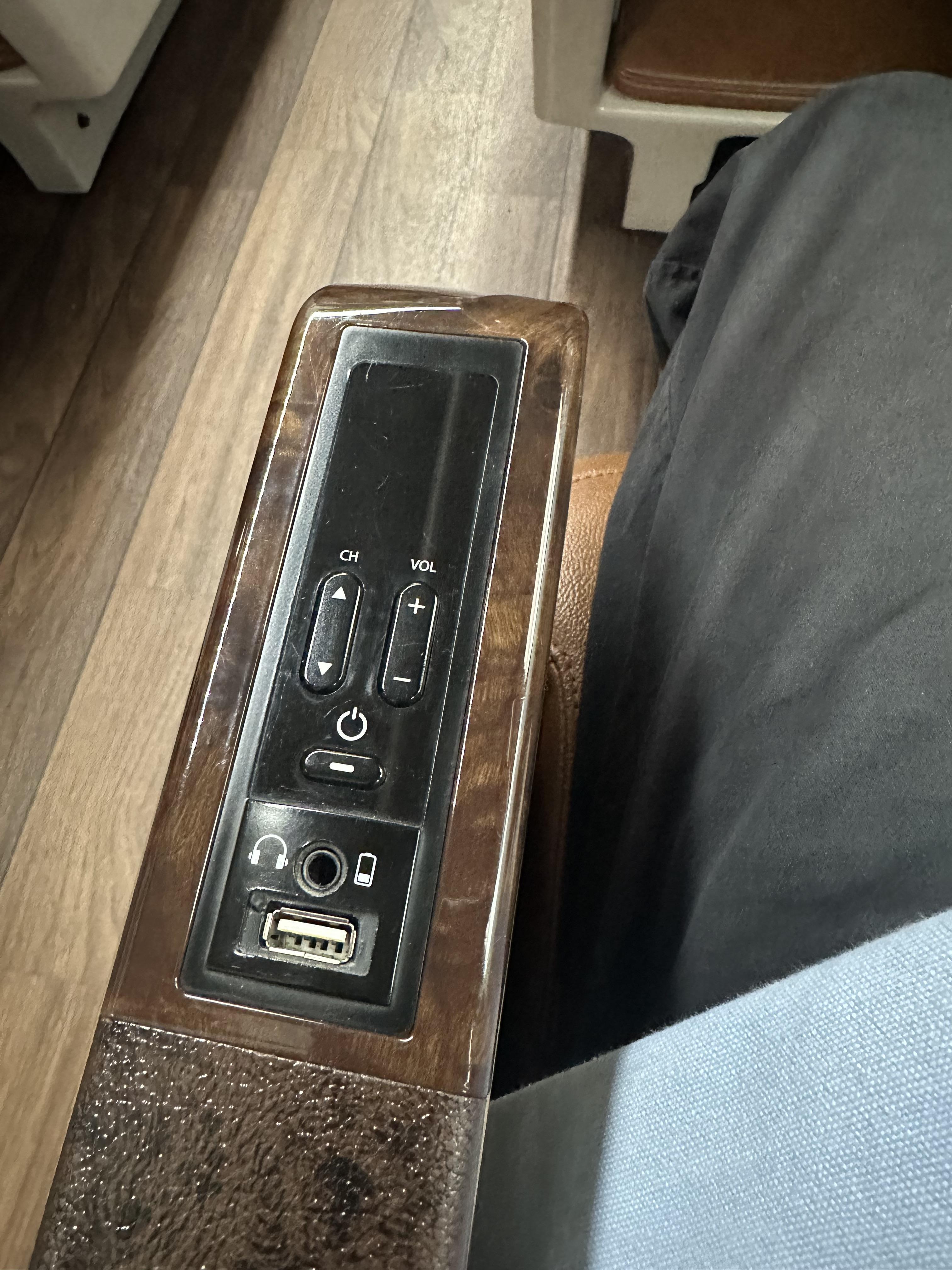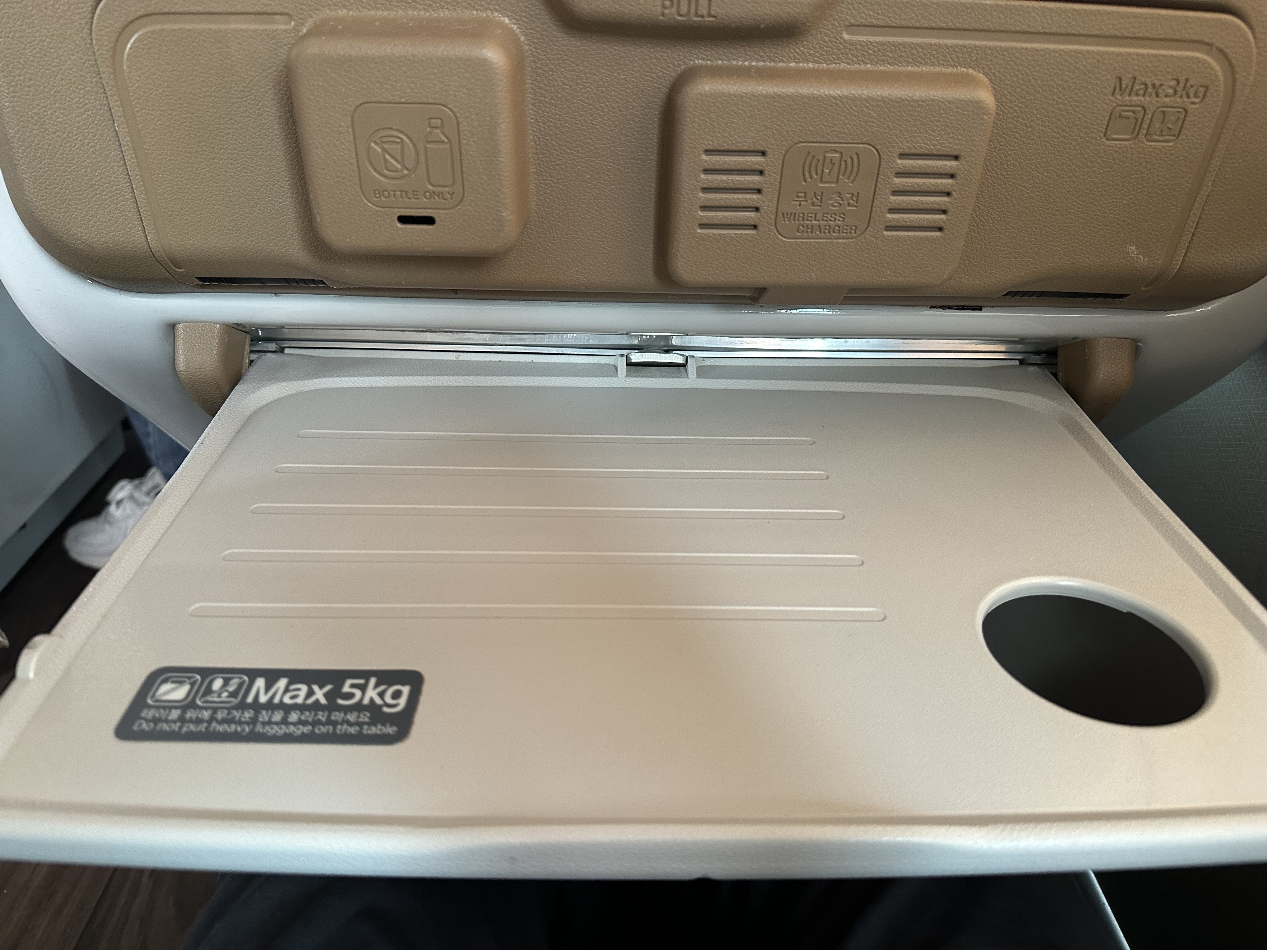 좌석 앞에는 모니터가 있습니다. 모니터 아래 PULL 이라고 보이는 것을 당기면 음료를 걸어놓을 수 있는 컵받침과 무선충전할 수 있습니다. USB 케이블이 있으신 분은 케이블을 통해서도 충전 할 수 있습니다.