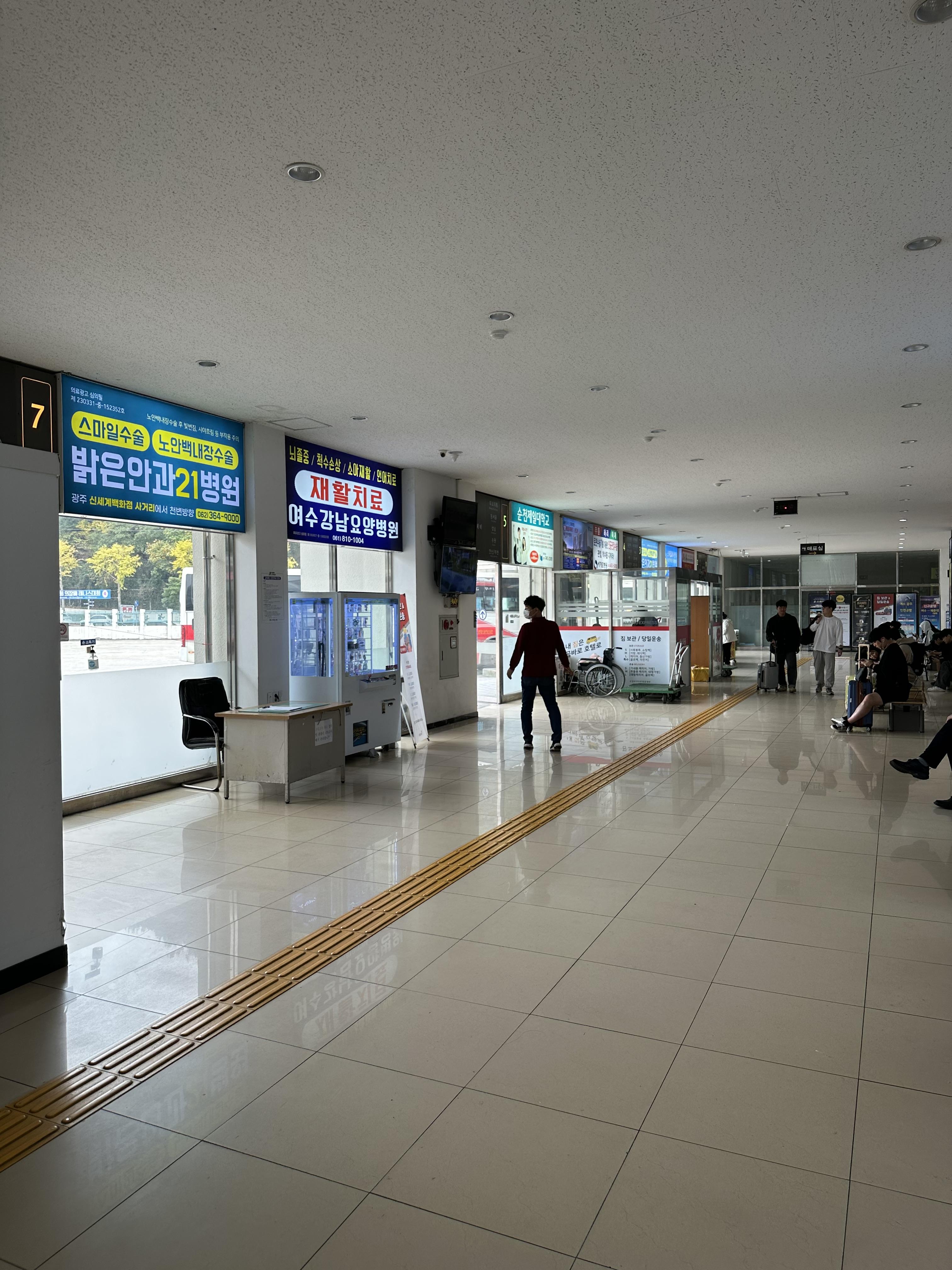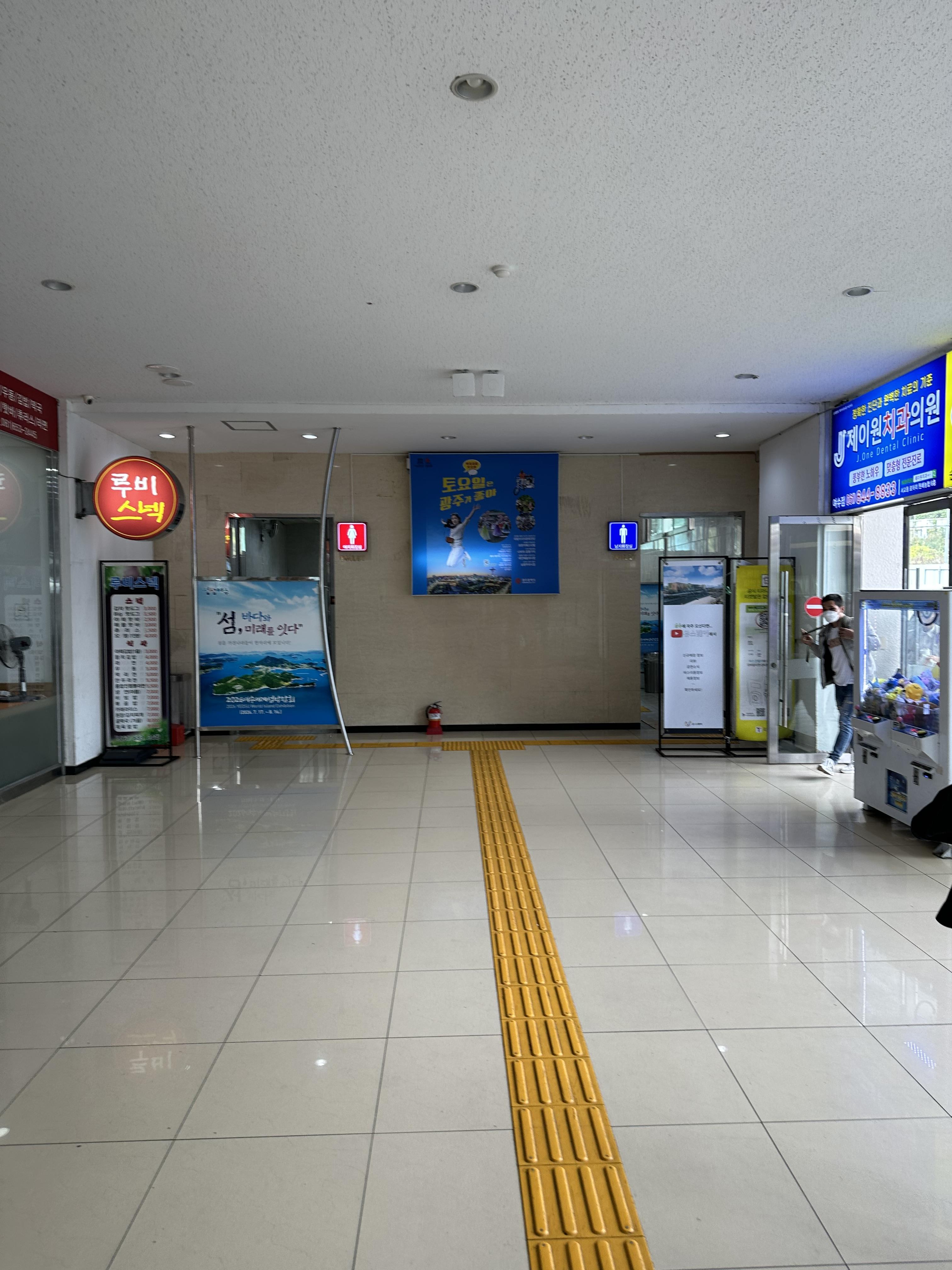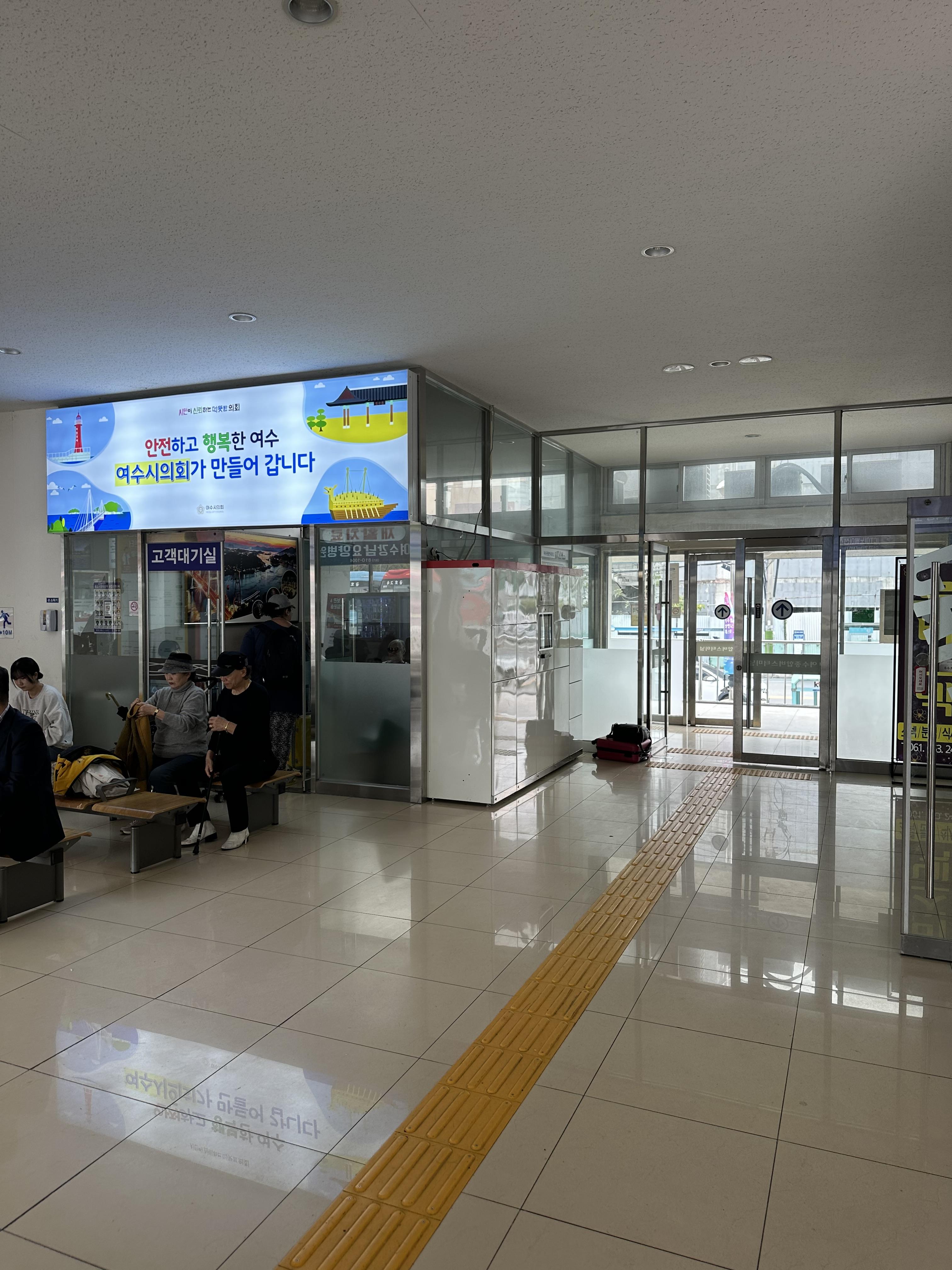 여수 터미널은 서울, 대전, 대구, 광주, 부산에 있는 지방터미널보다는 넓지 않고 작은 편이에요. 그러나 그래도 터미널로서 갖추어야 할 시설은 모두 갖추었습니다. 편의점과 식당 휴게공간은 갖추어져있습니다.