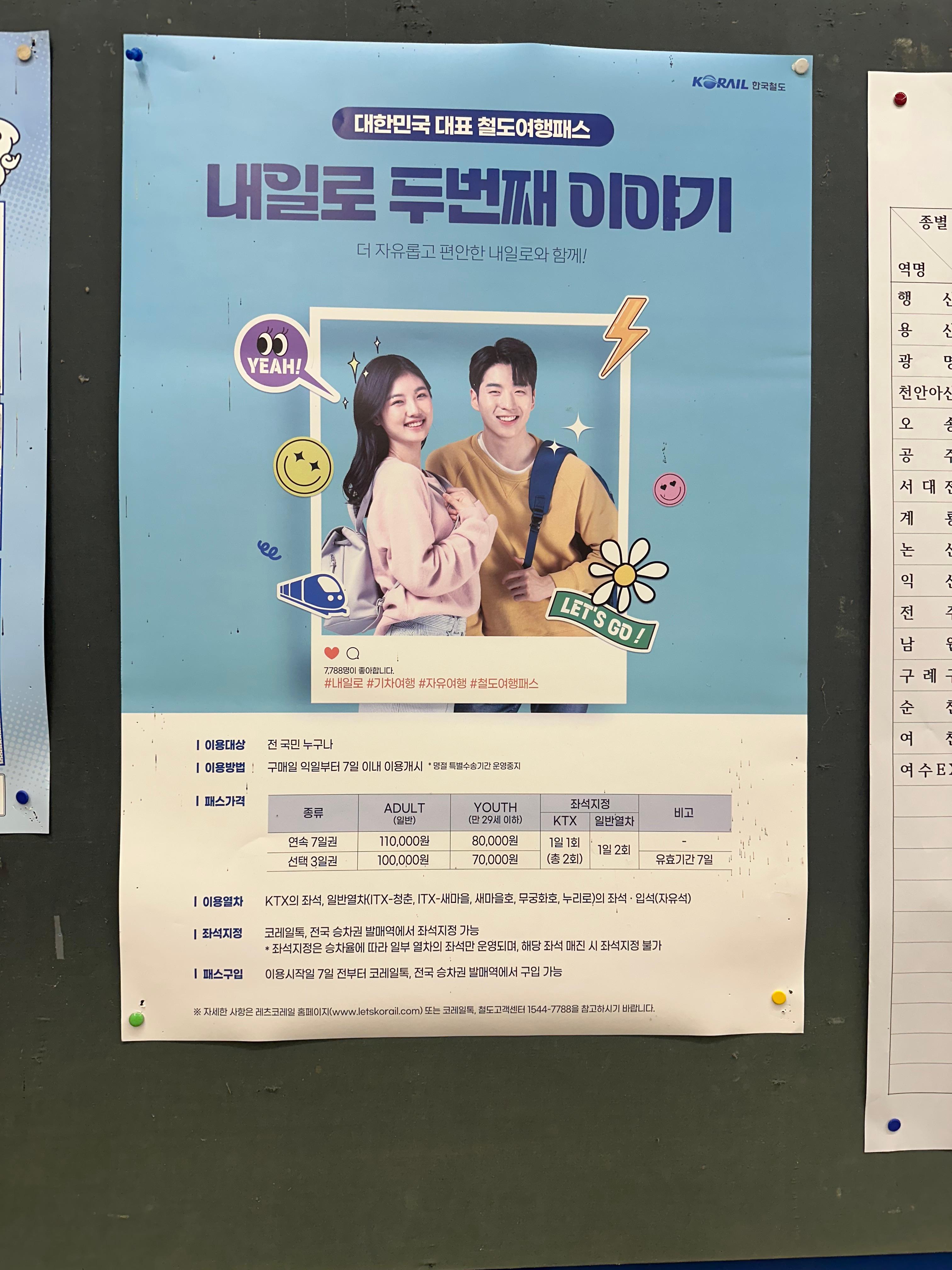 제가 포스팅하면서 전해드렸던 내일로 기차여행에 대한 것도 볼 수 있었는데요. 10년이 지난 지금도 여전히 내일로는 폐지 되지 않고 있었습니다. 다만 10년전 내일로 가격이 지금은 인상 된 것을 볼 수 있는데요. 10년전에는 5만원 가격으로 일주일동안 입석으로 무제한 이용할 수 있었지만 지금은 나이제한을 줄여서 청년이 아니더라도 이용 할 수 있습니다. 가격도 당시 5만원에서 3일권과 7일권으로 해서 7만원대부터 시작되는 것을 볼 수 있습니다. 가격이 오른만큼 KTX와 일반열차도 1일 2회에 한하여 좌석을 지정할 수 있었습니다. 제가 10년전만 하더라도 좌석 지정없이 오로지 입석이고 KTX는 타지 못했는데요. 과거 RDC 무궁화호를 포함하여 노후화된 열차 폐지 등으로 영향도 받는 것 같습니다.