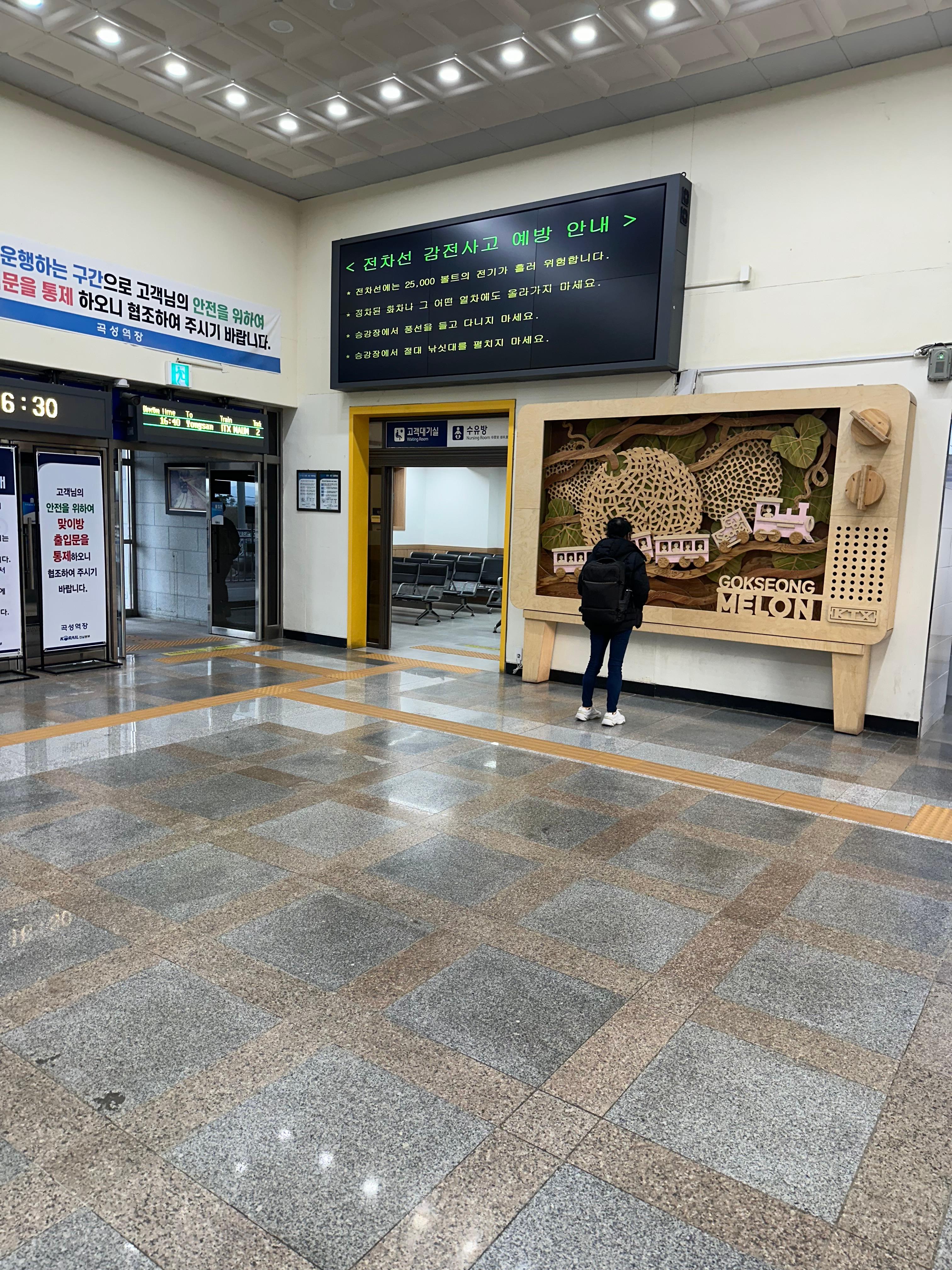 순천과 여수, 익산과 서울로 가는 일부 승객들의 모습을 볼 수 있었습니다. 곡성역은 사람이 많지 않다보니 작은 간이역 느낌인데요. 그래서 구 곡성역보다는 넓은 느낌이었습니다. 기차마을로 유명한 곡성역이다보니 곡성역 대합실에서도 기차 풍경을 볼 수 있었습니다. 곡성역도 유일하게 선로를 횡단할 수 있는 역사인데요.