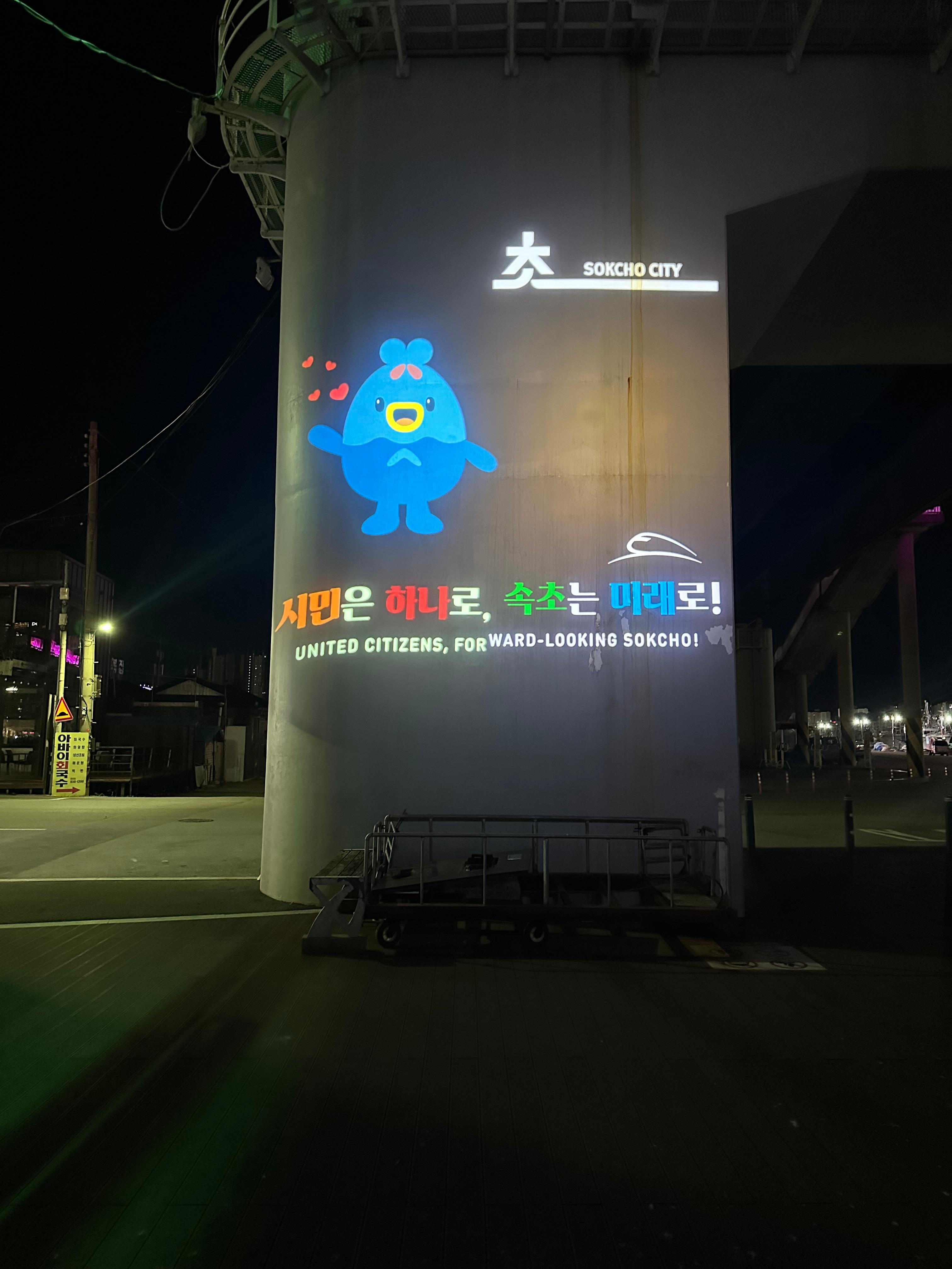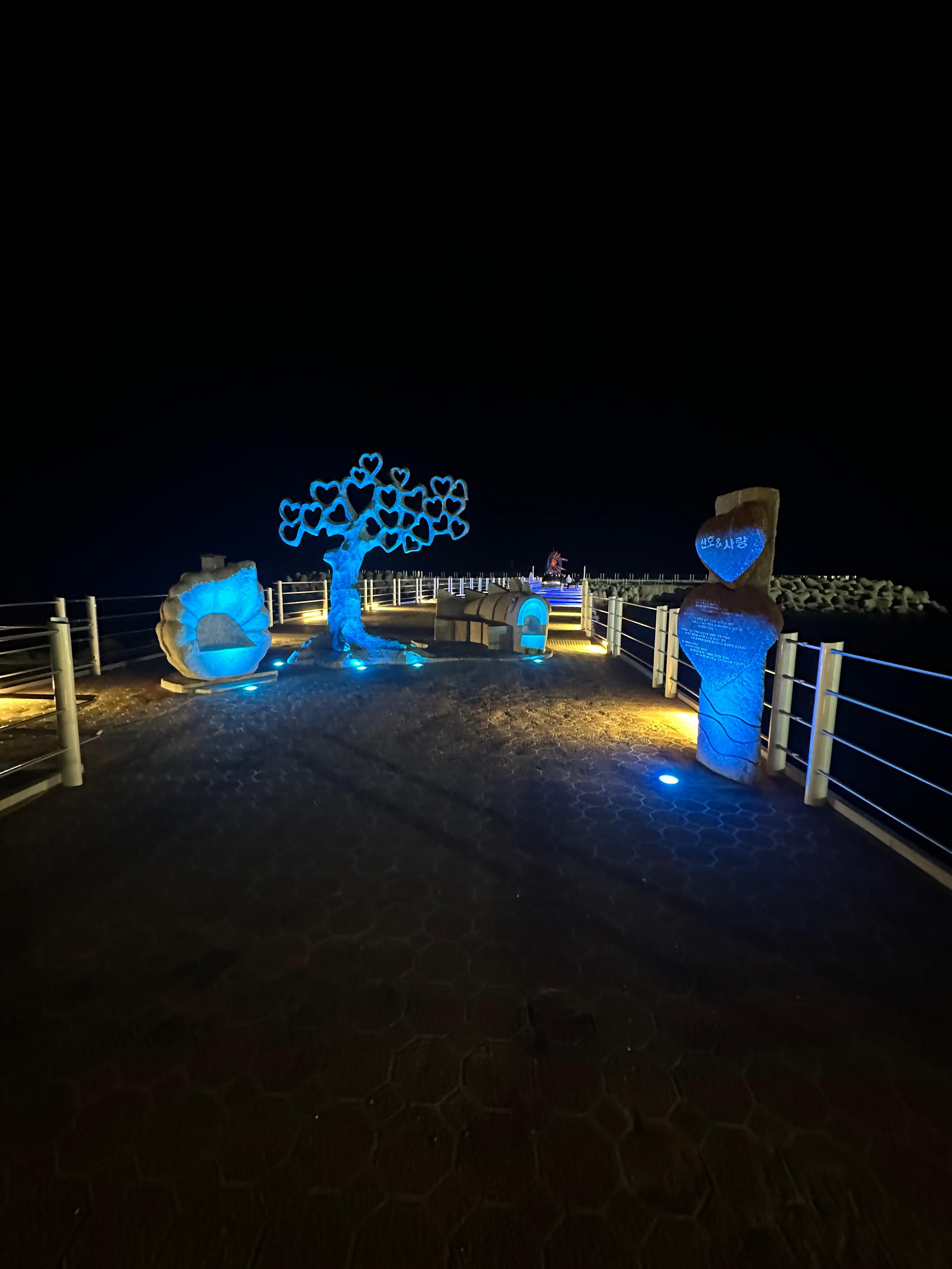 전부다 반짝반짝 거리고 밤에는 멋진 야경을 볼 수 있는 곳으로 변했는데요. 특히 속초 해수욕장 근처에는 대관람차까지 생겨서 놀이동산을 보는 듯했습니다. 방파제 안쪽으로 가는길에는 다양한 조형물과 함께 야간에도 멋지게 볼 수 있도록 조형물 주위로 야간 불빛을 이용해서 방파제 주변을 멋지게 볼 수 있도록 되어있습니다.