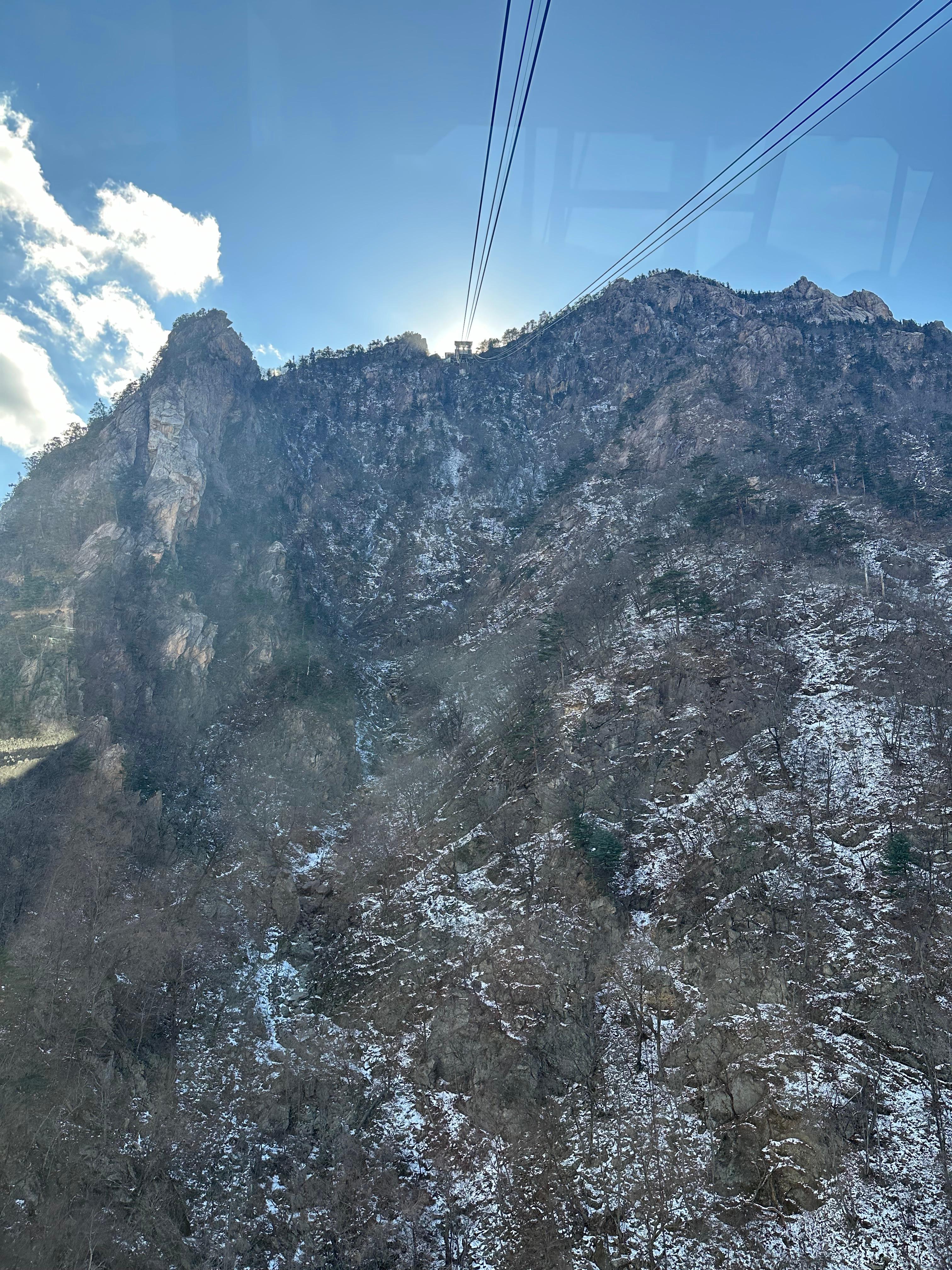 설악케이블카에 탑승해서 설악산 권금성으로 올라가기 시작했습니다. 늦게까지 지속되는 여름과 가을이 이어졌던 2024년 11월의 마지막이었는데요. 가을과 늦은 더위가 지속되었지만 강원도 속초라 그런지 케이블카를 타고 올라가는데 설악산 바위 위에는 눈이 쌓여있는 것을 볼 수있습니다.