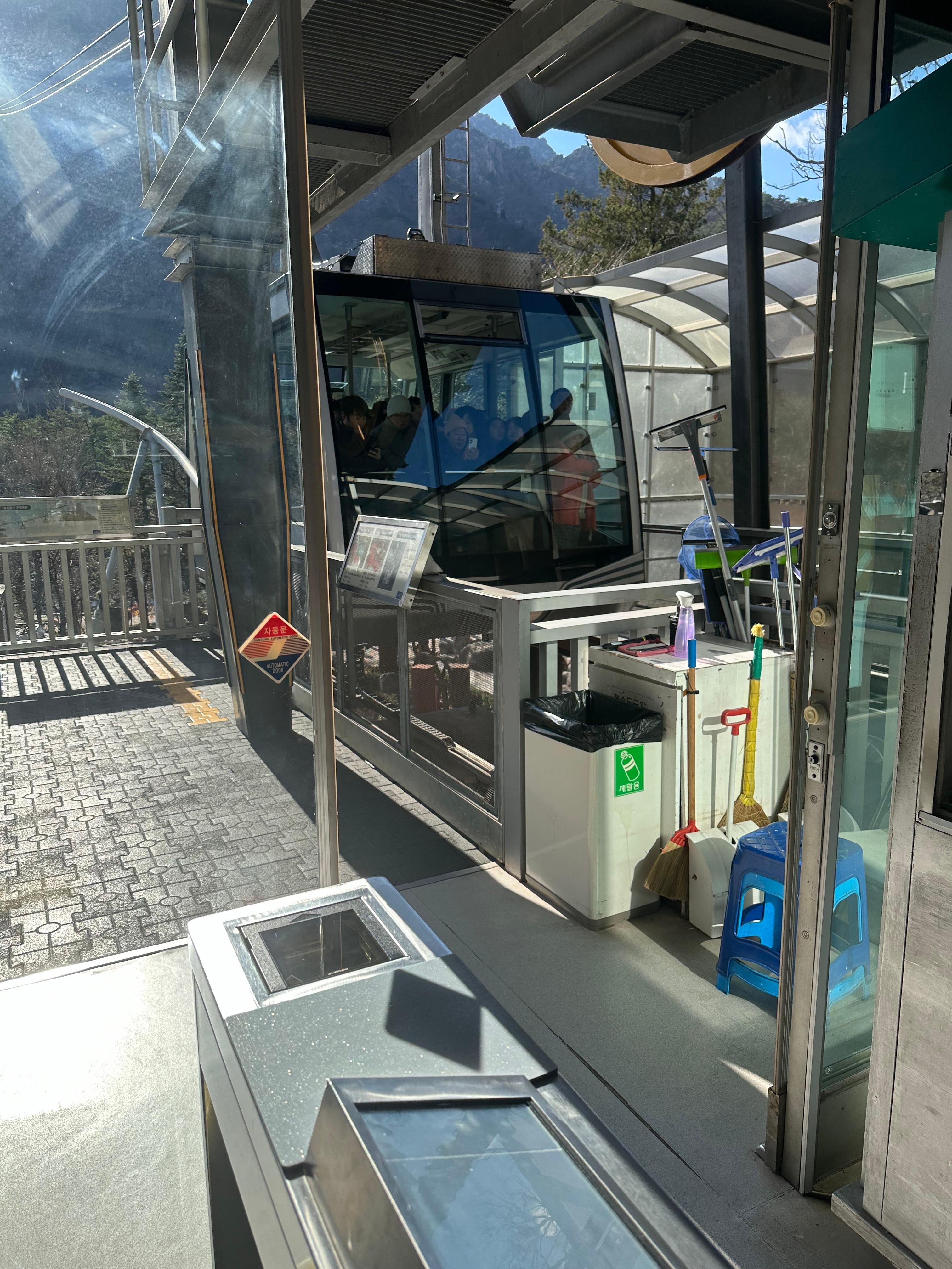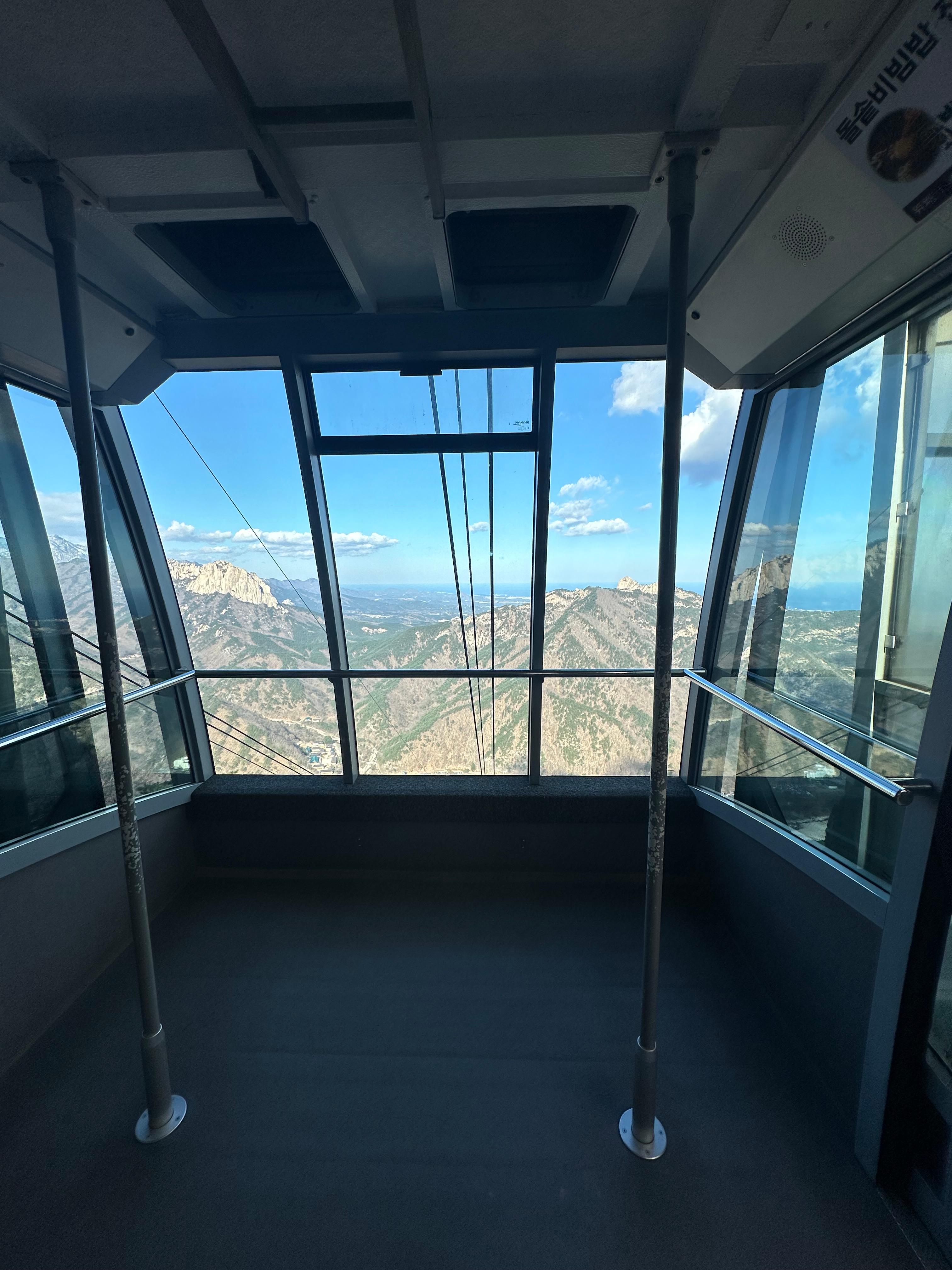 설악케이블카는 하부정류장에서 권금성 상부정류장까지 약 10분이 조금 안되는 소요시간이 걸려 도착했습니다. 기존 케이블카와는 다르게 단체 탑승이 가능한 케빈이고 케이블카 내부를 사진찍기에는 어려움이 있었습니다. 마지막에 내리면서 케이블카를 찍었는데요. 최대 수용인원 50명이나 탑승 가능할만큼 케이블카 내부는 넓었습니다. 상부 정류장 권금성에 도착해서 마지막에 내리는데 설악산의 멋진 풍경들이 케이블카 내부를 통해 펼쳐졌습니다.