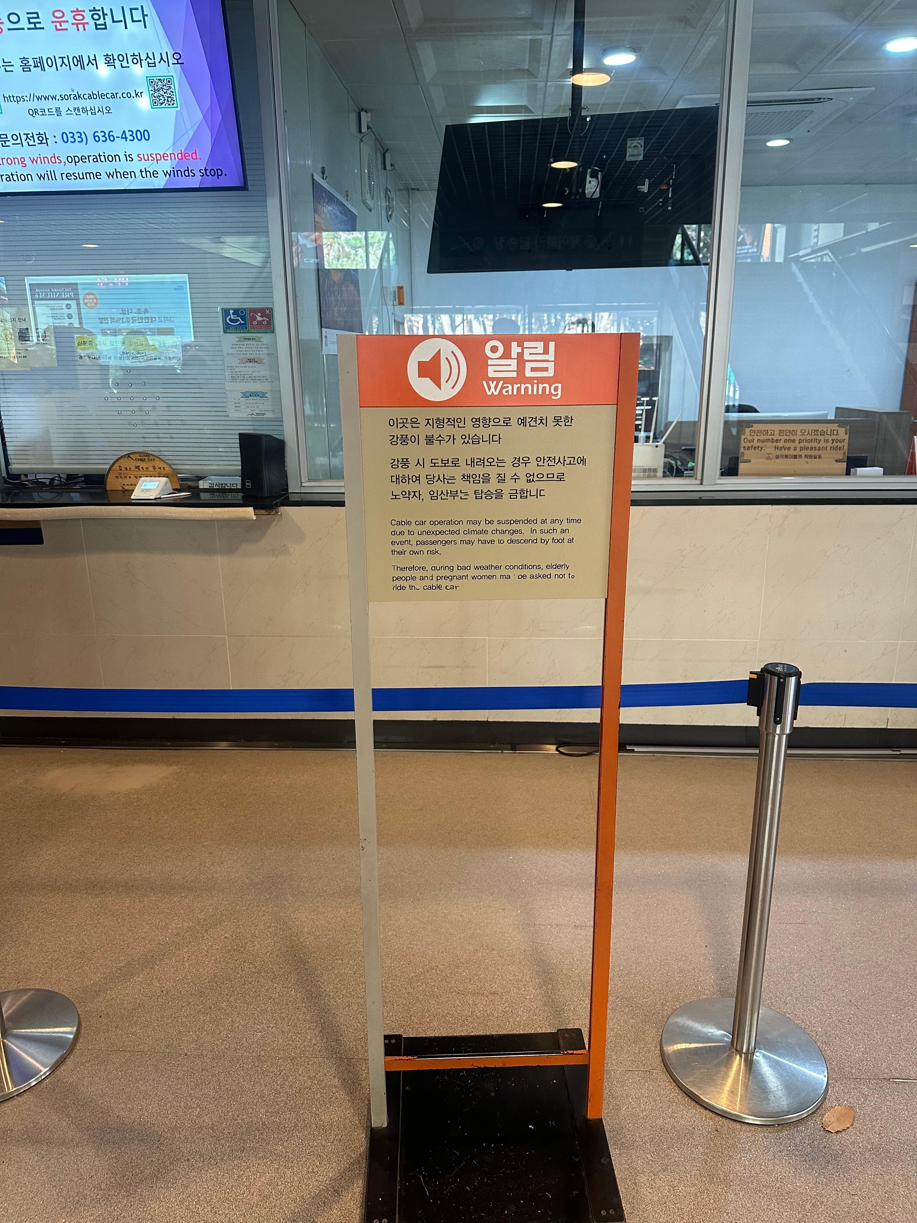 따라서 설악케이블카의 상부정류장인 권금성까지 올라갔는데 강풍이 너무 불게 되는 경우 안내방송을 통해 조기 하행을 할 수 있다고 합니다. 권금성 상부정류장에서 권금성까지는 도보로 10분정도 걸리는데요. 아무튼 설악케이블카를 타신다면 강풍 고려하셔야 합니다. 강풍이 불경우 안내방송을 통해 조기에 케이블카를 타라는 듣게 될 경우 조기 하행해야하며 늦어져서 못타고 도보로 내려와서 사고 날 경우 책임은 관광객에게 있다고 합니다.