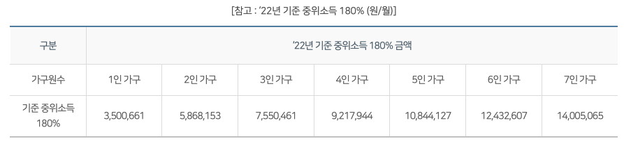 - 가구원 수에 따른 기준 중위소득 180% 이하에 해당하는 자