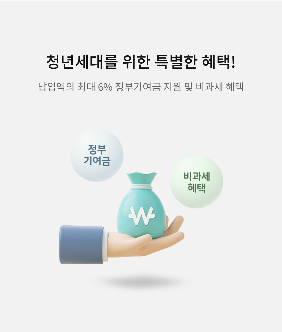 NH청년도약계좌의 특징은 청년의 중장기 자산형성 지원을 위한 정책형 금융상품으로, 만기 5년 (60개월) 동안 매월 70만원 한도 내에서 자유롭게 납입하면 매월 최대 6%의 정부기여금을 지급하고 이자소득에 대한 비과세 혜택을 제공해요.
