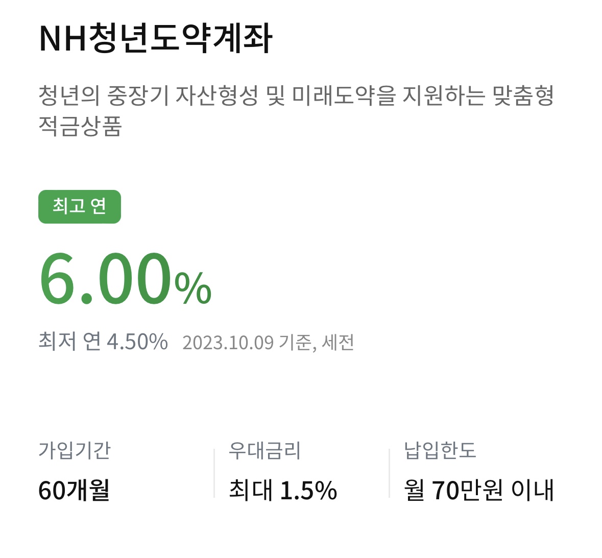해당 적금 상품은 은행 금리 뿐만 아니라 정부기여금이라는 별도의 지원금이 함께 제공되요. 더불어 청년도약계좌는 농협은행 뿐만 아니라 다른은행에서도 함께 취급되기 때문에 은행마다 우대금리 조건들이 달라요. 본인들에게 맞는 적금을 선택하셨으면 좋겠습니다.