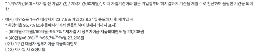 - 단 중도해지(특별중도해지) 후 해지일이 포함된 월의 기준으로 2개월 후부터 재신청 가능하며 재가입 시 정부기여금은 계약기간에서 기 가입기간만큼 차감한 비율을 제공