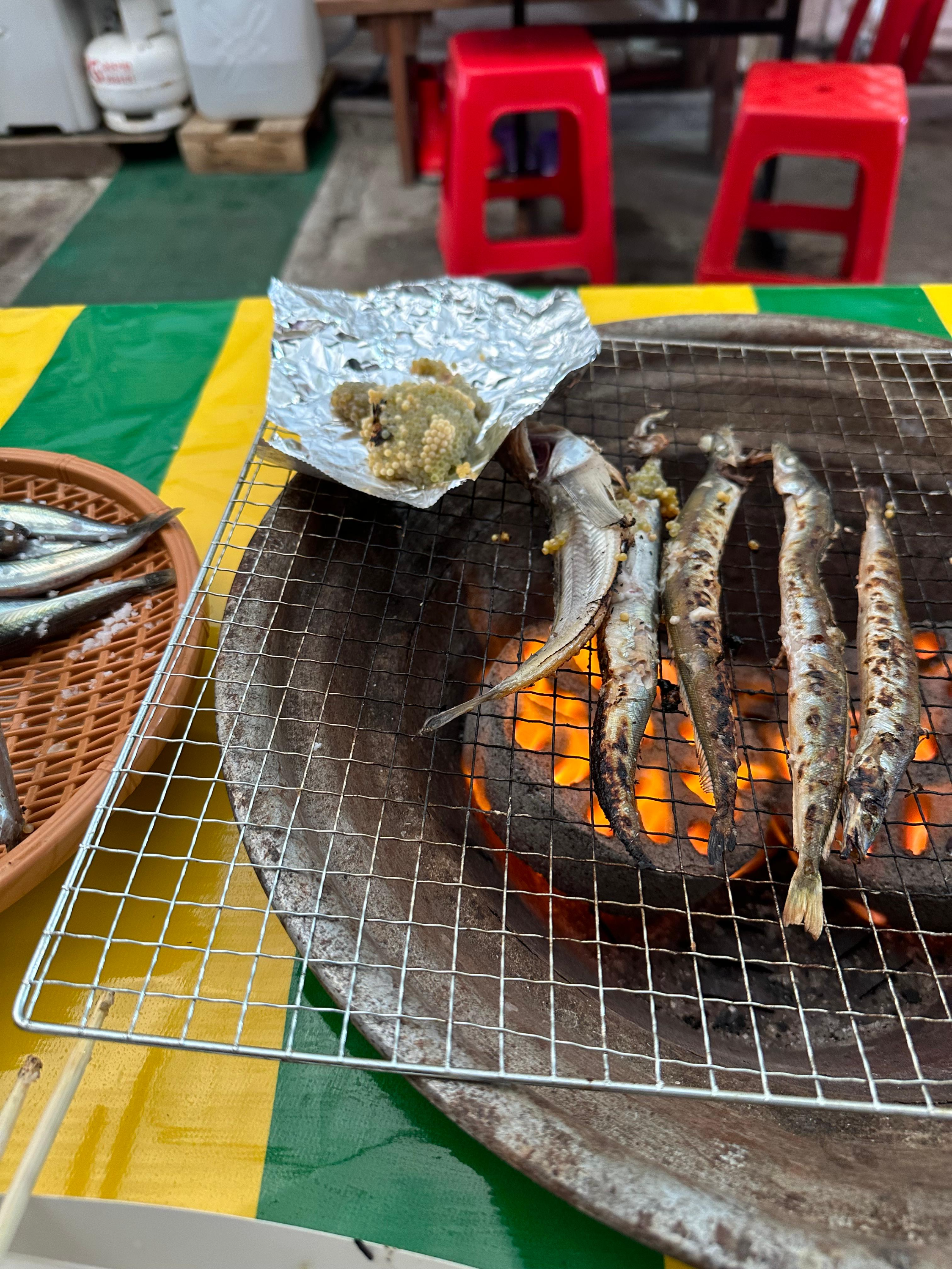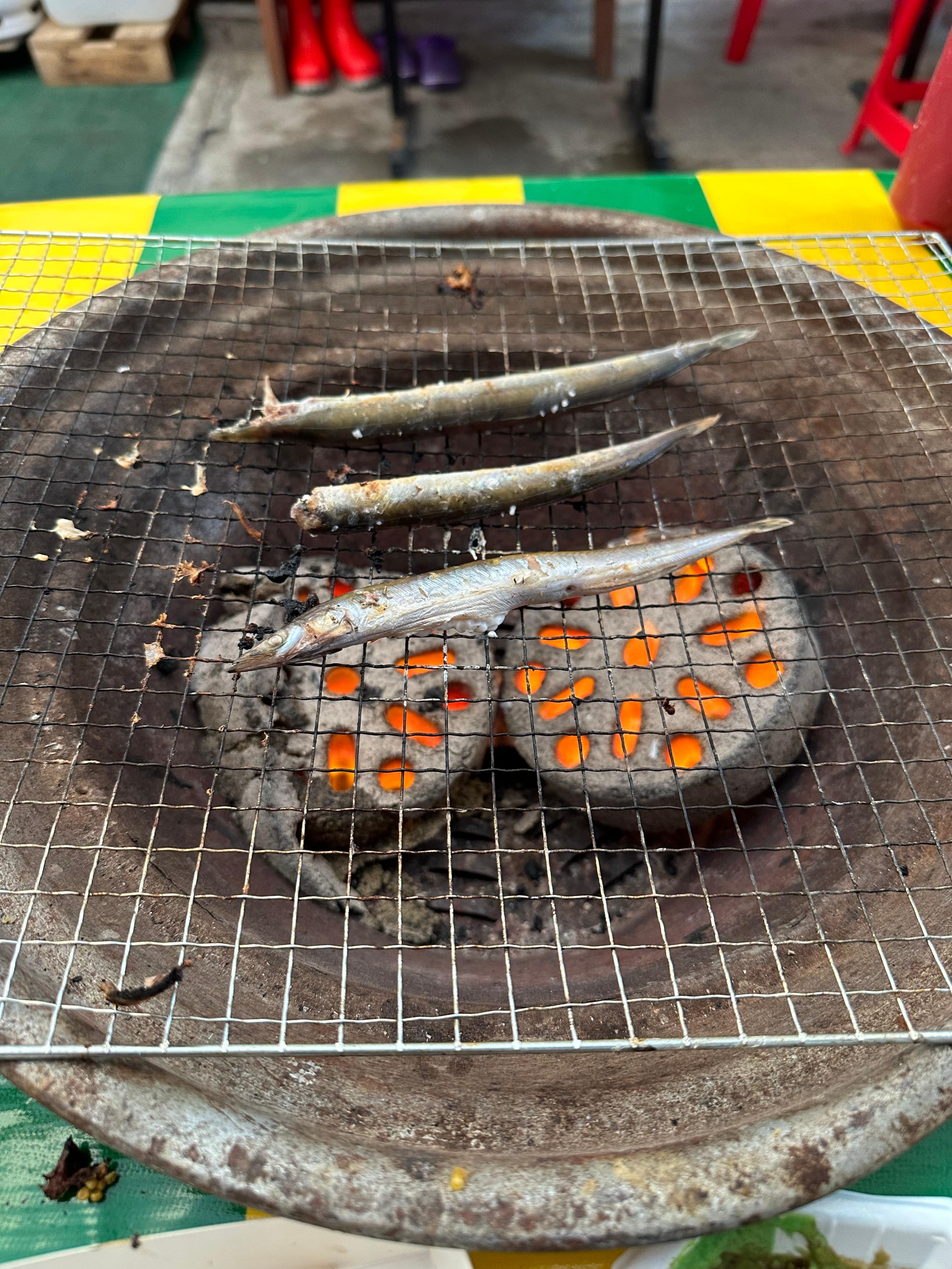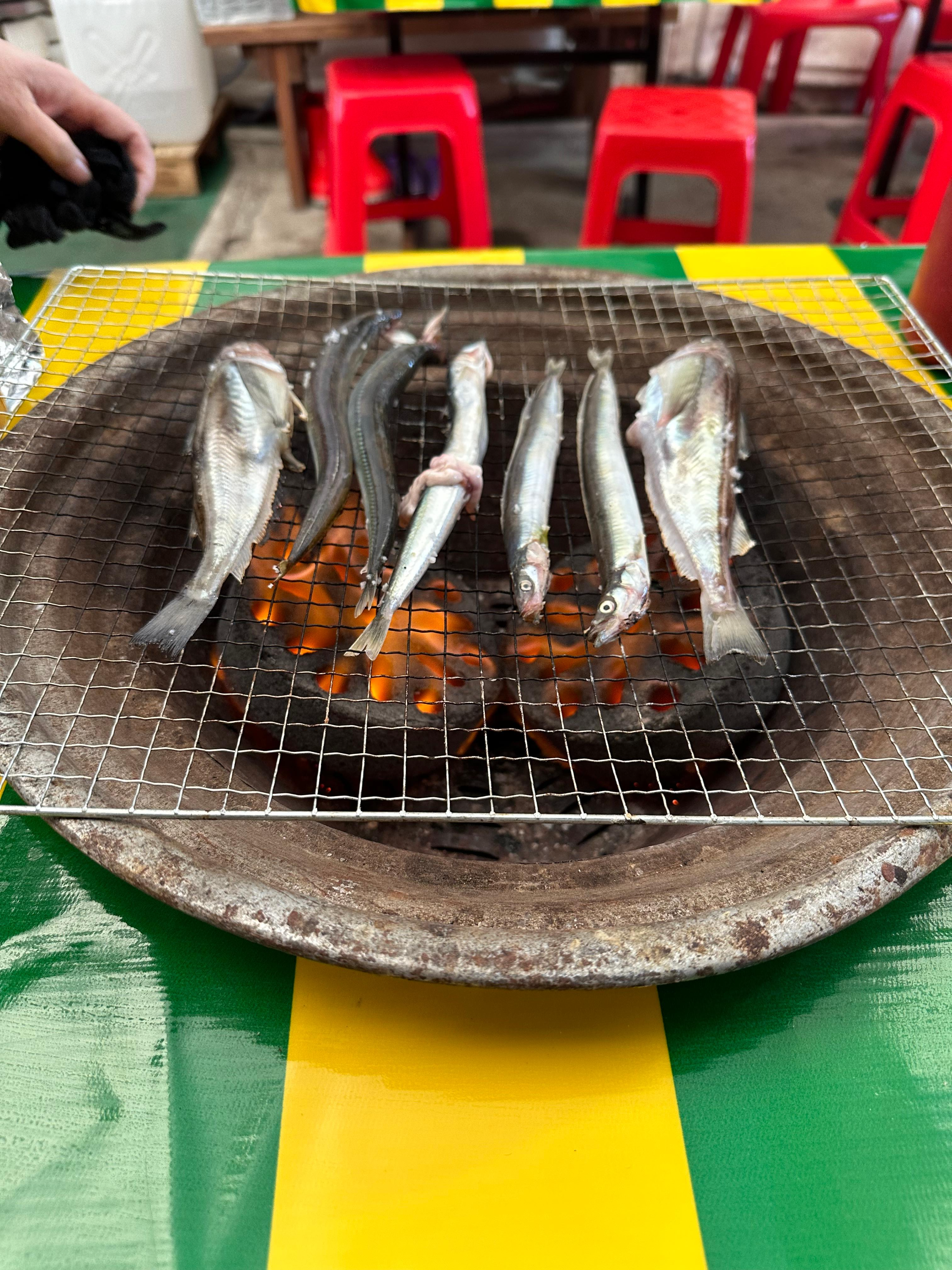 숯불과 연탄에 의해 구워먹는 양미리와 도루묵인데요. 막 연탄을 놓았을 때는 불이 강하기 때문에 조금만 방심하더라도 양미리가 타버리는 것을 볼 수 있습니다. 양미리 처음받을 때는 위에 소금을 뿌리긴 했는데요. 소금 뿌려지있는게 아마 어느정도 타는거 방지하는 목적도 있는 것 같습니다.