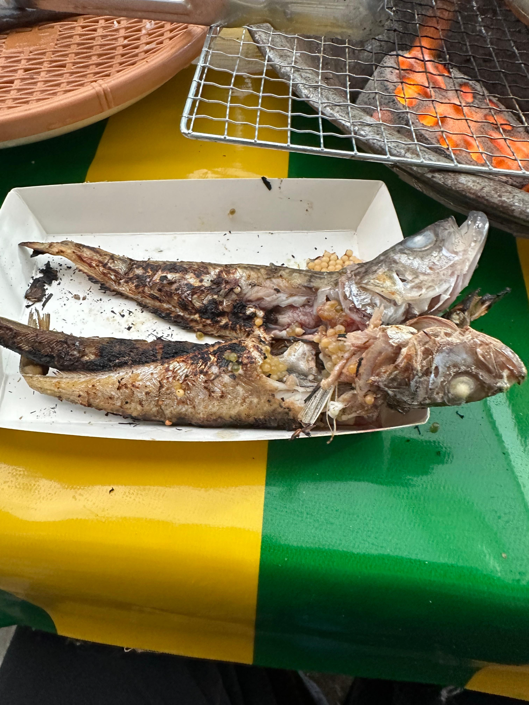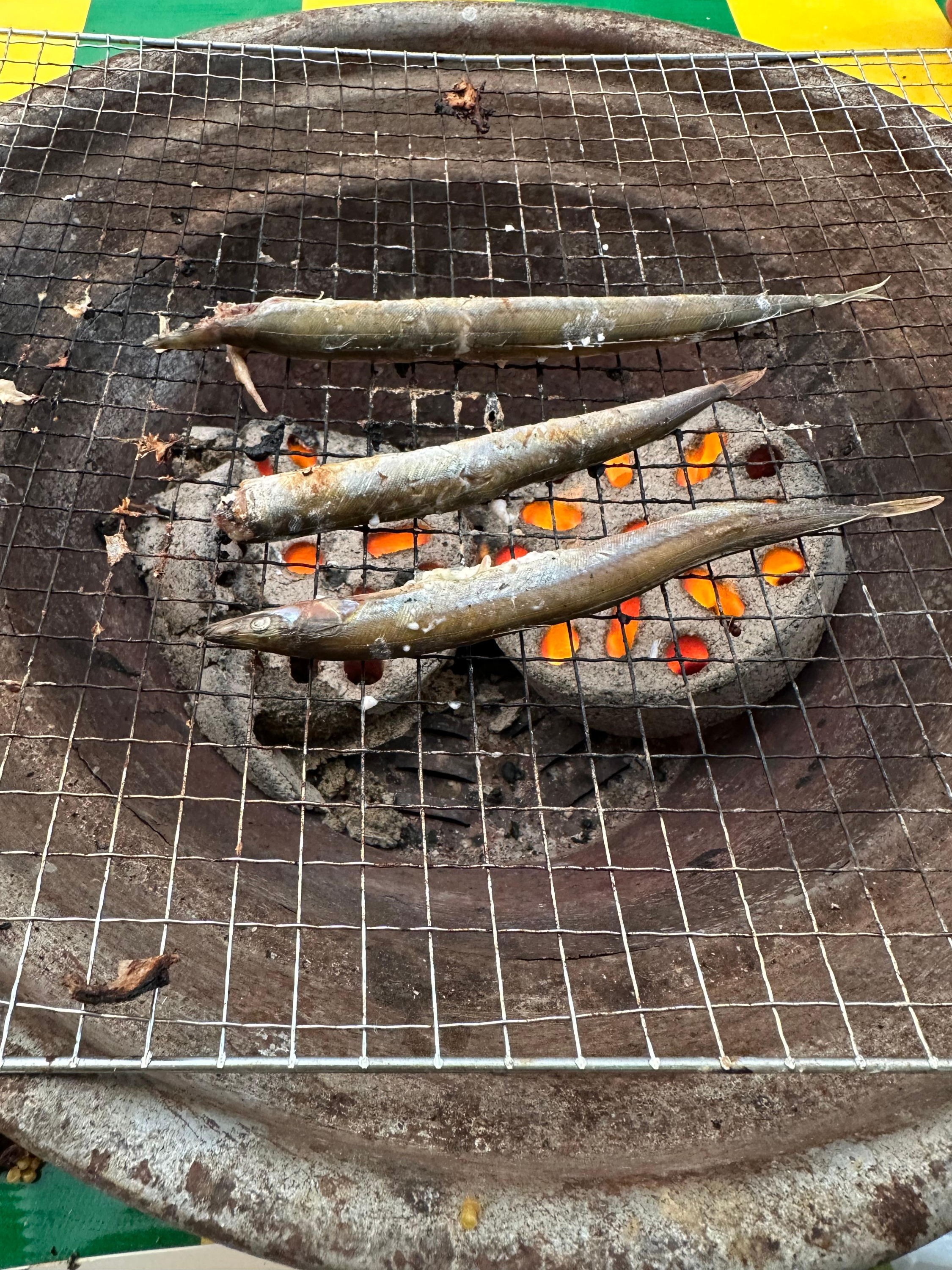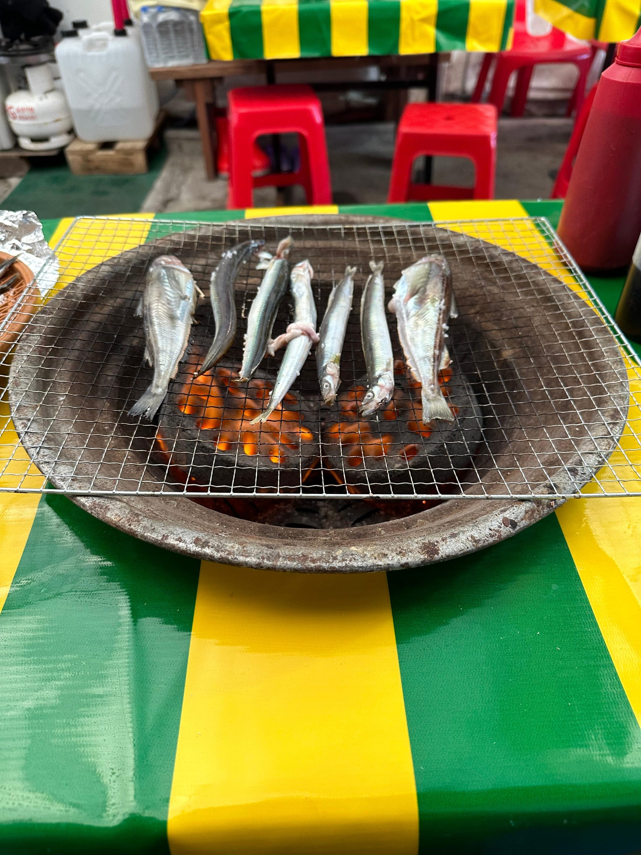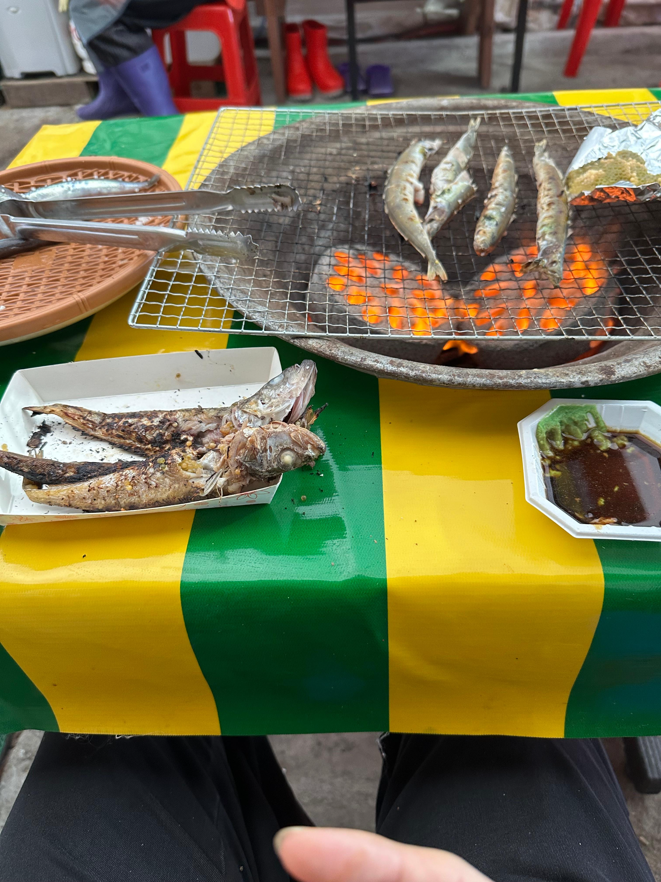 숯불과 연탄에 의해 구워먹는 양미리와 도루묵인데요. 막 연탄을 놓았을 때는 불이 강하기 때문에 조금만 방심하더라도 양미리가 타버리는 것을 볼 수 있습니다. 양미리 처음받을 때는 위에 소금을 뿌리긴 했는데요. 소금 뿌려지있는게 아마 어느정도 타는거 방지하는 목적도 있는 것 같습니다.