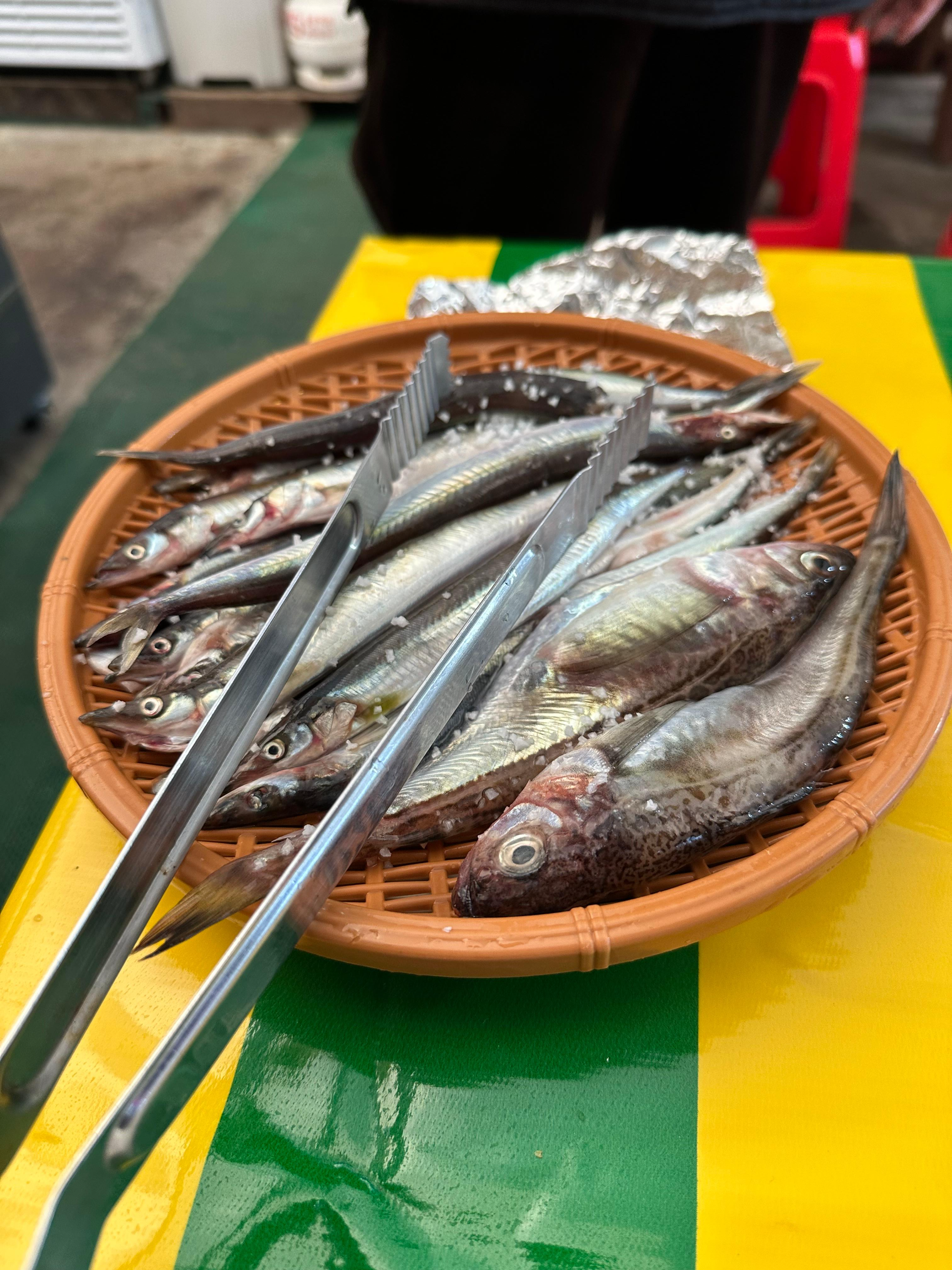 그만큼 경험이 중요하다는 말은 심하게 공감됩니다. 가게 직원분께서 처음에는 직접 해주시면서 가이드를 주셨는데요. 보통 5마리 정도 올려놓고 먹는다고 합니다. 저는 처음에 직원문이 양미리 5마리 정도 가운데에 두고 양쪽에 도루묵을 올려놨는데요. 도루묵은 우리가 일반적으로 먹는 고등어처럼 생기고 양미리는 정말 이름처럼 가늘게 생겼습니다.