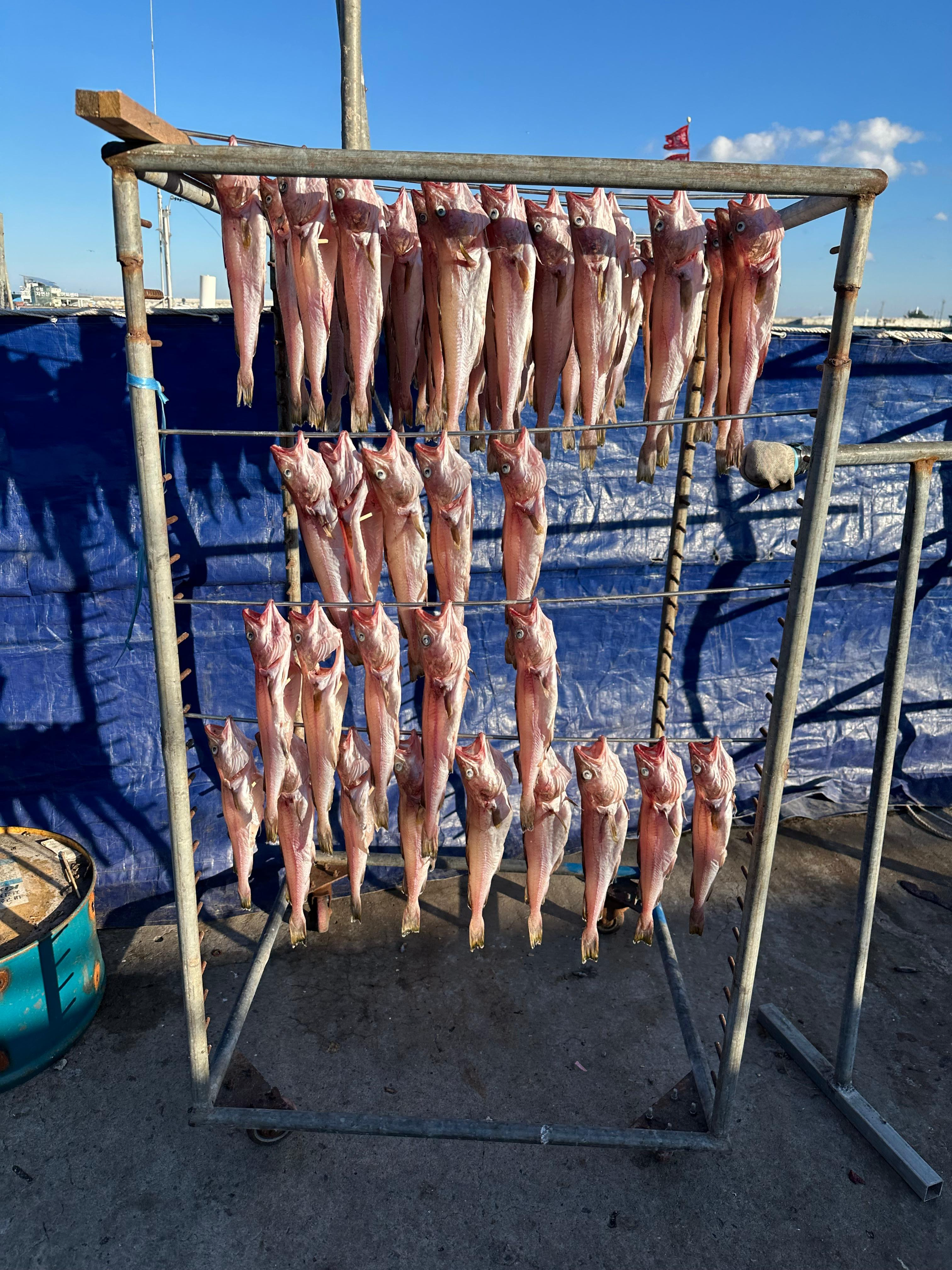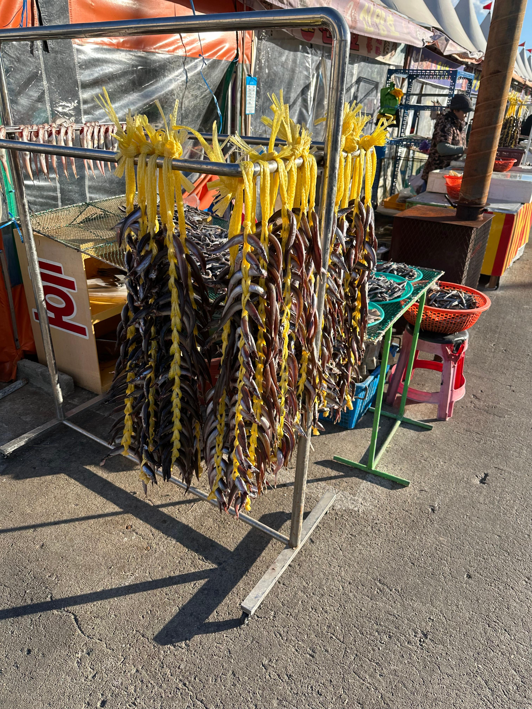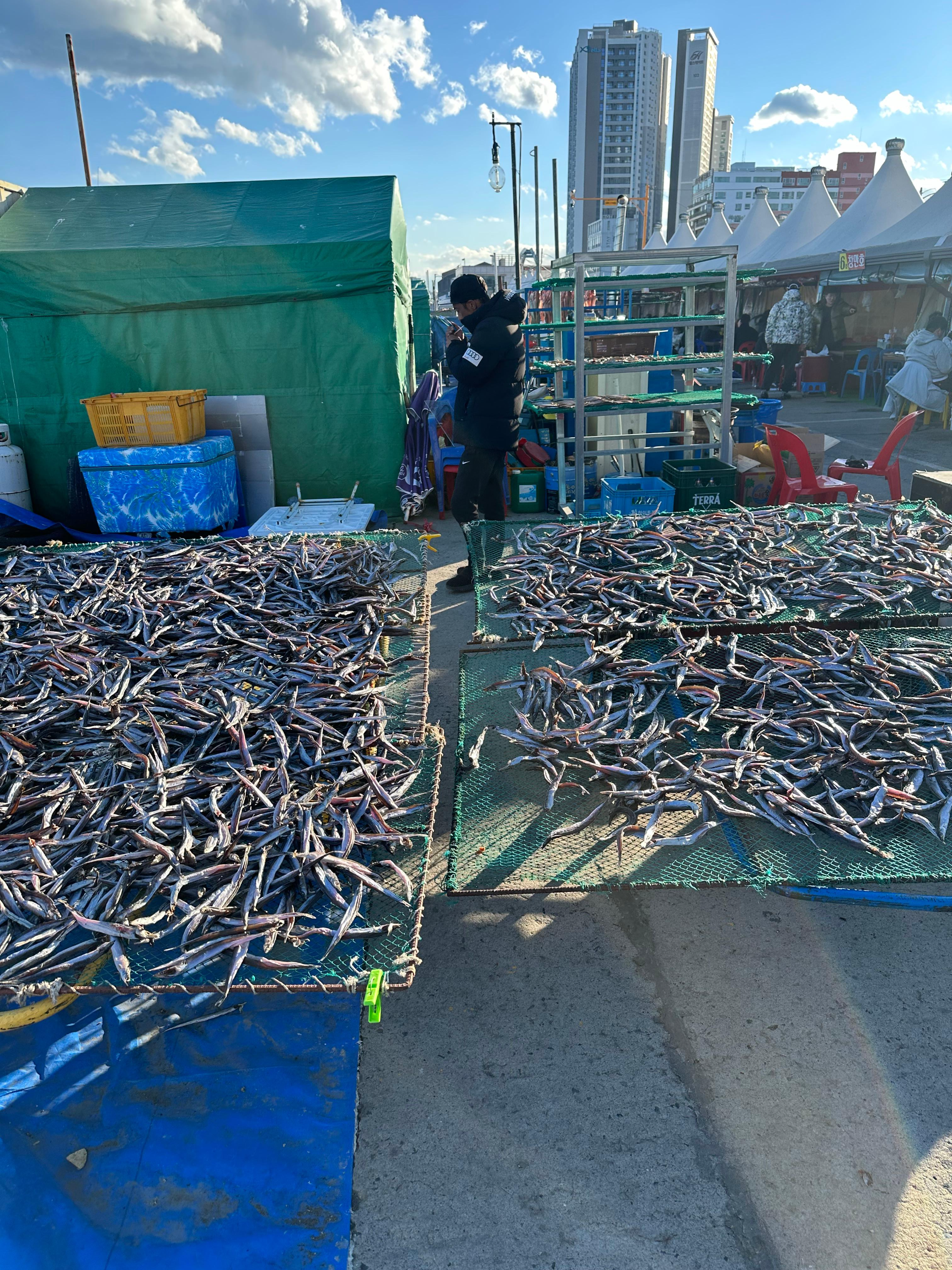 물론 바다와 지리적으로 매우 가까운 속초라서 양미리 뿐만 아니라 다른 수산물도 판매할 수 있지만 어째튼 양미리와 도루묵은 매년 11월과 12월이 제철이라고 해요. 바다 바로 앞에 도착한 곳인지라 양미리와 도루묵을 판매하는 포장마차라고 할까요 주위에는 이렇게 다양한 생선과 양미리와 도루묵도 곳곳에서 말리는 모습도 볼 수 있었습니다.