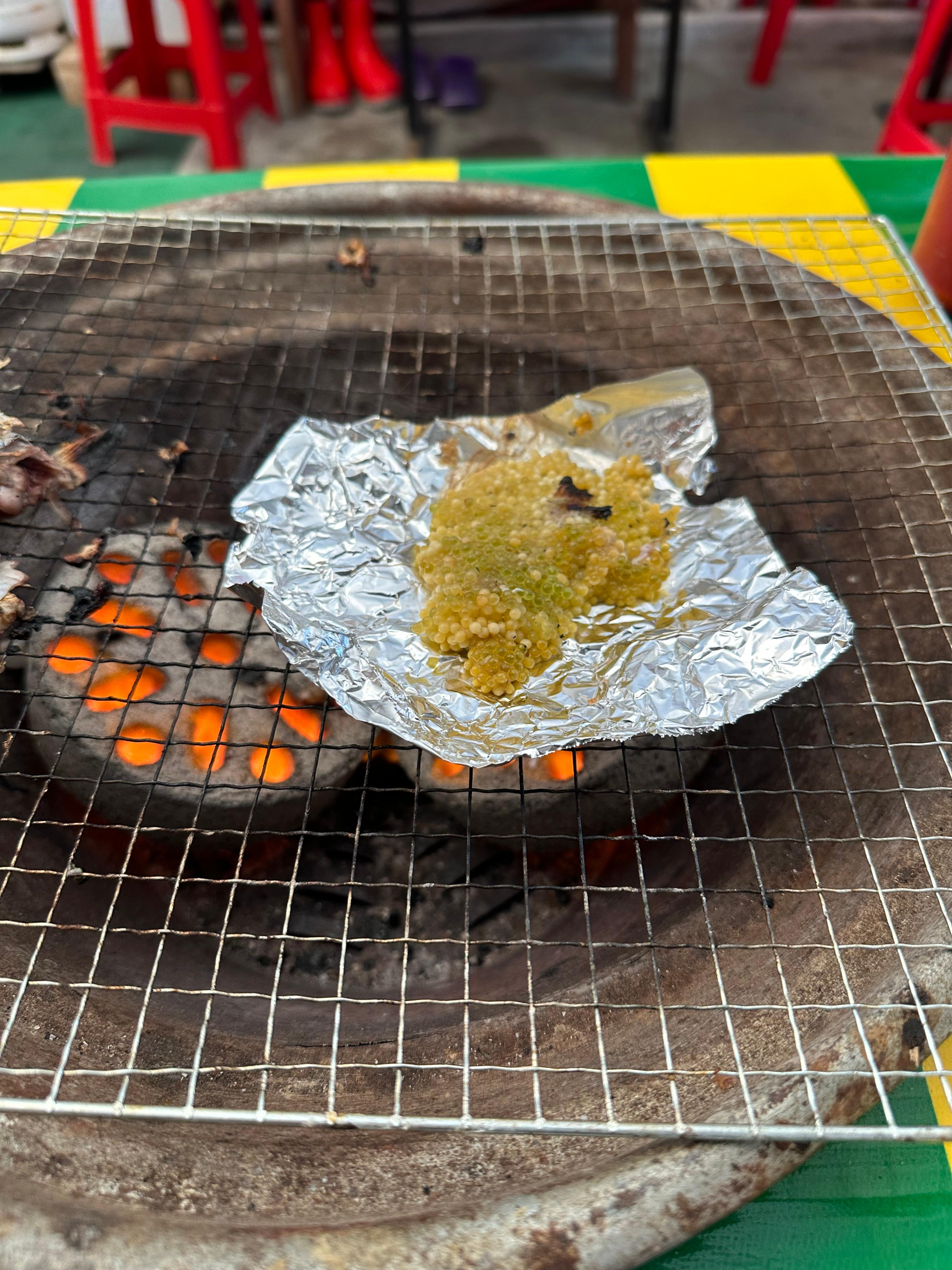 - 도루묵의 경우 일반 고등어 생선처럼 생겼는데요. 연탄불 위에 굽다보면 알이 나올 수 있어요. 그래서 가게에서 제공된 은박지를 이용해서 알아 터지는 시점에 빼내어 연탄불 위에서 구워서 먹으면 되요.