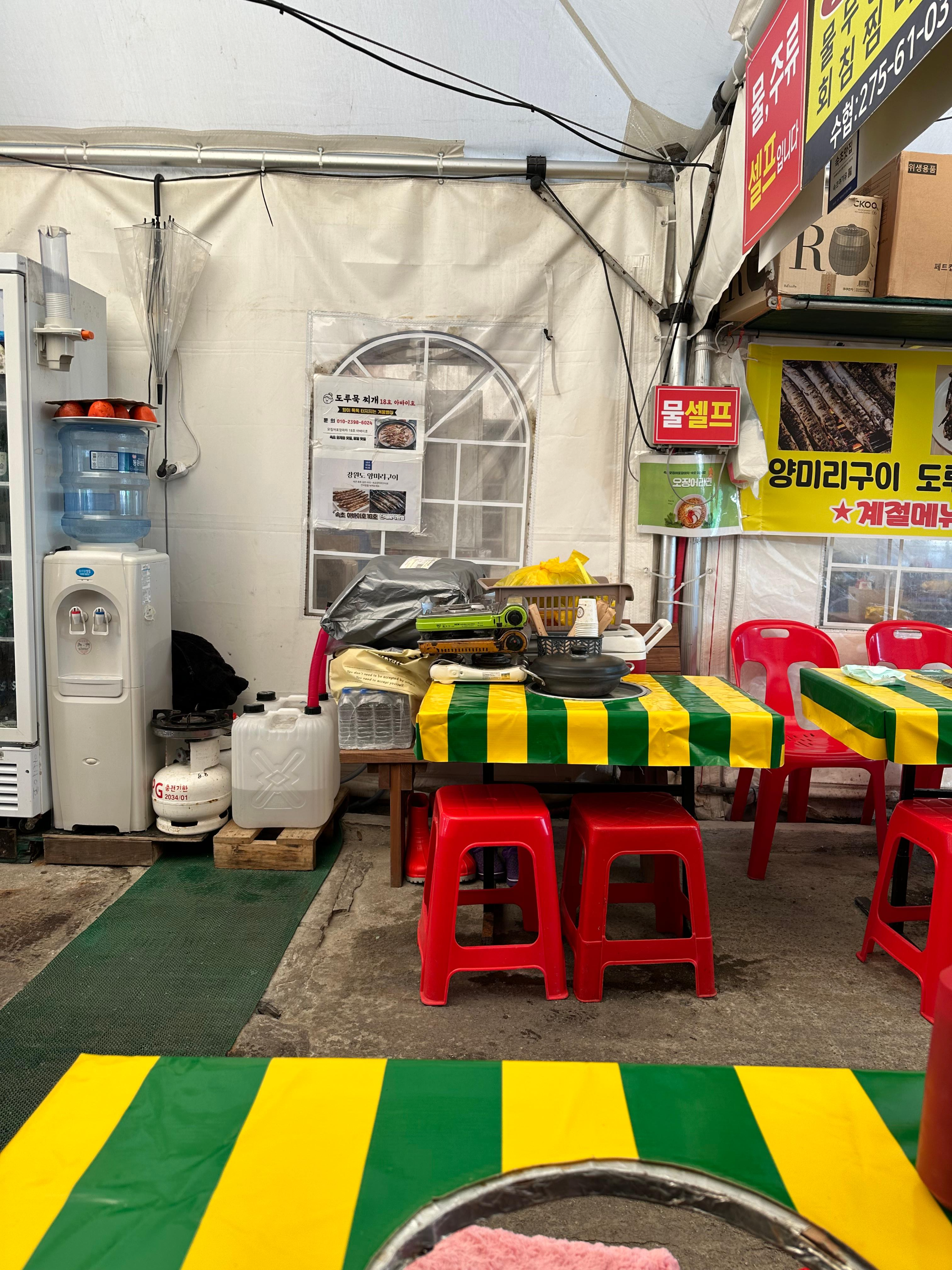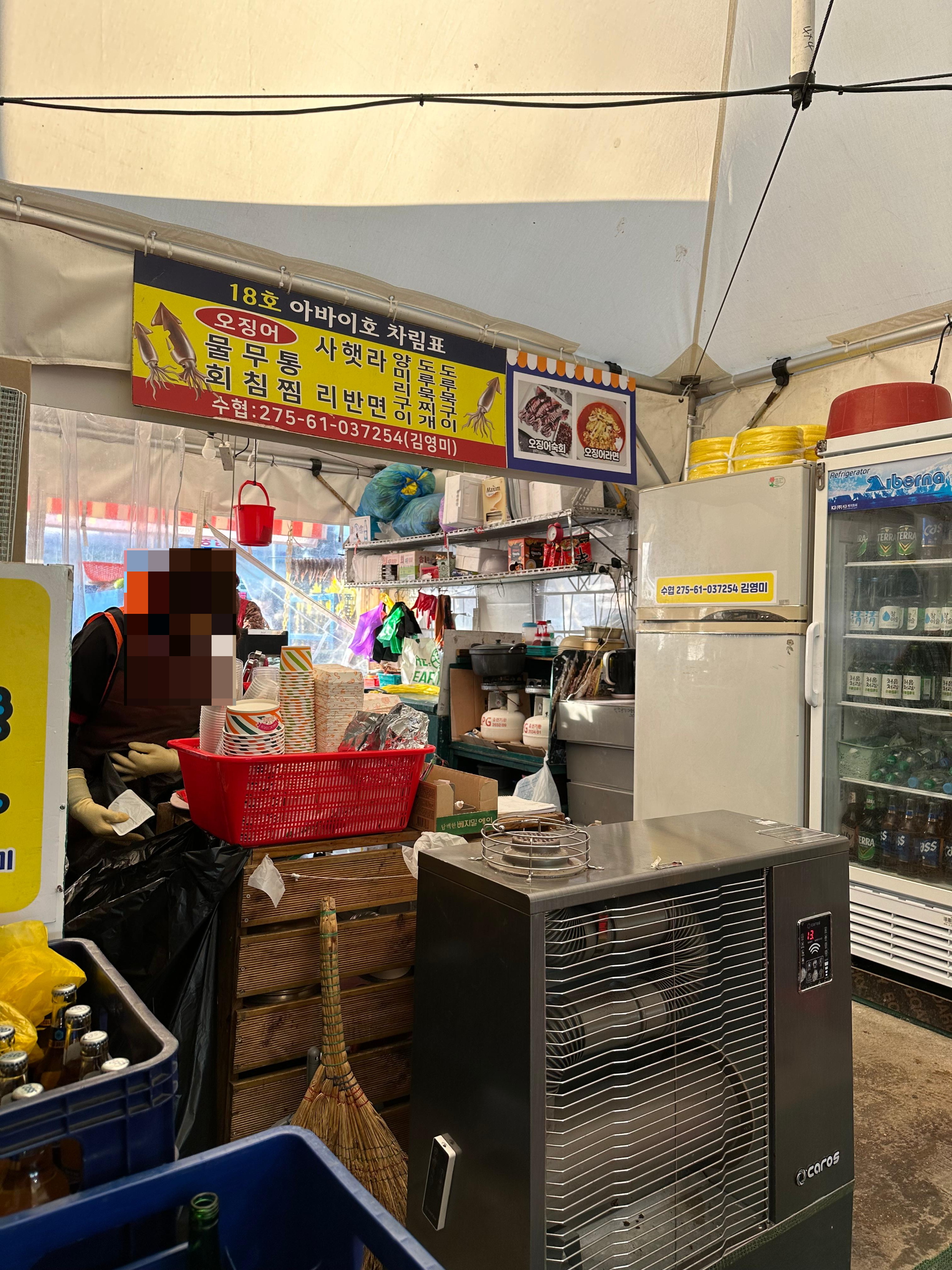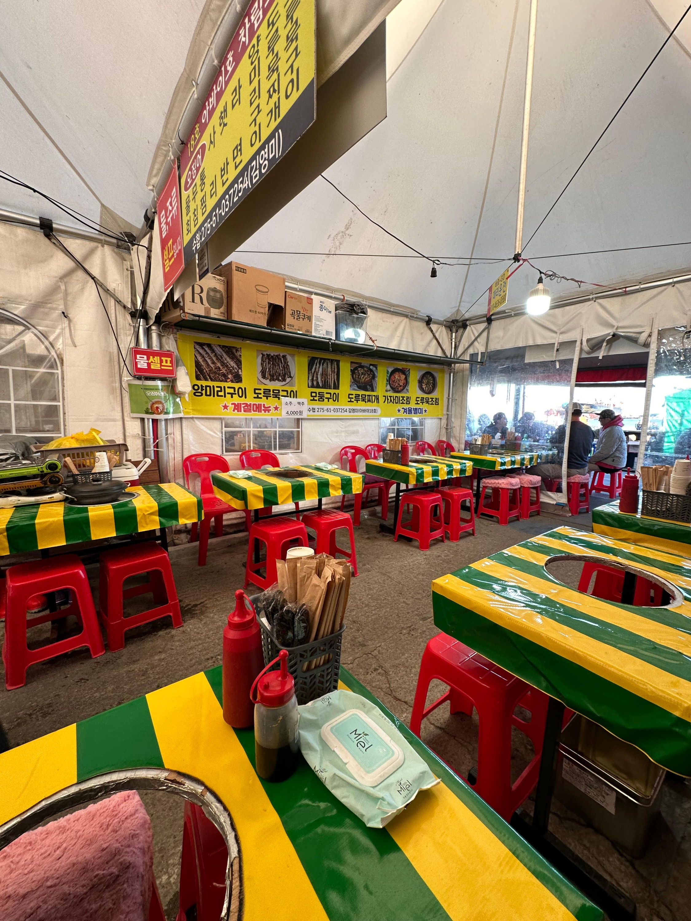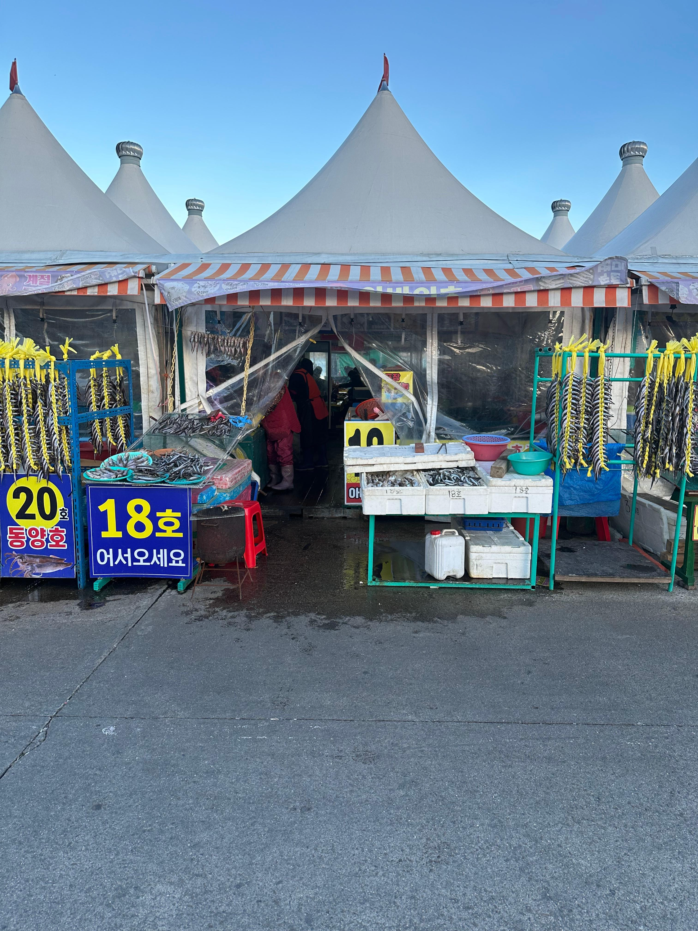 양미리와 도루묵 제철기간인 11월에서 12월 사이에는 속초항 여객선터미널 앞으로 하얀 포장마차들이 줄지어 장사하는 모습을 볼 수 있는데요. 물론 다같은 장소이며 양미리와 도루묵을 판매하는 장소라 큰 고민 없이 돌아다녔는데요. 그래도 이왕 먹는거 2019년에 처음왔던 대략적인 장소에서 먹어보고 싶어서 그 일대 포장마차를 두리번 거렸습니다. 주로 아주머니 아저씨 할머니 할아버지분들이 운영 하고 가게 앞으로는 서로 자기 가게 오라는 분들이 있었습니다. 앞서 말씀드린 것처럼 2019년 속초에서 처음 양미리를 먹었던 대략적인 곳이었던 기억을 더듬어 18호 가게로 저는 들어가게 되었습니다.