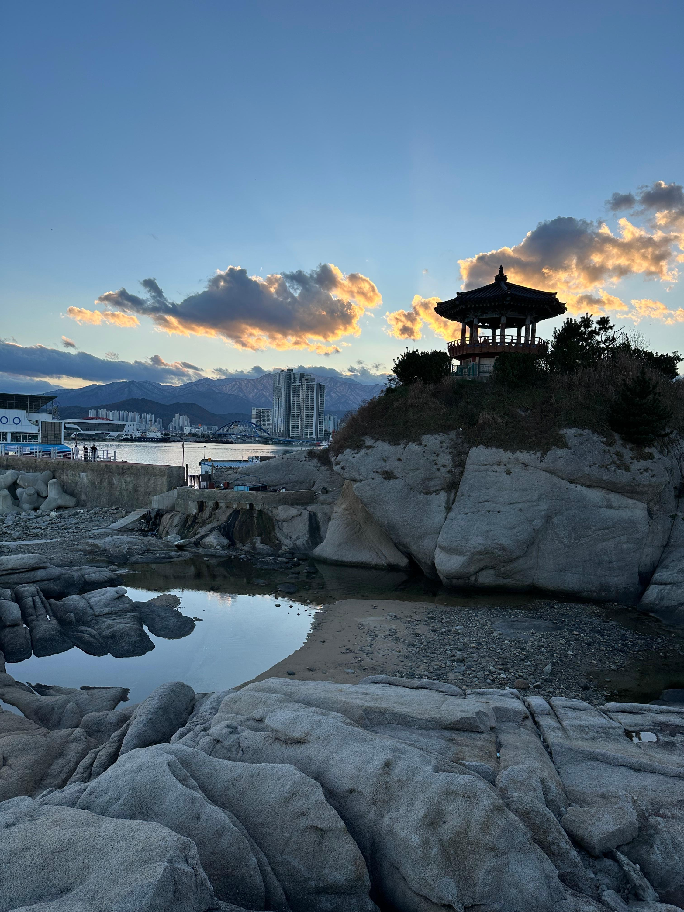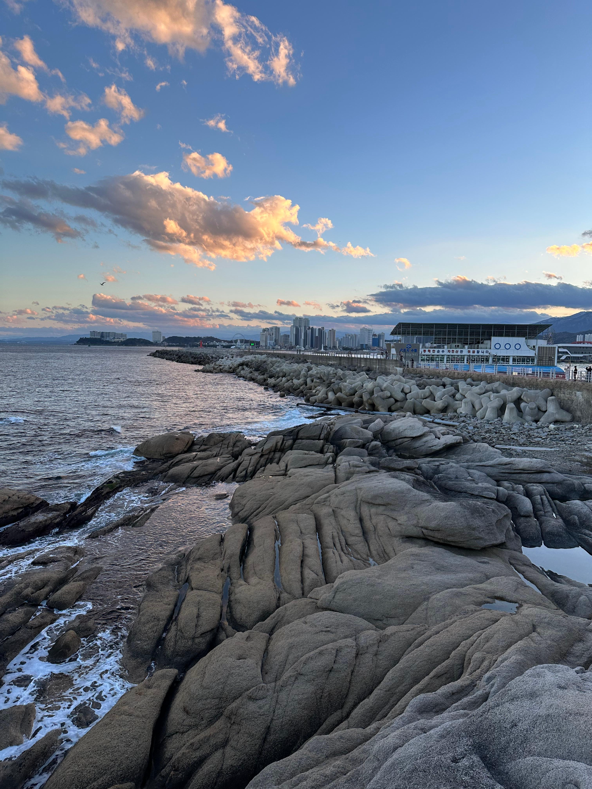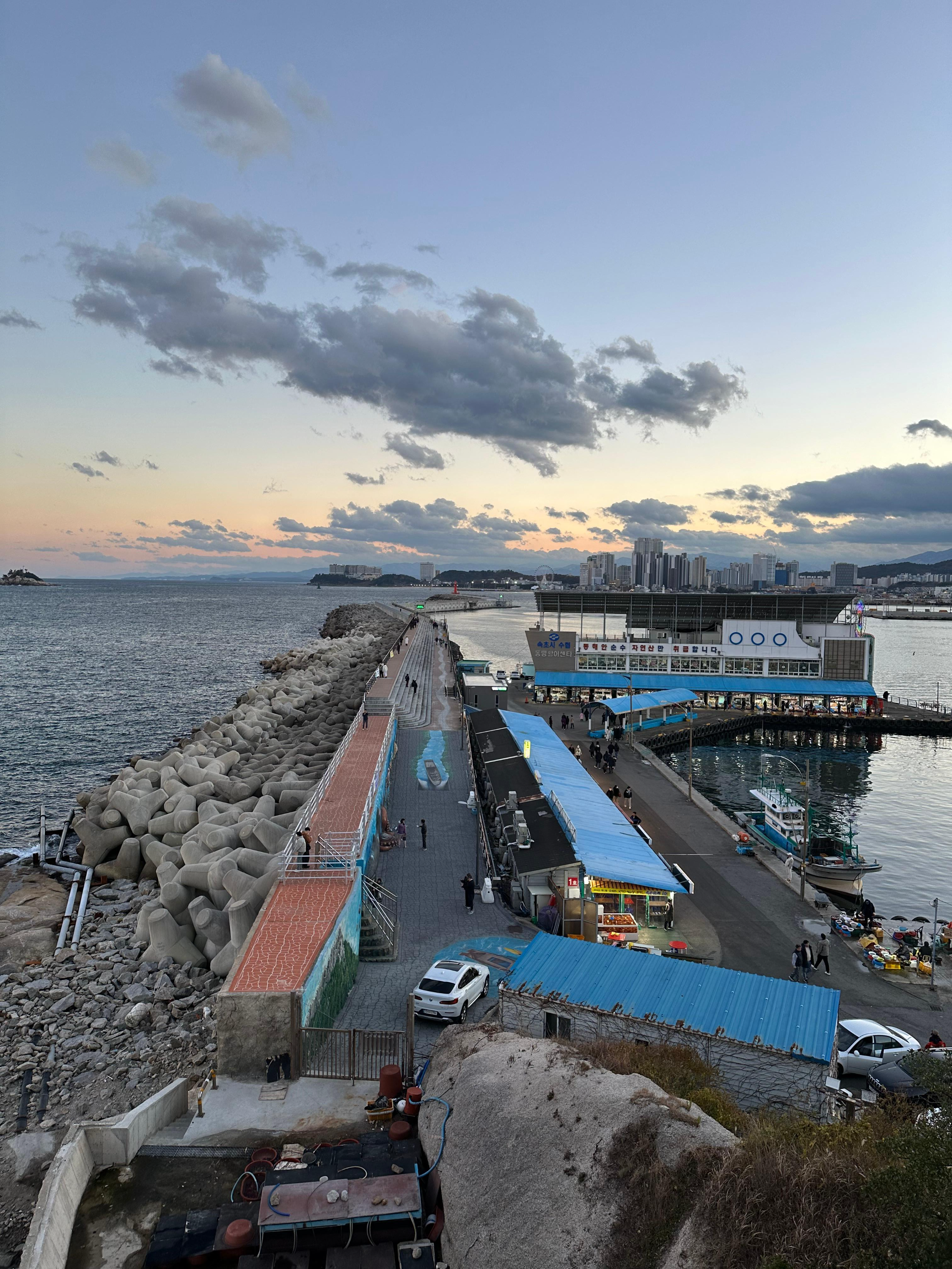 영금정 해돋지 정자와 정자 전망대에서는 아름다운 동해바다와 함께 속초 풍경을 보았다면 동명항 방파제에서는 평지 위에서 동해바다와 설악산을 배경으로 하는 속초 시내의 모습 그리고 조금 멀리 떨어진 영금정은 는 또 다른 관점이었는데요. 그렇게 동명항에서 5시 30분 가까이 시간을 보내다보니까 어둠이 찾아왔습니다. 저녁 시간도 다 되어가고 숙소로 향하기전에 속초 관광수산시장에 가기 위해 발걸음을 옮기기 시작했습니다.