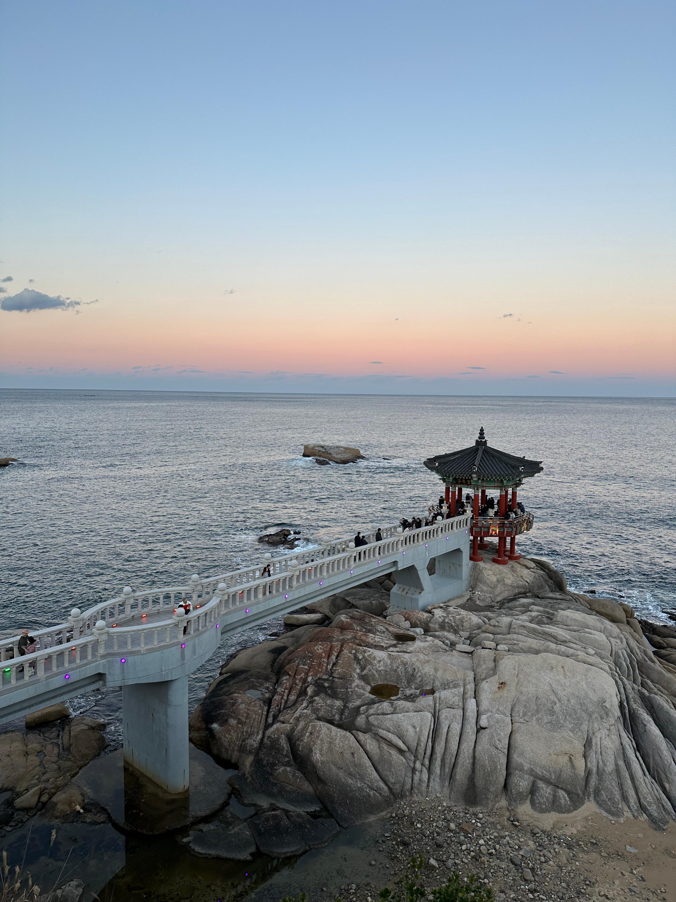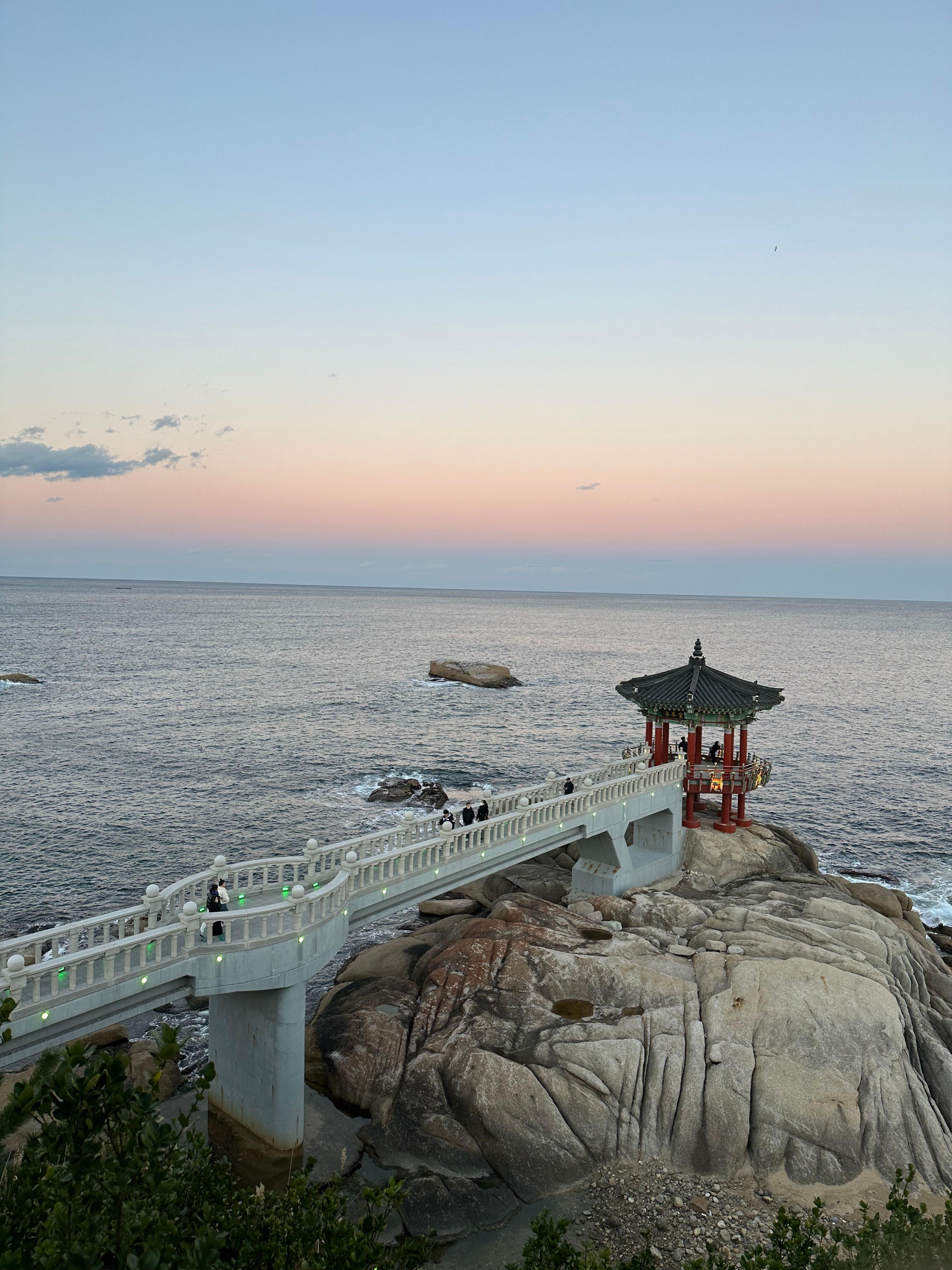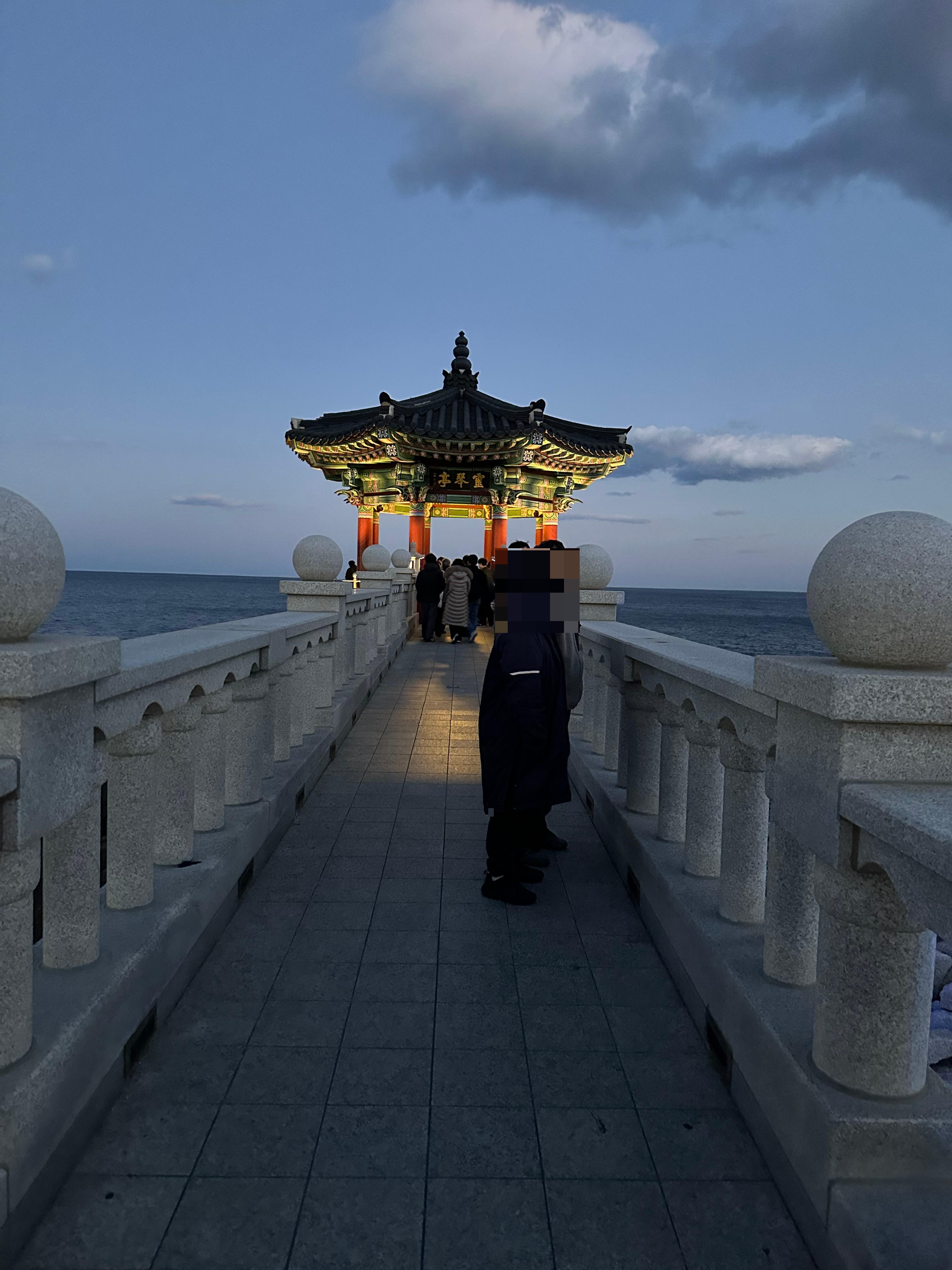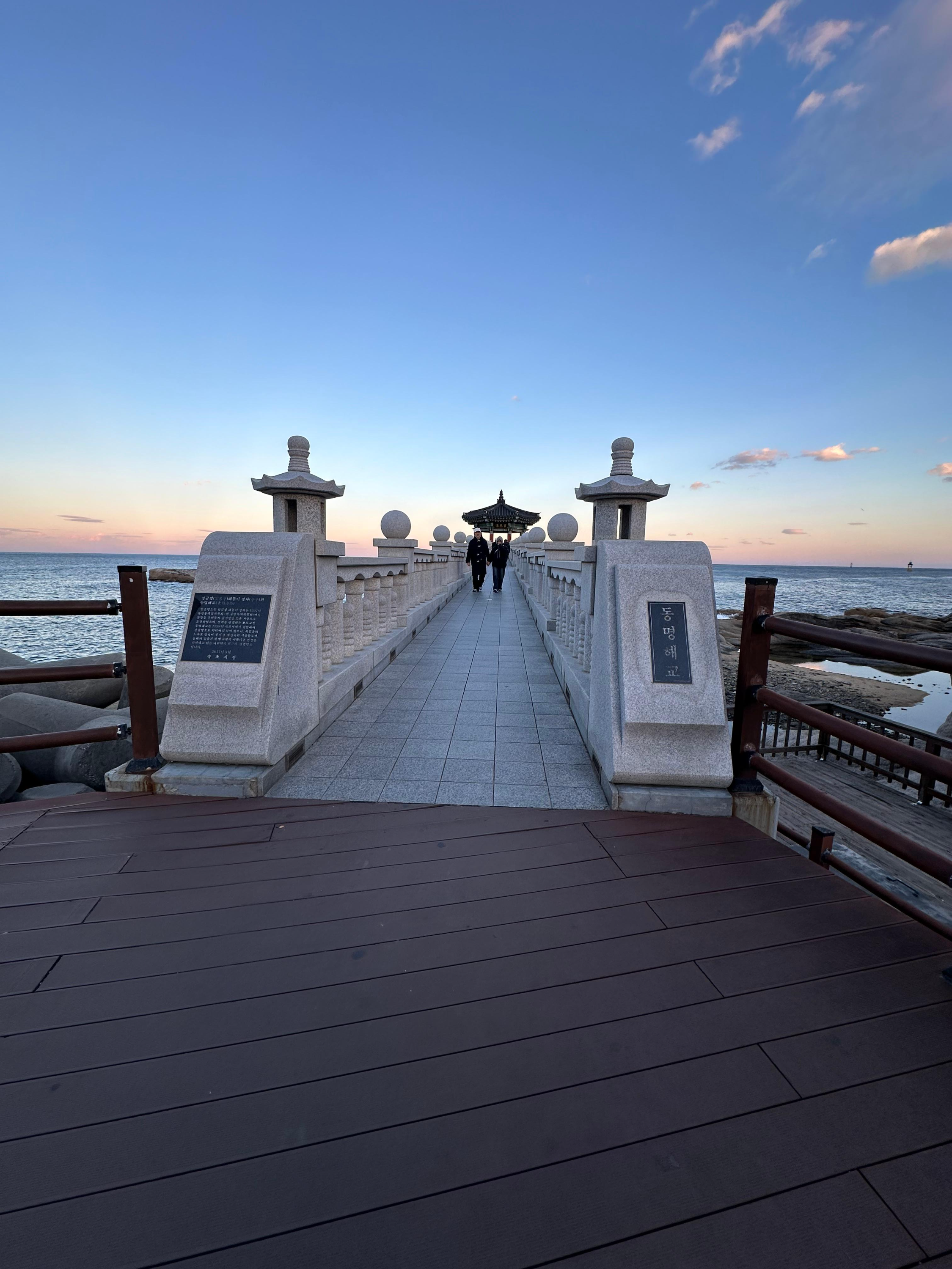 영금정 해돋이 전망대로 가는 계단을 올라서 긴 다리를 지나 해돋이 정자까지 웅장한 다리를 걸어가는 기분이었습니다. 마치 지난 송도해상케이블카 타고 암남공원 포스팅을 전해드렸던 기억이 있습니다. 저는 그 당시에 용궁 구름다리는 너무 늦은시간이라 건너지 못했는데요. 흔히 티비에서 드라마나 영화처럼 바다를 건너가는 장면에서는 용궁으로 가는듯한 장면이 펼쳐지기도 합니다. 해돋이 전망대를 통해 걷는데 그런 장면이 떠올랐습니다.