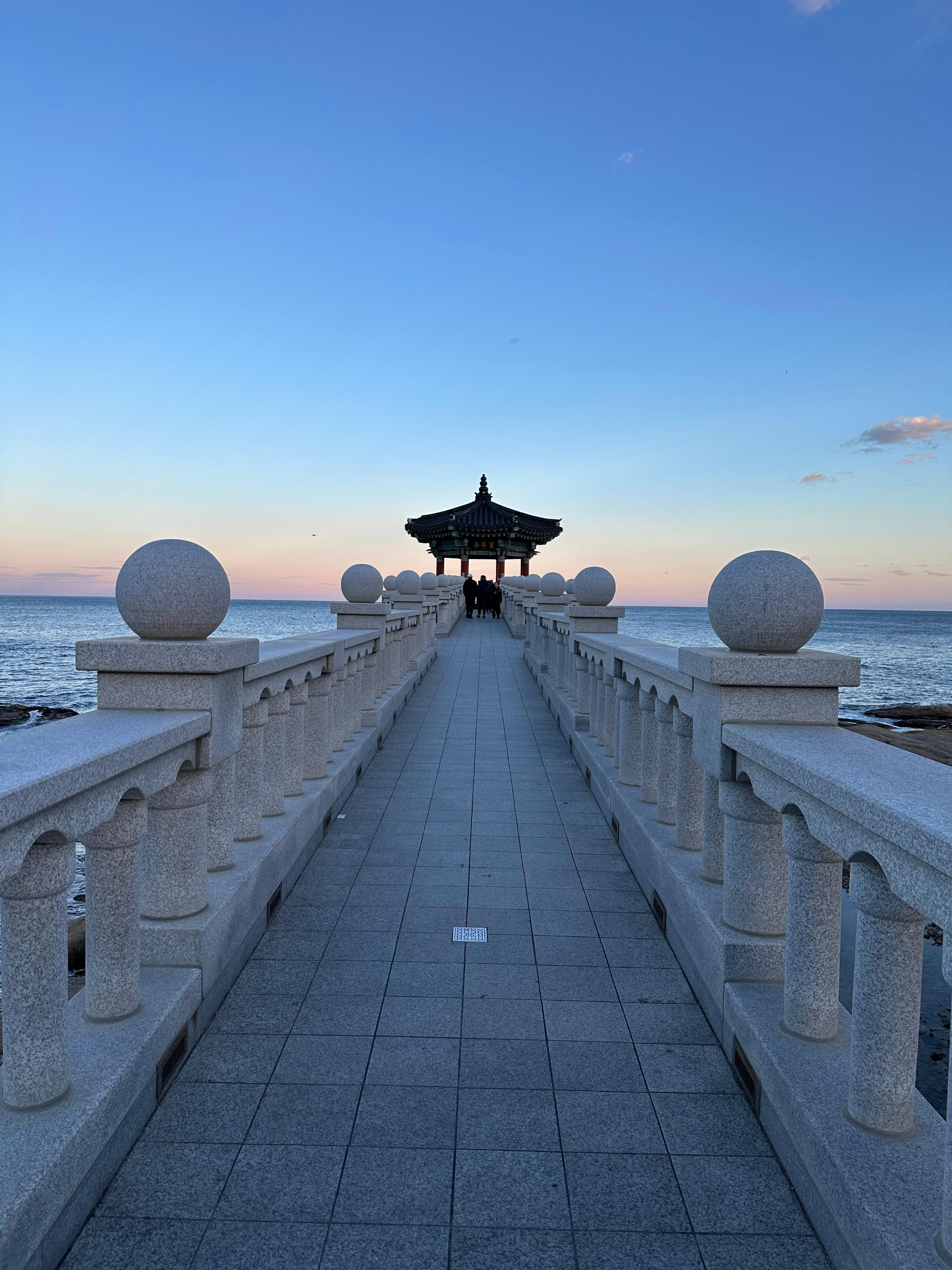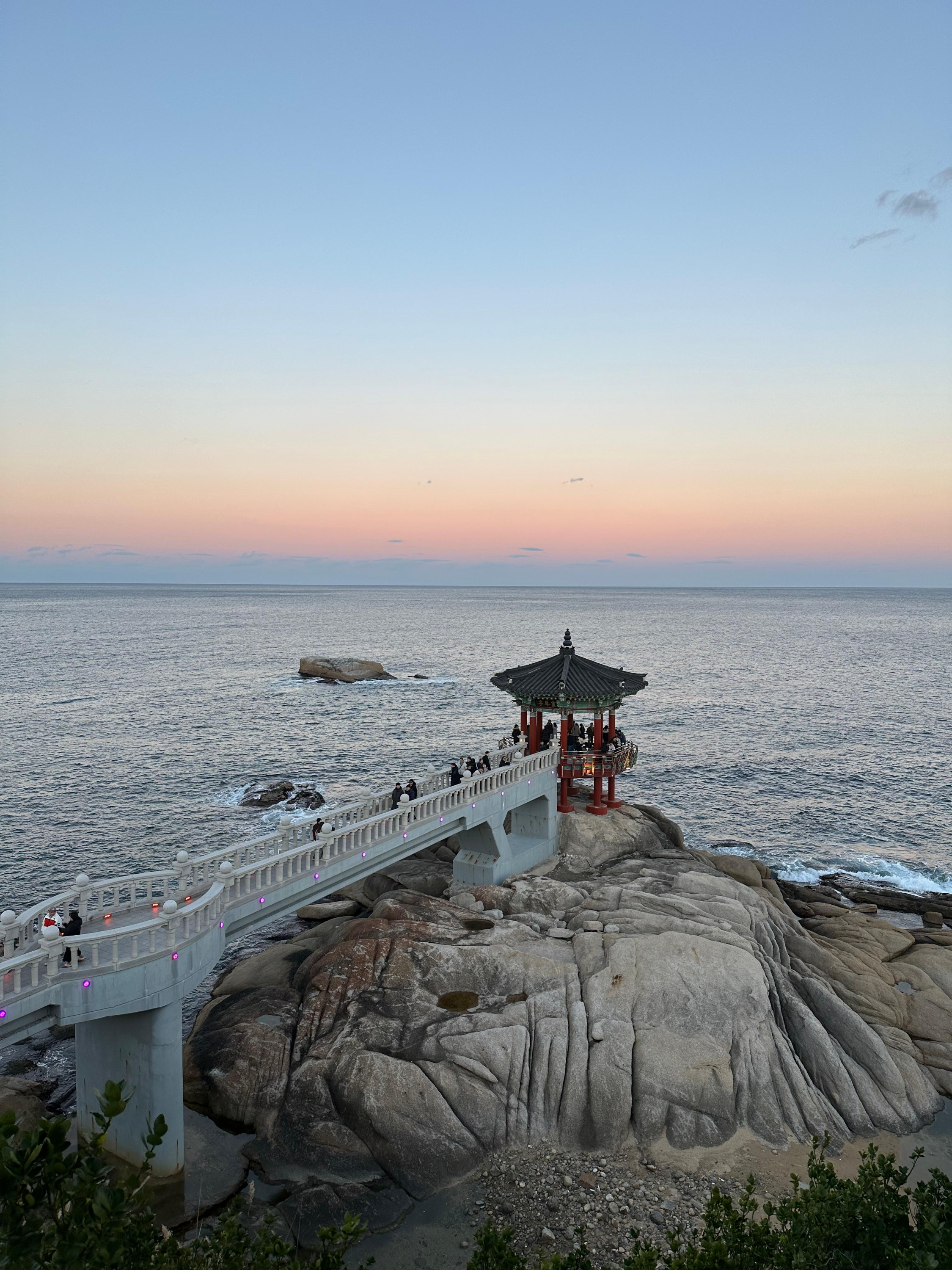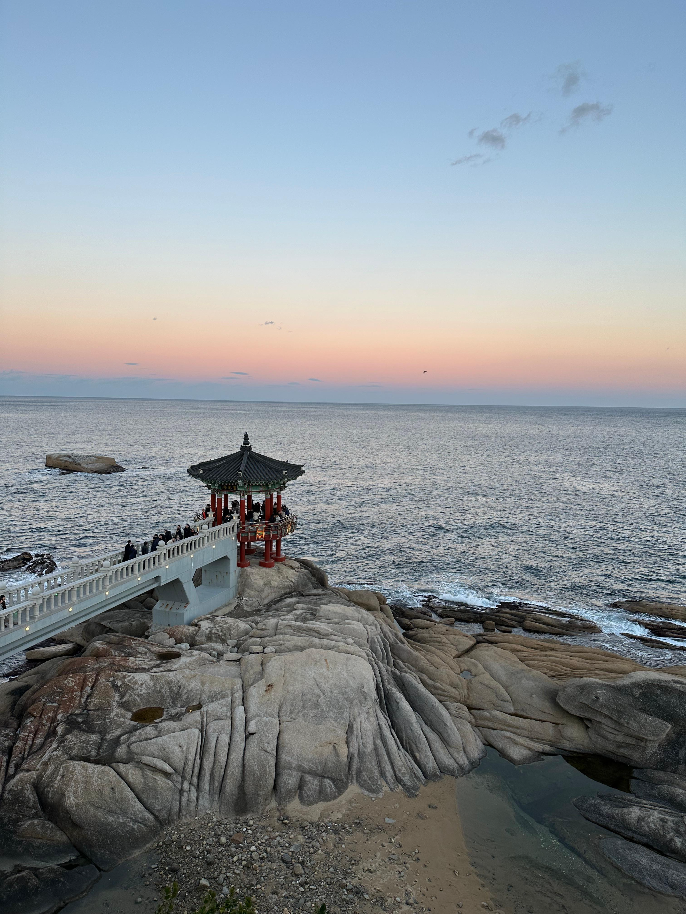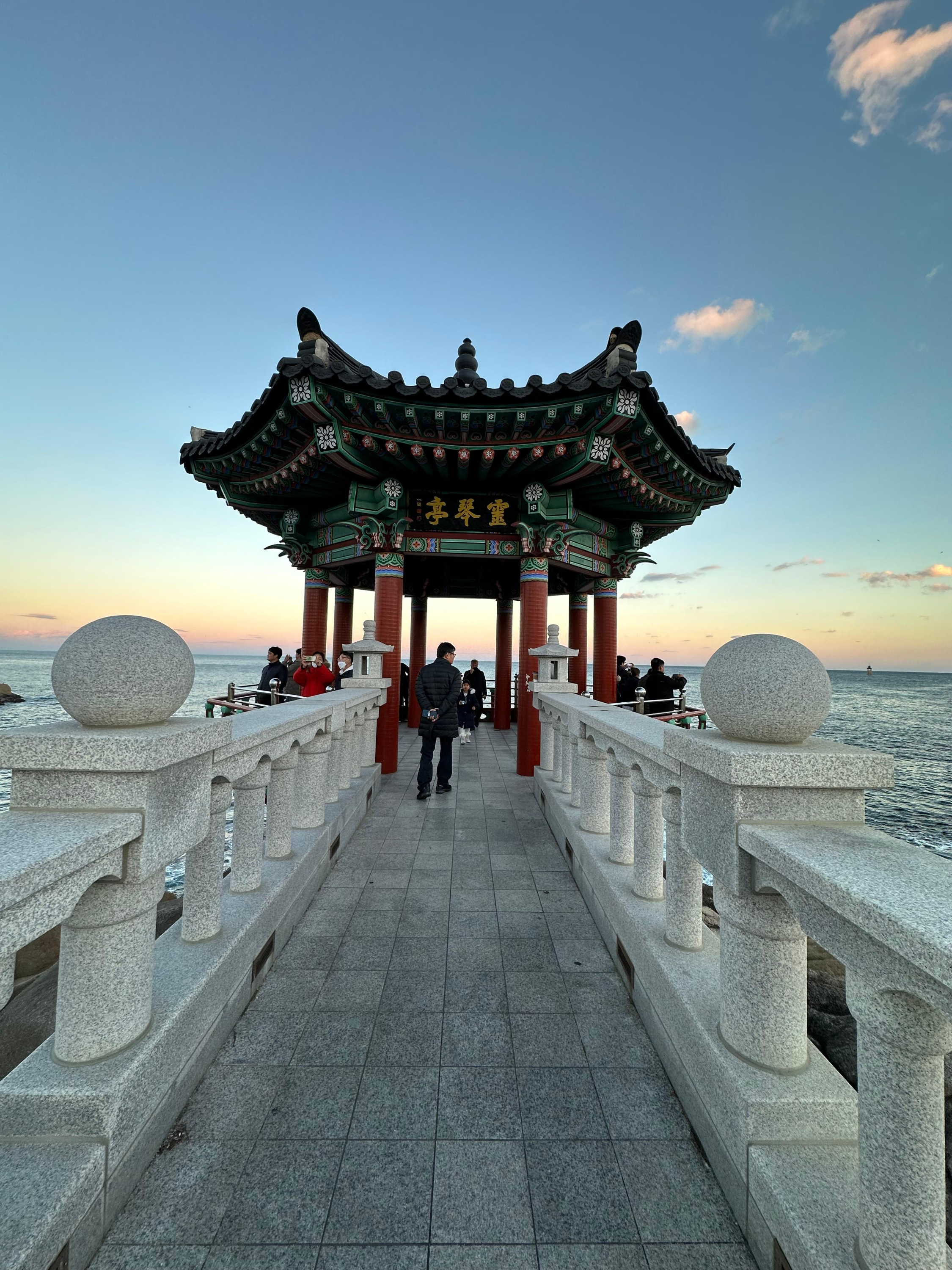 영금정 해돋이 전망대로 가는 계단을 올라서 긴 다리를 지나 해돋이 정자까지 웅장한 다리를 걸어가는 기분이었습니다. 마치 지난 송도해상케이블카 타고 암남공원 포스팅을 전해드렸던 기억이 있습니다. 저는 그 당시에 용궁 구름다리는 너무 늦은시간이라 건너지 못했는데요. 흔히 티비에서 드라마나 영화처럼 바다를 건너가는 장면에서는 용궁으로 가는듯한 장면이 펼쳐지기도 합니다. 해돋이 전망대를 통해 걷는데 그런 장면이 떠올랐습니다.