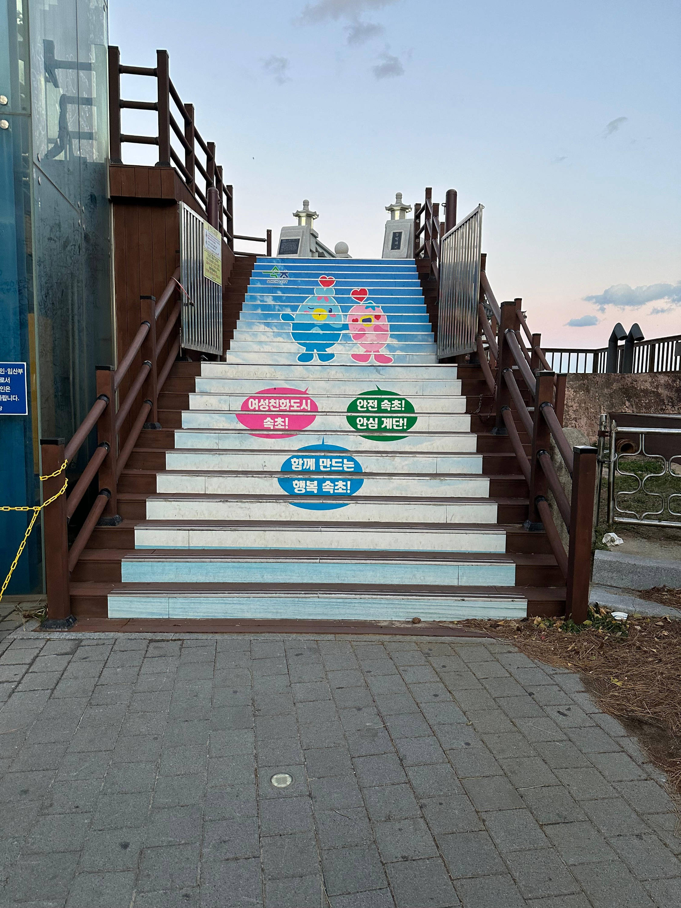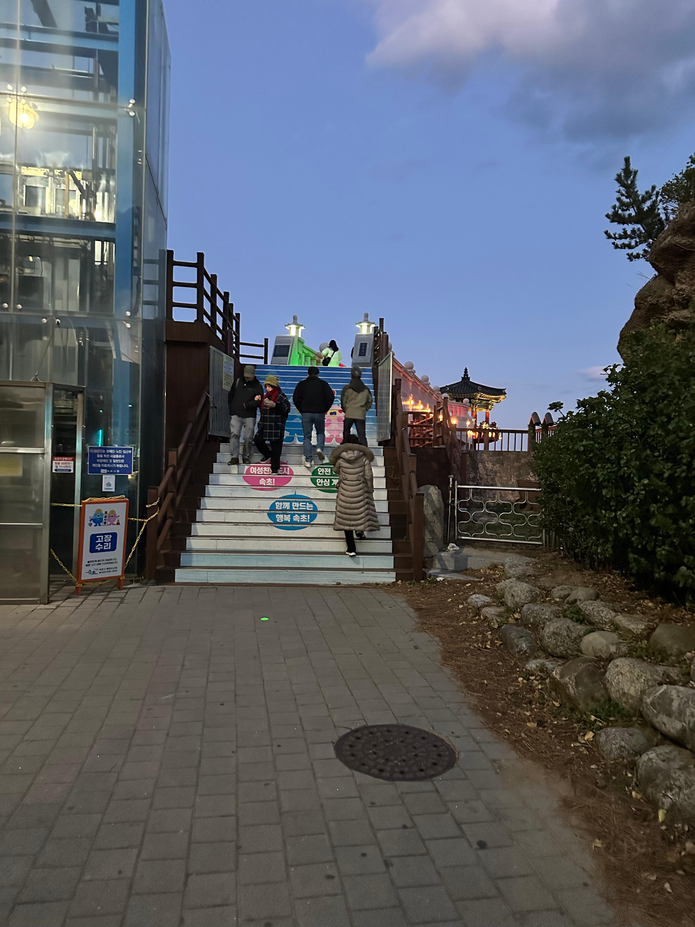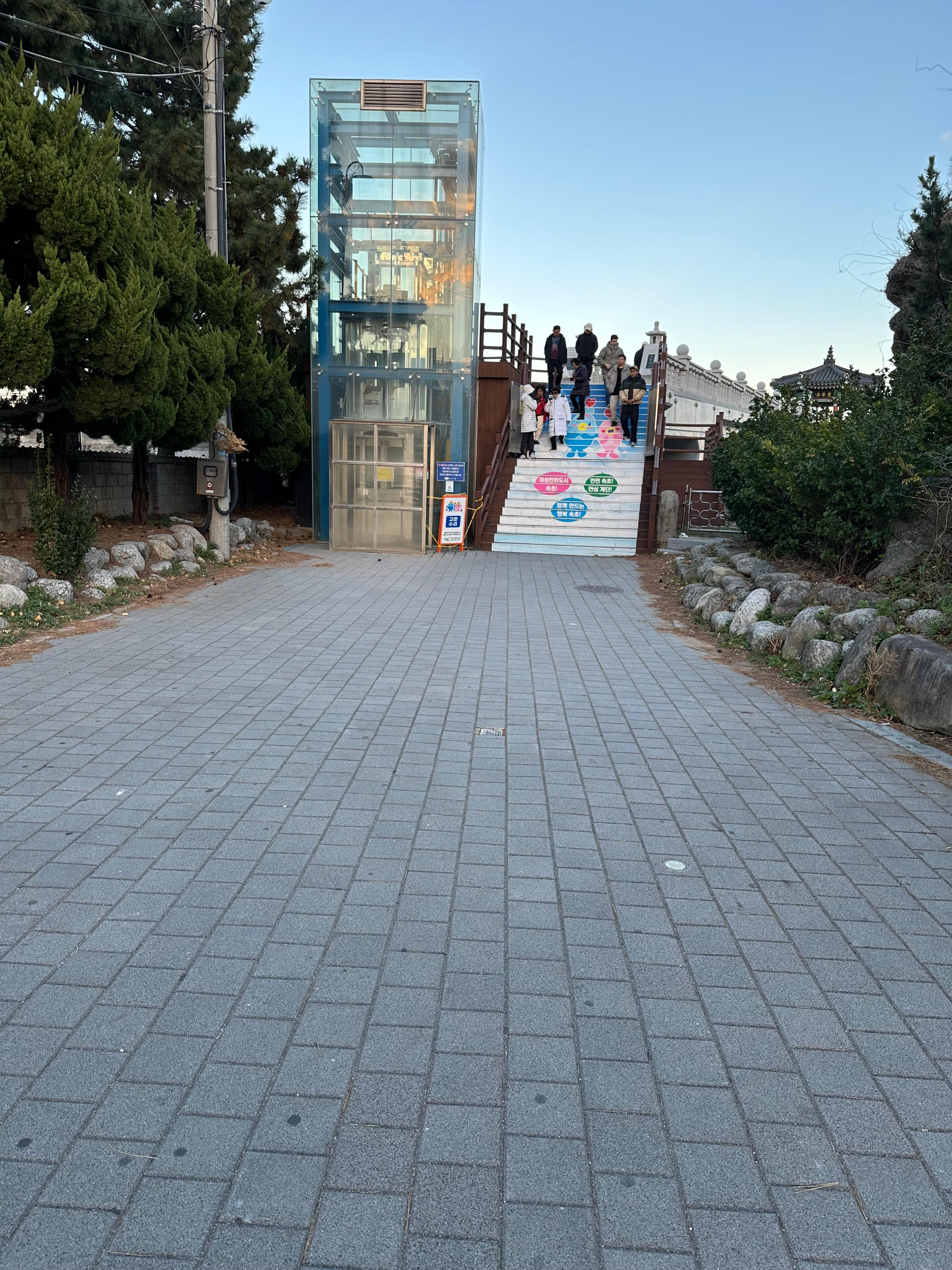 주차장을 지나서 오면 해돋이 전망대가 전면에 있고 구석진 측면으로 정자전망대로 가는 길이 있었습니다. 저도 해돋이 전망대로 오르기 시작했습니다. 해돋이 전망대는 계단이 적었습니다. 높은 계단은 아니지만 신기하게 엘레베이터까지 설치가 되어있었습니다.