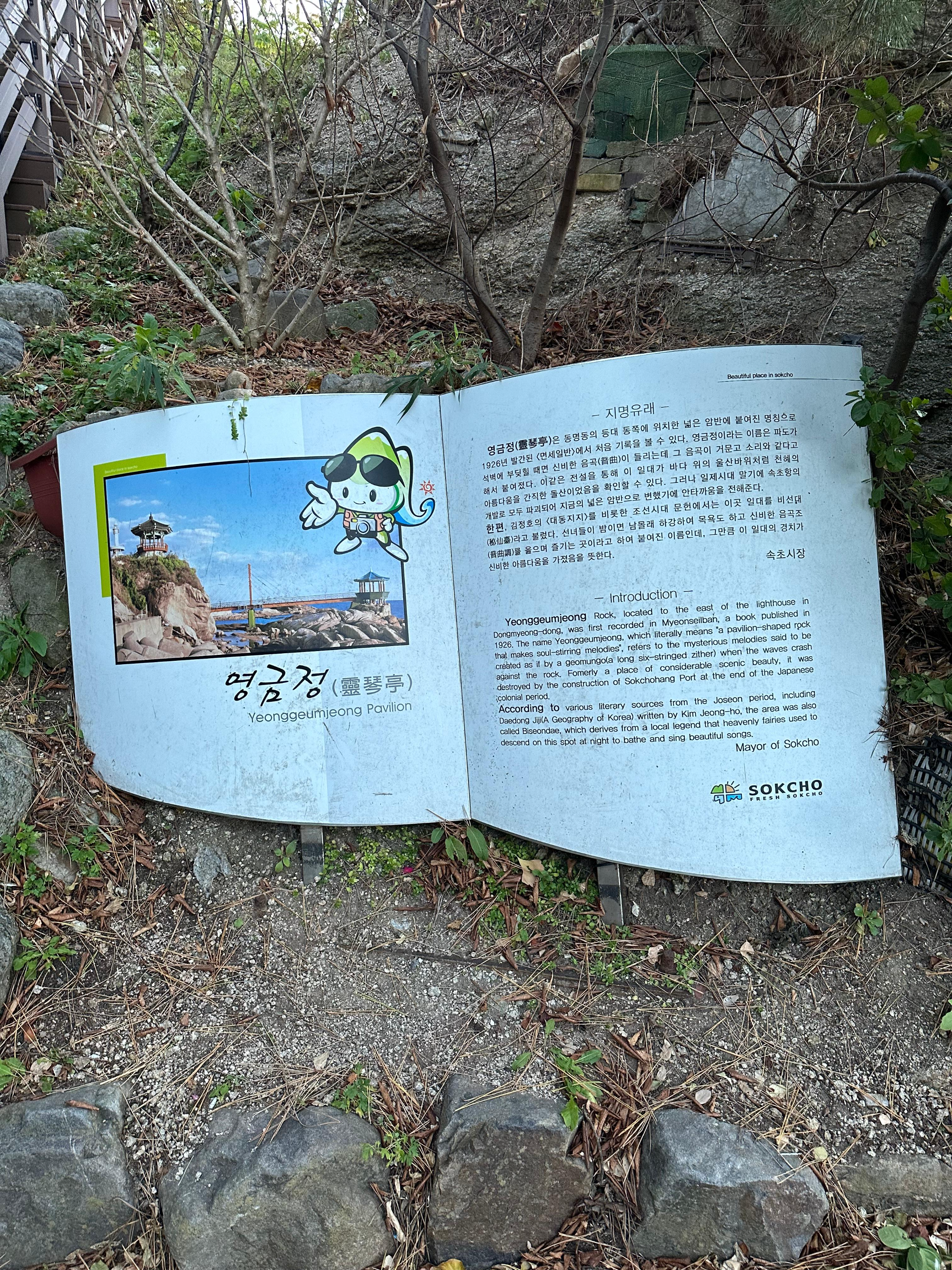 더 어두워지기 전에 속초 영금정과 동명항에서의 모습을 봐야겠다 싶어서 아쉽지만 영금정 해돋이 전망대를 잠시 뒤로한채 영금정 정자전망대로 오르기 시작했습니다. 영금정 정자전망대는 해돋이 전망대와는 다르게 계단이 좁고 좀 더 많았습니다. 영금정 정자전망대 옆에도 책자 모양의 건축물이 설치되어 영금정의 역사를 읽어볼 수 있도록 되어 있었습니다.