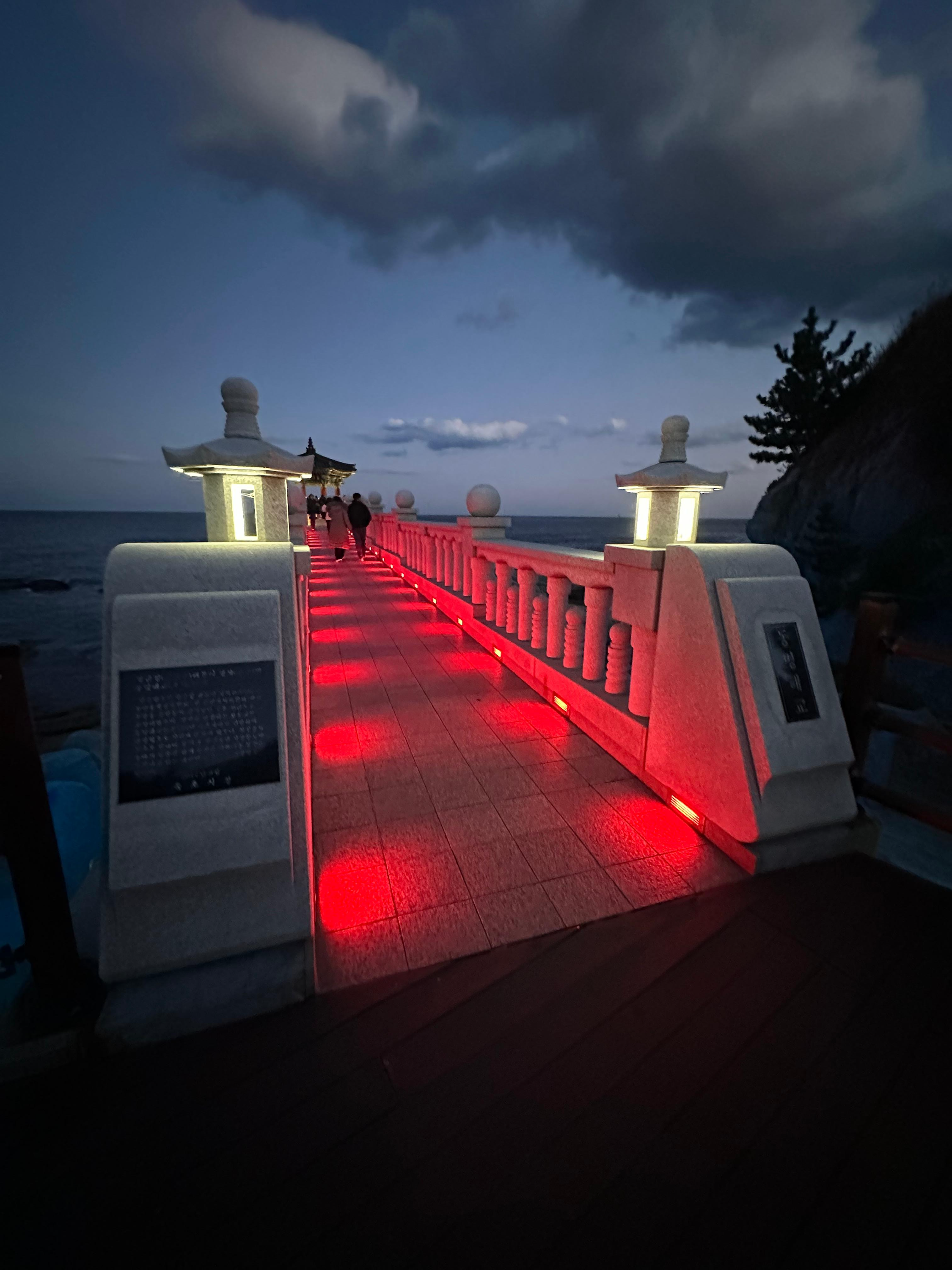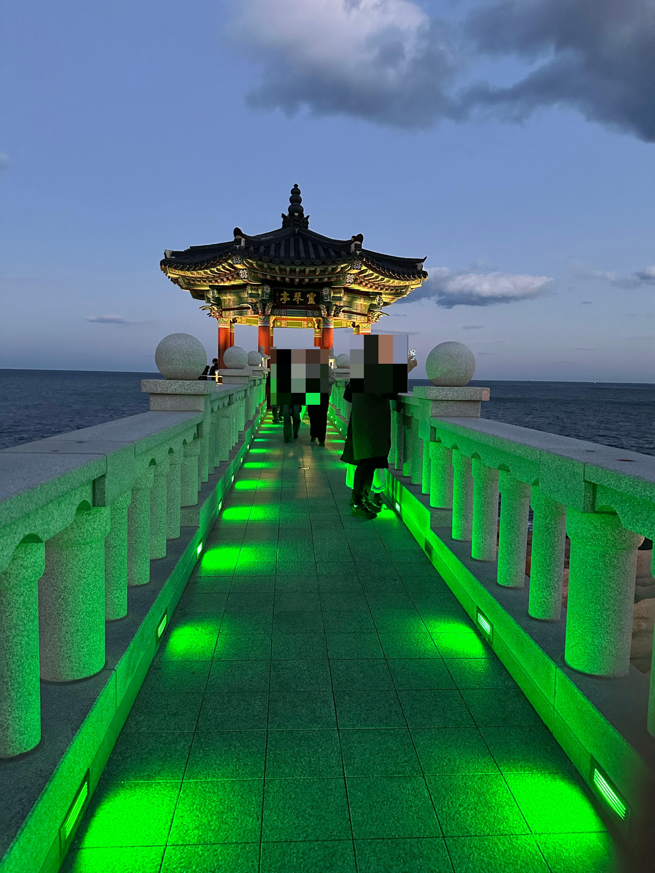 동명항 방파제에서 어둠이 찾아오는 것을 보고 영금정까지 왔던길을 다시 돌아서 가려는데요. 어둠이 찿아오니까 영금정 해돋이 정자 다리에는 이렇게 야간 조명들이 켜지기 시작했습니다. 특히 영금정 해돋이 정자 다리의 조명은 한가지 색상만 아니라 여러 색상이 반복해서 켜지는 것을 볼 수 있었습니다.