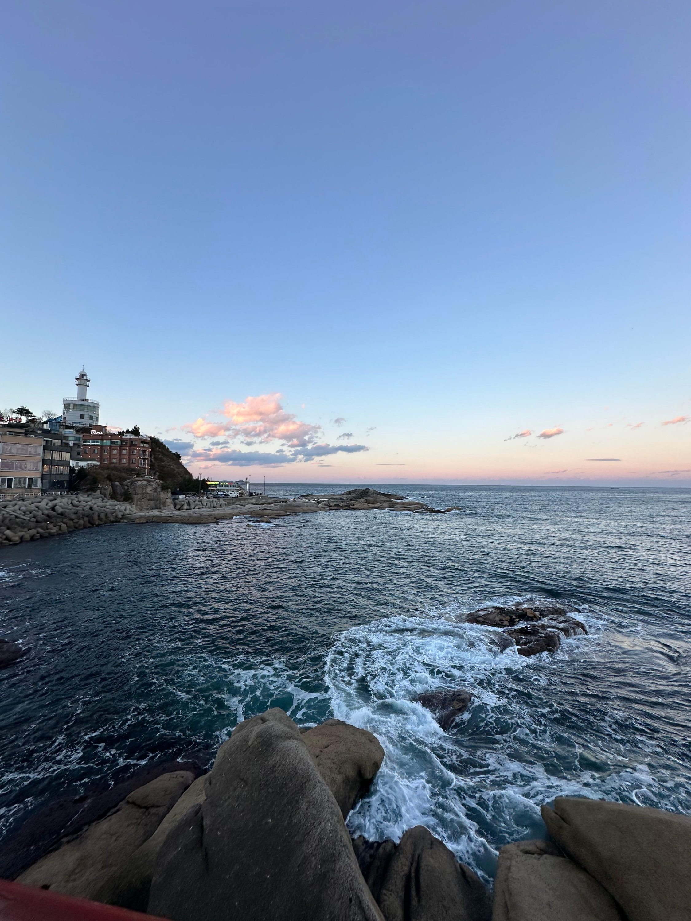영금정 해돋이 전망대에서 짧지 않은 긴 시간동안 속초 시내와 멀리 설악산이 보이는 풍경과 함께 동해바다의 아름다운 일몰 풍경을 바라보았습니다. 일몰속 속초시내와 동명항 방파제와 설악산을 배경으로 한 속초 해수욕장과 속초 시내 모습은 다시 한번 일품이었습니다. 특히 영금정에서는 제가 머물고 있는 속초 해수욕장과 숙소도 함께 멀리 보이고 있었습니다. 실제로 가깝습니다. 지도상으로 반바퀴 정도 돌아서 가기는 하지만 시간 여유가 있다면 속초 바다 보며 여유롭게 걸을 수 있습니다. 도보로 30-40분정도 걸렸던것 습니단. 겨울이라 해가 짧아지는 시간도 빠르지만 일몰이 시작되면 어둠도 빨리 찾아오기 때문에 아쉽지만 더 어두워지기전에 영금정 뿐만 아니라 동명항 방파제도 걸어야할 것 같았습니다. 영금정 해돋이 전망대에서 등대전망대가 있는데요. 저는 조금 늦은시간에 와서 등대 전망대는 가지 못했습니다. 시간이 되신다면 차량이나 도보로 가볼만 할 것 같습니다.