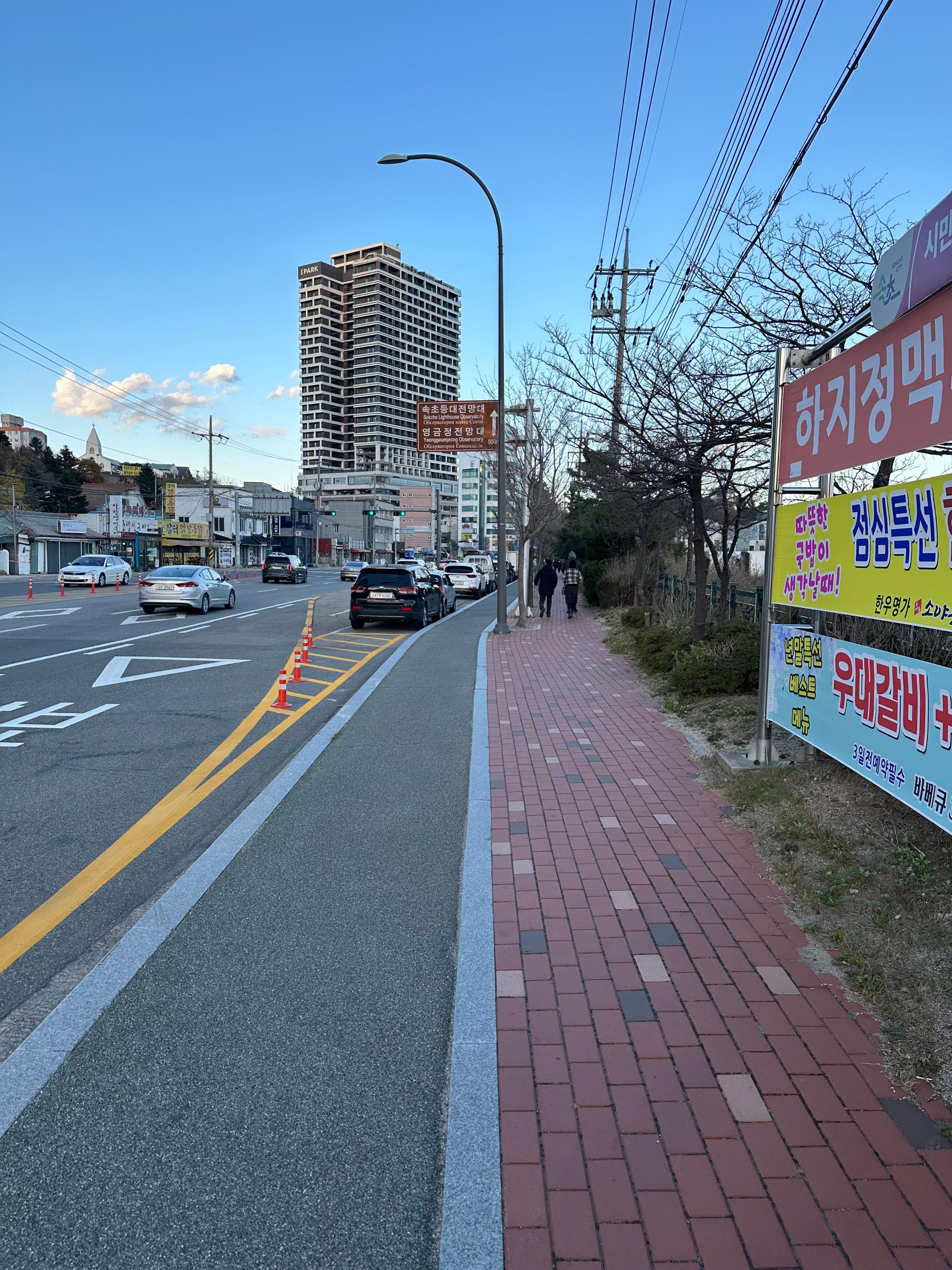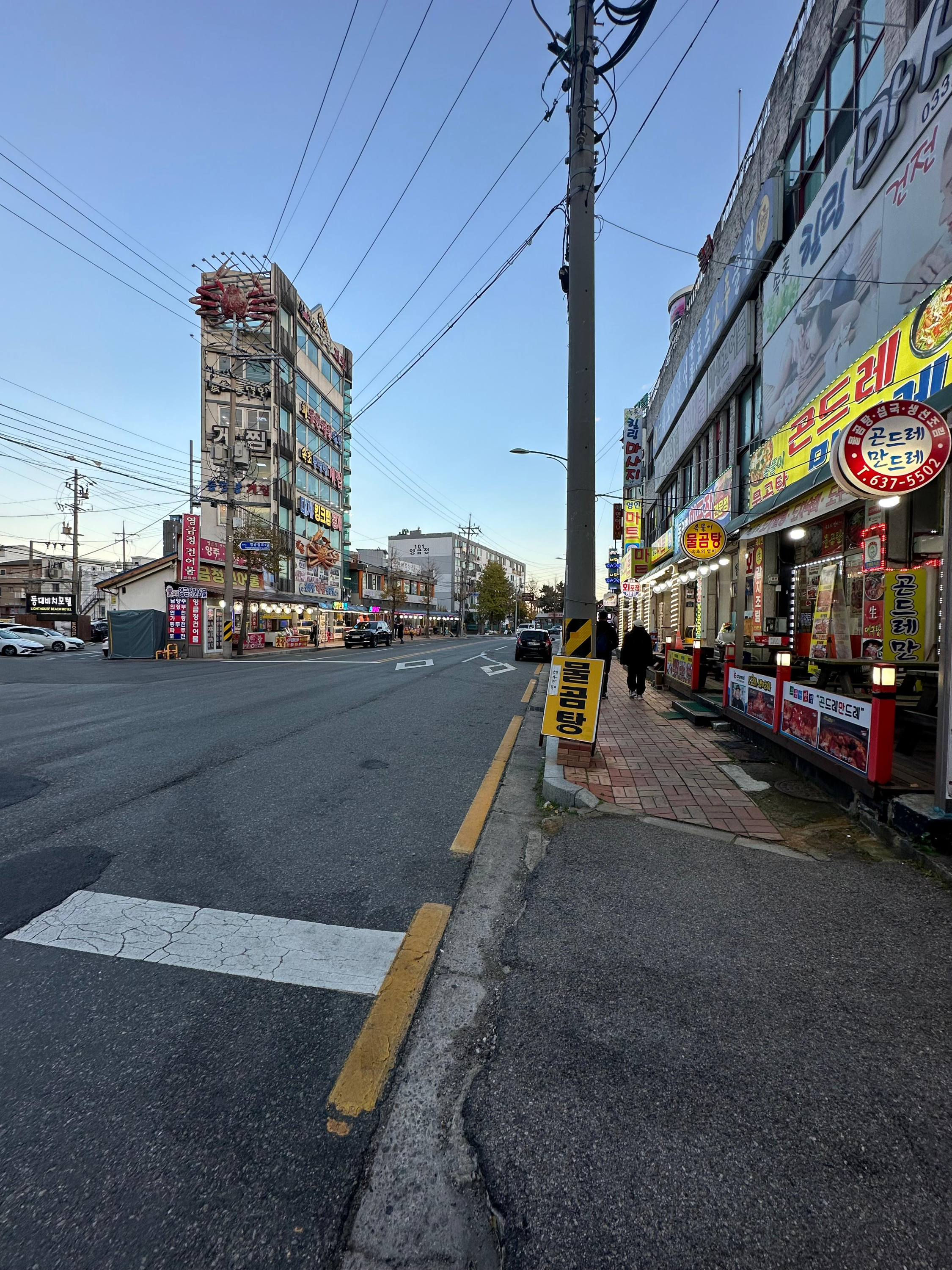 양미리 도루묵을 정말 배부르게 먹고 속초항 여객선 터미널을 출발해서 동명항과 영금정 방향으로 걷기 시작했습니다. 걸어가는데 다양한 횟집과 해산물 가게들을 볼 수 있습니다. 특히 영금정과 동명항 가는길에는 킹크랩과 대게, 건어물를 판매하는가게들이 많이 보였습니다. 해산물 가게 뿐만 아니라 마사지 가게도 보였는데 확 깨는 듯한 느낌이었습니다.