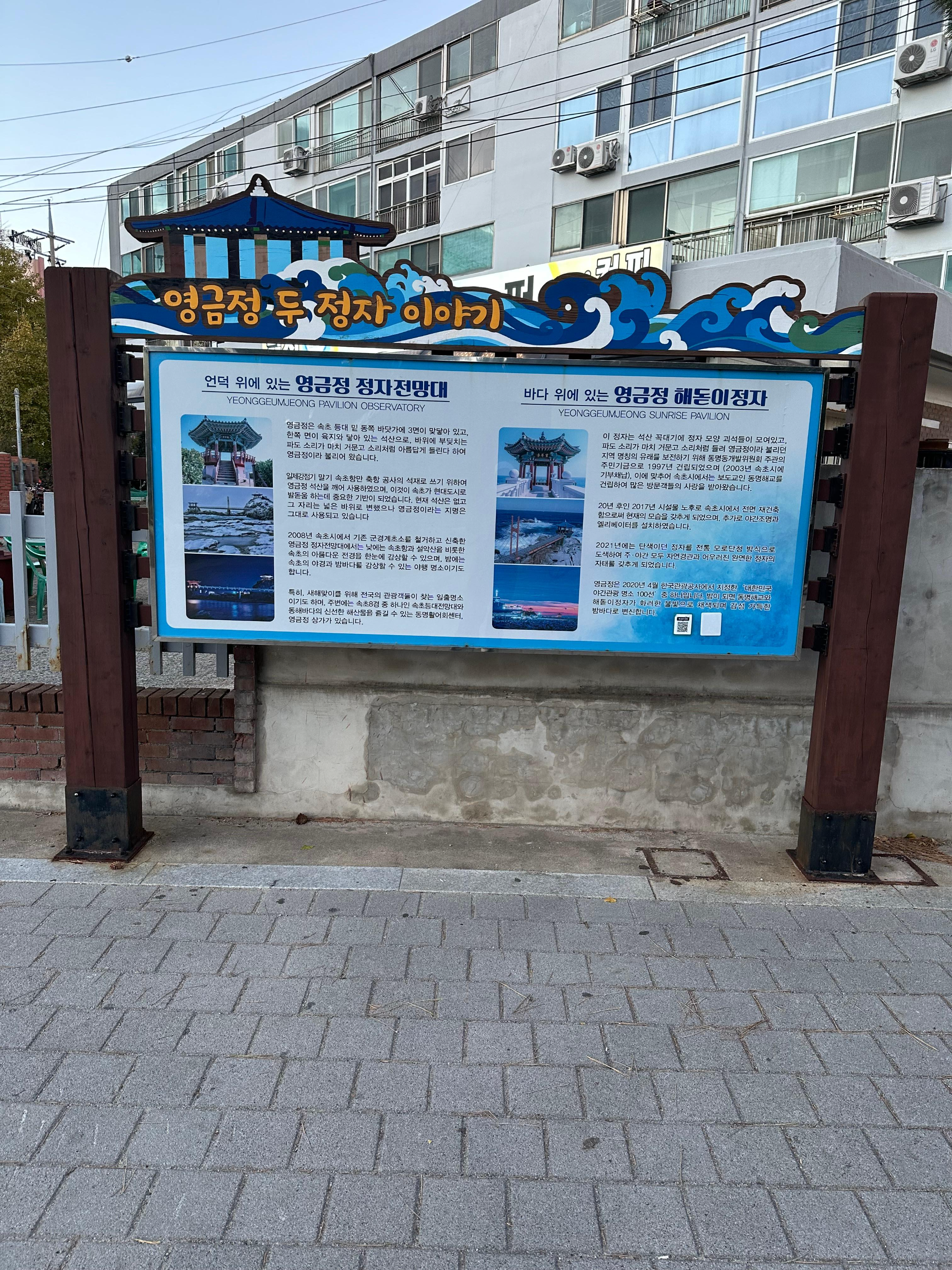 속초 영금정 주차장을 지나서 영금정 입구에 도착하면 영금정에 대한 정보를 볼 수 있습니다. 과거 영금정부터 시작해서 현재의 영금정까지 정보를 볼 수 있는데요. 관광지를 다니면서 관광지의 아름다움을 보는 것도 좋지만 이러한 정보도 함께 알게 된다면 당장은 도움되지 않더라도 좀 더 성숙한 시민이 되지 않을까 싶습니다. 영금정은 2개의 정자로 나누어져있는데요. 해돋이 정자와 정자 전망대로 구분되어있습니다. 정자 전망대는 말그대로 정자가 높은 언덕위에 있는 것을 말합니다. 해돋이 정자는 계단 조금만 올라가면 바다 인근까지 걸어가서 이름처럼 아름다운 해돋이를 볼 수 있습니다.
