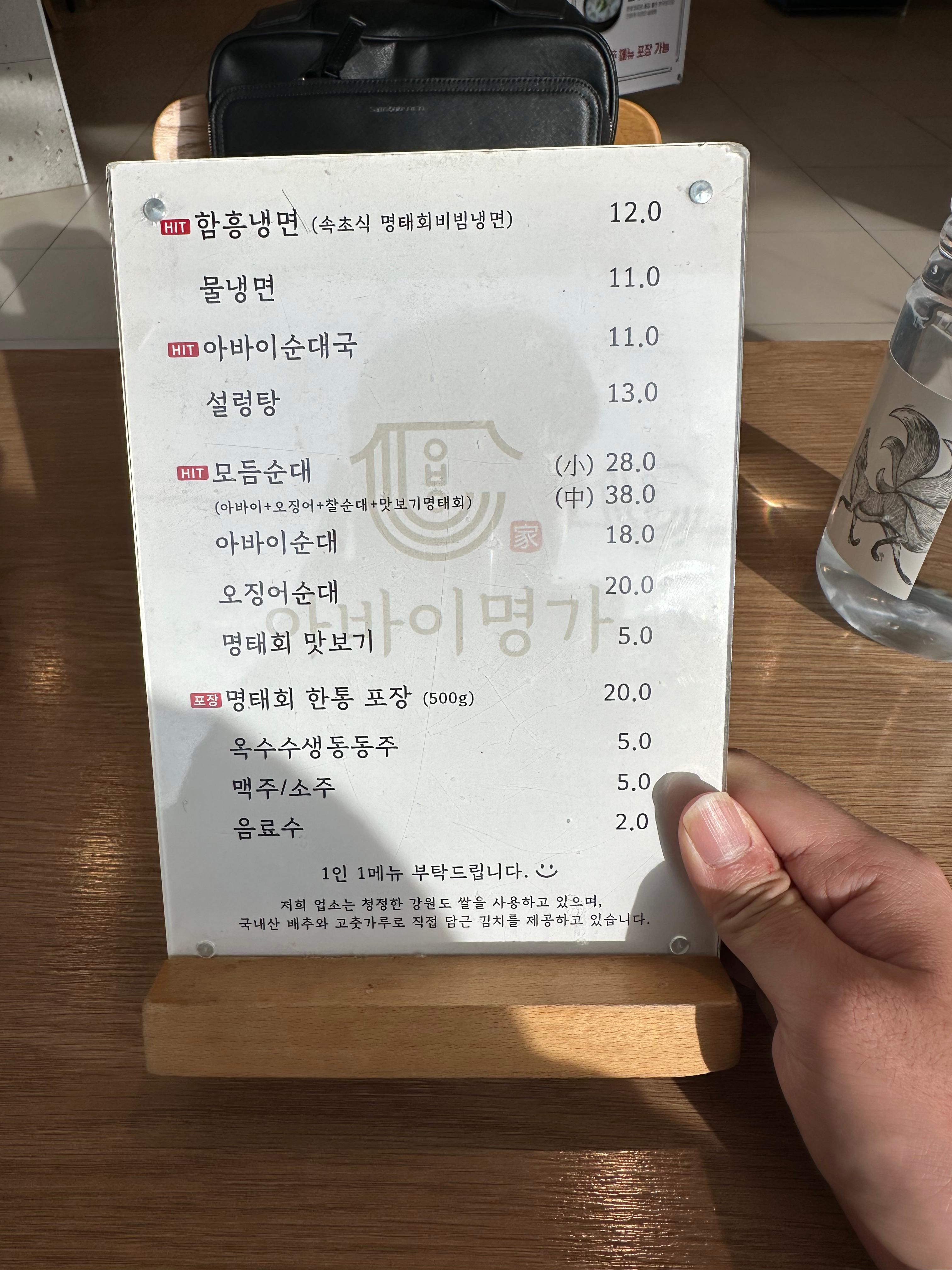 저는 1-2인석 좌석에 앉게 되었는데요. 특히 주말이다보니 사람 없더라도 단체 손님이나 가족 손님이 많다는점에서 혼자 이용한다면 1-2인석 좌석에 앉는게 센스인것 같습니다. 영업하는 사장님 입장에서는 손님 한명도 중요하지만 여러 손님이 더 돈벌이가 되는데요. 혼자인데 다인석에 앉은 것은 가게 사장님에게 불편한 것 같습니다. 생활속에서 이러한 배려를 한다면 참 좋은 것 같습니다. 저는 1-2인석에 앉아서 주문을 하기 시작했는데요. 지난 2년전에는 지인과 함께 모듬순대였는지는 잘 기억나지만 순대와 아바이순대국 그리고 옥수수생동동주를 시켜서 한잔하고 설악산 갔던 기억이 있었습니다. 하지만 이번에는 서울로 가는 버스가 사실 40분전이라 술까지는 그럴 것 같아서 아바이순대국으로 주문을 했습니다.