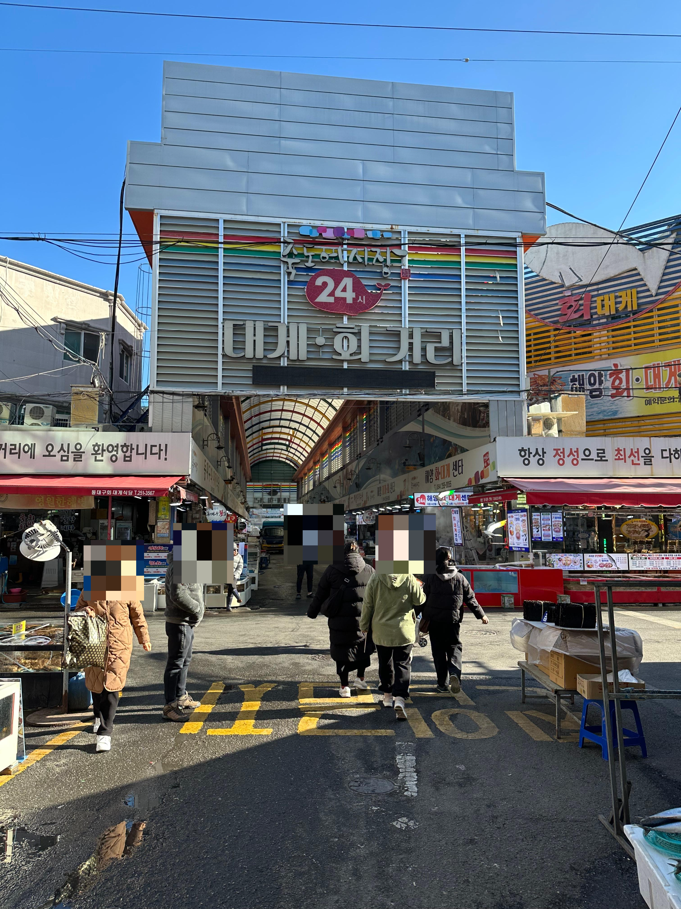 바로 전날에는 포항 고속버스터미널에 늦게 도착한데다가 겨울이라 일찍 어두워져서 가게들이 다 철수한 상태였는데요. 오다가다 게스트하우스에서 11시에 체크아웃 하고 죽도시장으로 들어오니까 상가 점포 가게들이 문을 열고 활발하게 장사를 하는 모습이었습니다.