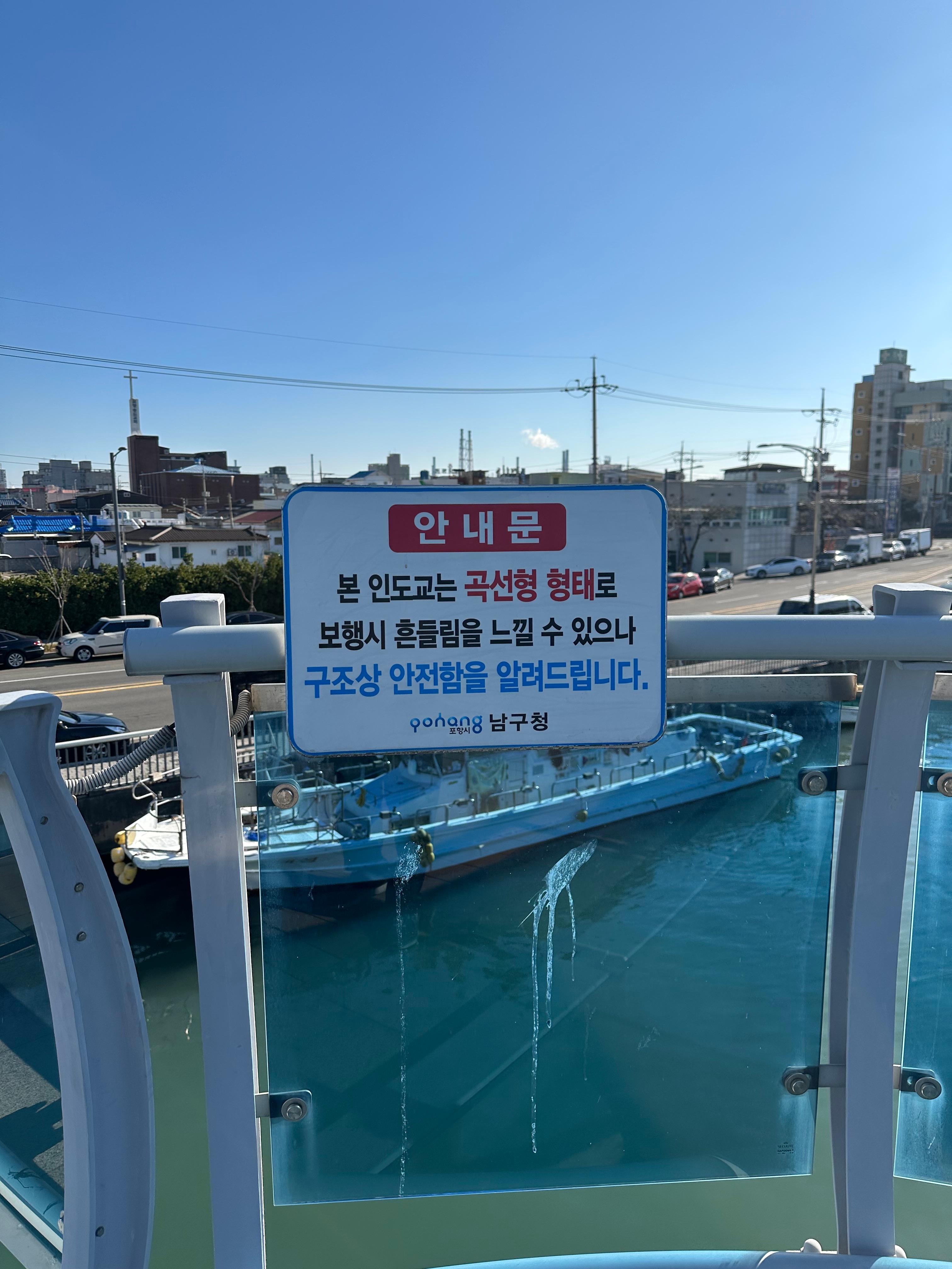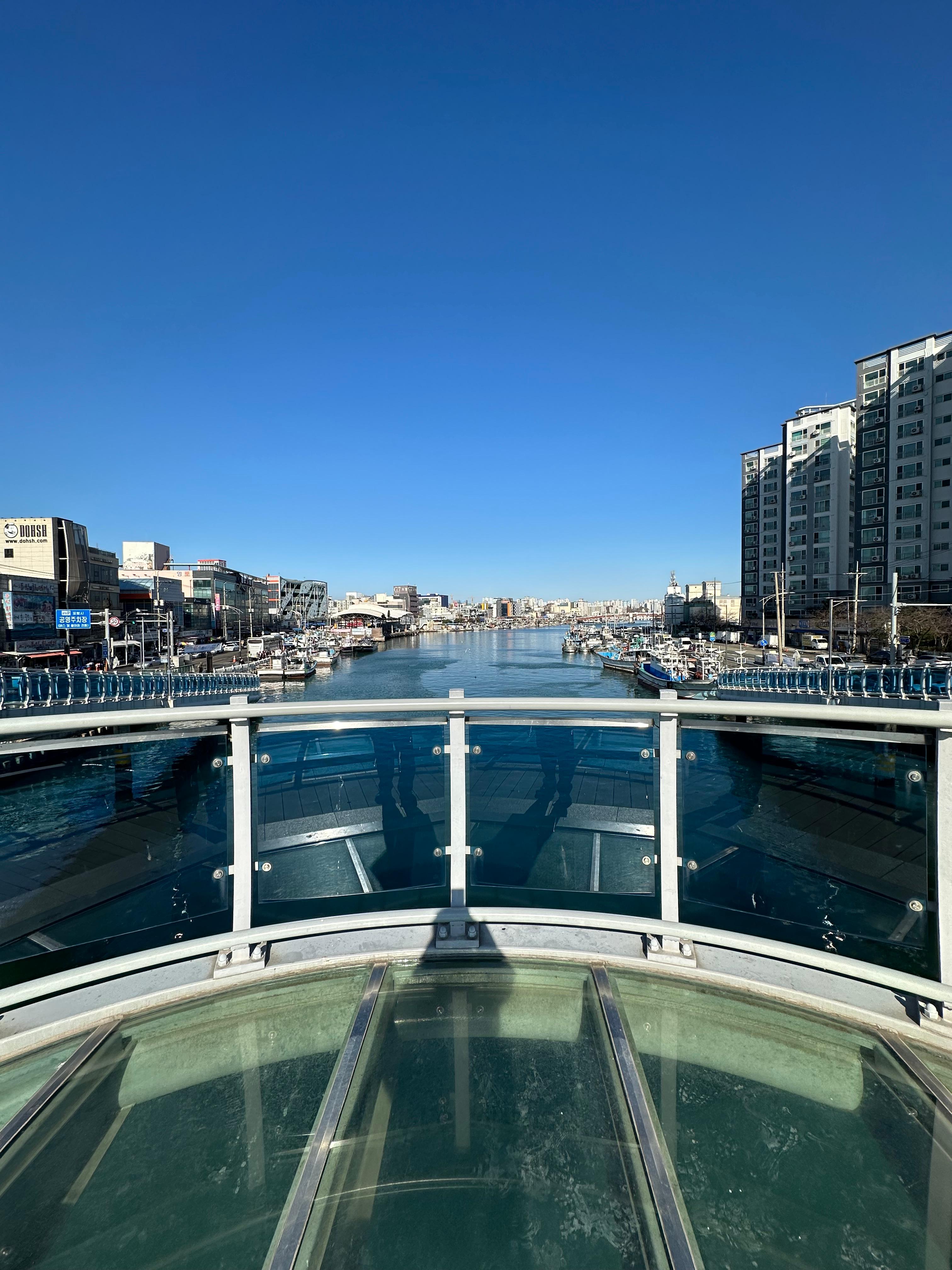 죽도시장 앞에 인도교는 곡선형 형태로 보행시 흔들림을 느낄 수 있다고 하는데요. 하지만 안내문에는 구조상 안전하다고 명시되어있었습닏니다. 저도 직접 올라왔을 때 그런거 전혀 느껴지 않았습니다. 죽도시장 앞에 인도교 올라오면 다른곳과 마찬가지고 스카이워크 형태로 바닥 아래로 인도교 아래 바다를 바로 느낄 수 있었습니다. 요즘은 어디를 가나 이렇게 스카이워크를 설치하는 것 같습니다. 케이블카 상부정류장이 아닌더라도 전망대라고 할 수 있는 곳은 이렇게 스카이워크를 통해 마치 바다 위에 떠있는 것처럼 느낄 수 있도록 만드는 것 같습니다.