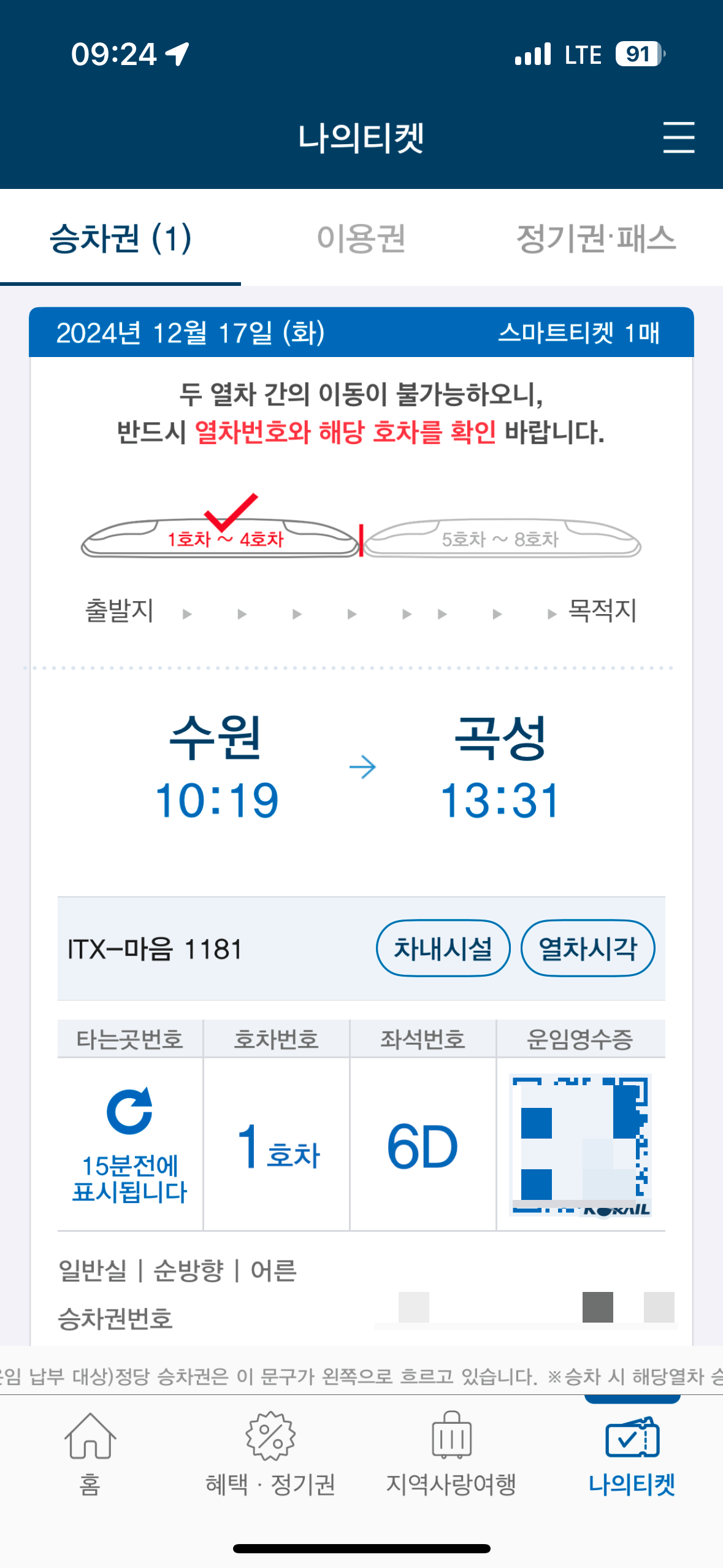 제가 탔던 ITX 마음은 지난 2024년 11월말에 탔던 것처럼 10시 19분에 떠나는 동일 열차 였습니다. 복합열차로 이루어져서 승차권에도 복합열차이니까 주의하라는 것을 볼 수 있습니다. 수원역에서 곡성방향으로 가는 ITX 마음 열차는 익산역을 기준으로 호남선과 전라선으로 복합열차가 분리되어 운행됩니다.