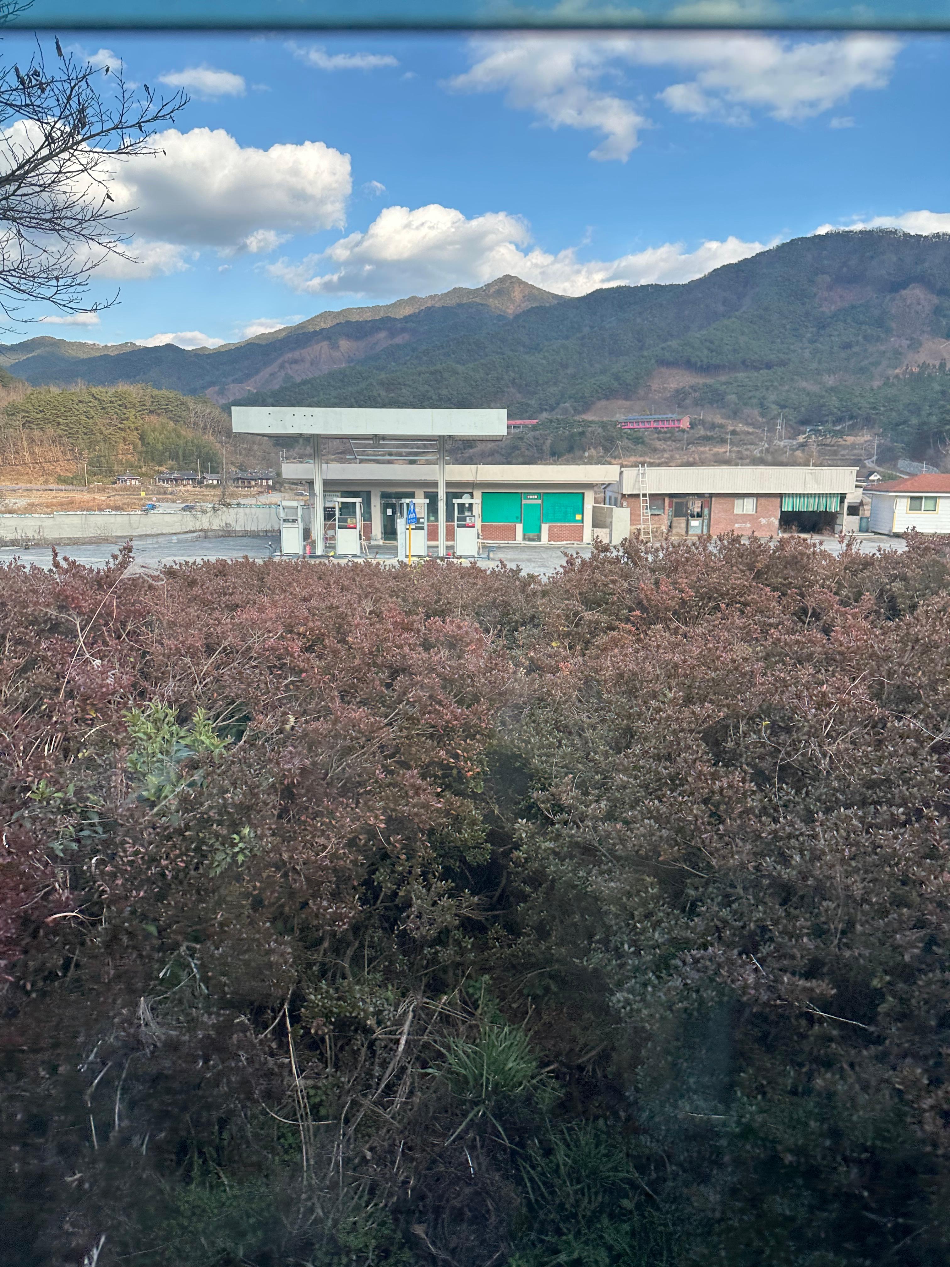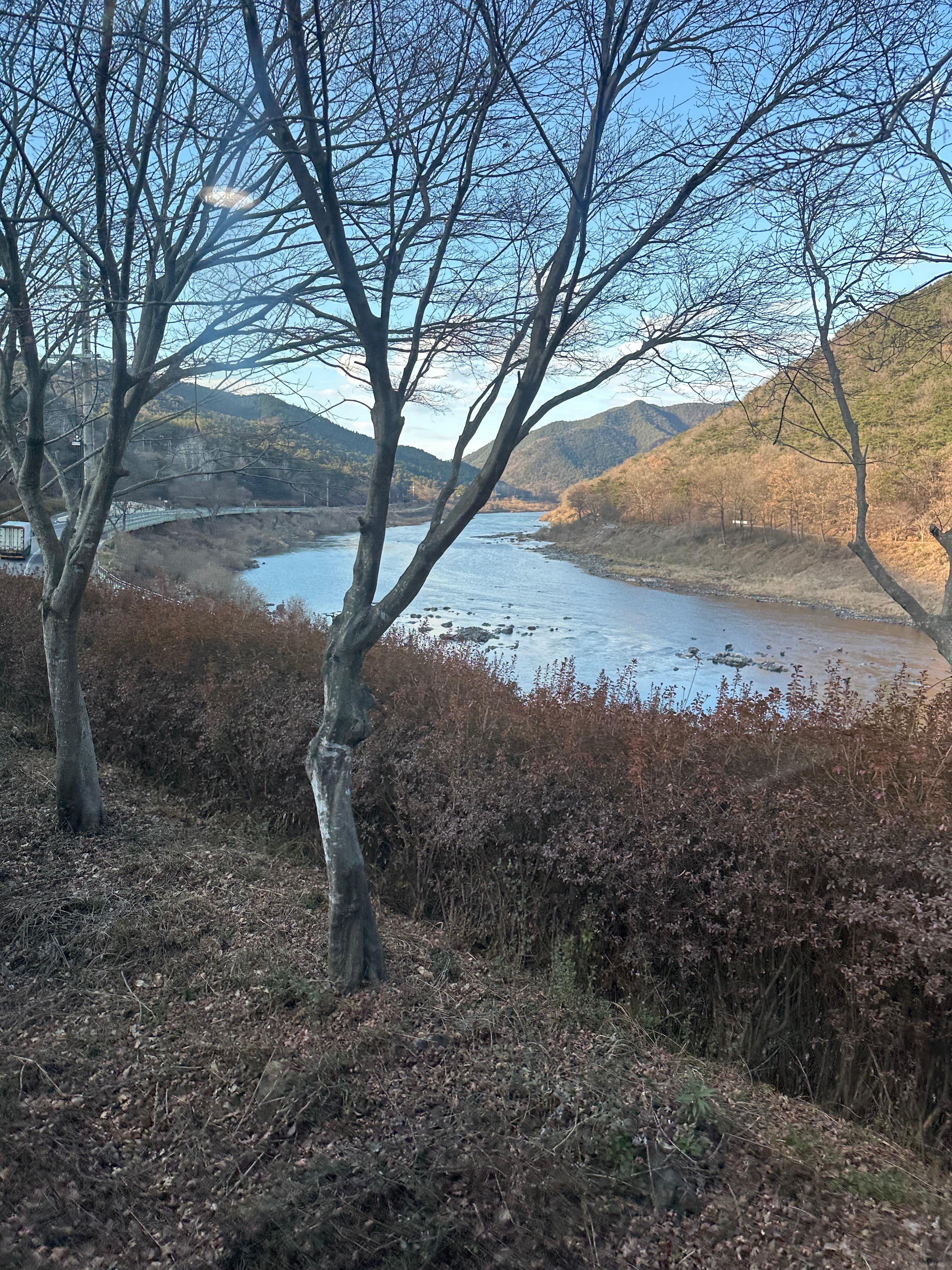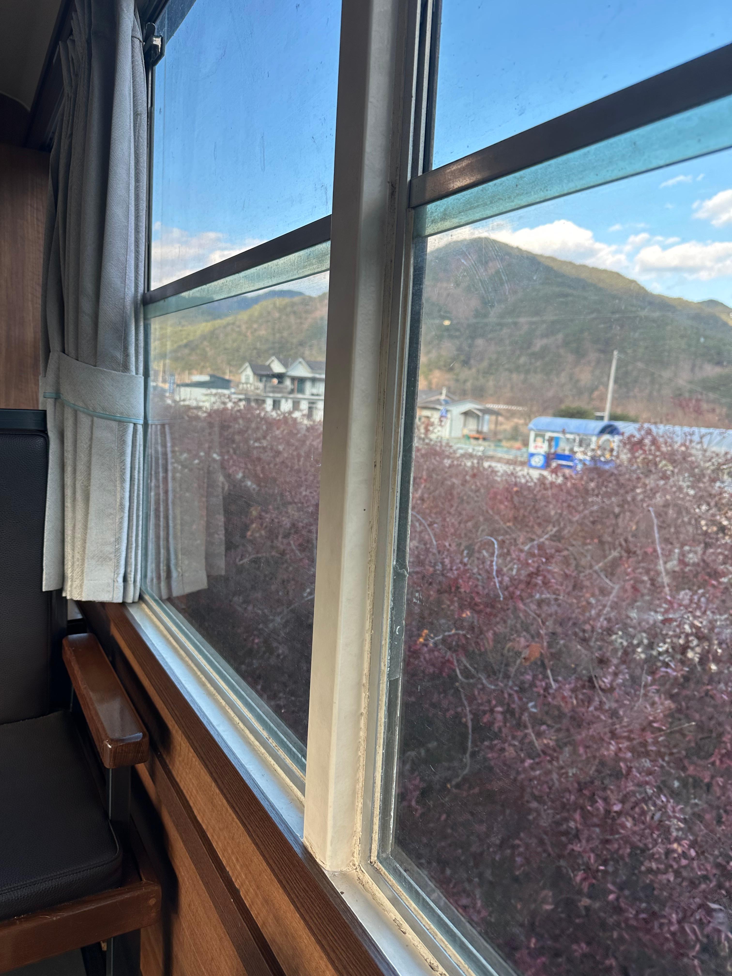주행하다보면 지금의 지하철이나 열차의 차량기지 처럼 생긴 곳도 보이는데요. 섬진강 기차마을은 증기기관차 뿐만 아니라 레일바이크를 이용해서 가정역까지 갈 수 있다고 해요. 그래서 저곳을 자세히는 보지 않았지만 레일바이크가 모여있는 차량기지처럼도 보였습니다. 섬진강 증기관차는 섬진강을 지나기도 하면서 시골마을 모습도 함께 보면서 갈 수 있어요. 지난 2024년 10월에 부산 송정에서 탔던 블루라인 해변열차와는 다른느낌이었는데요. 부산은 그래도 도시느낌이 많이 나서 도시의 모습도 보이지만 섬진강 증기기관차의 매력은 시골속 조용한 모습을 그대로 느낄 수 있다는거에요. 특히 바다를 보면 평온한 느낌을 받는데요. 섬진강이라는 강과 함께 시골 풍경은 정말 편안하게 마음을 만들어주었습니다.