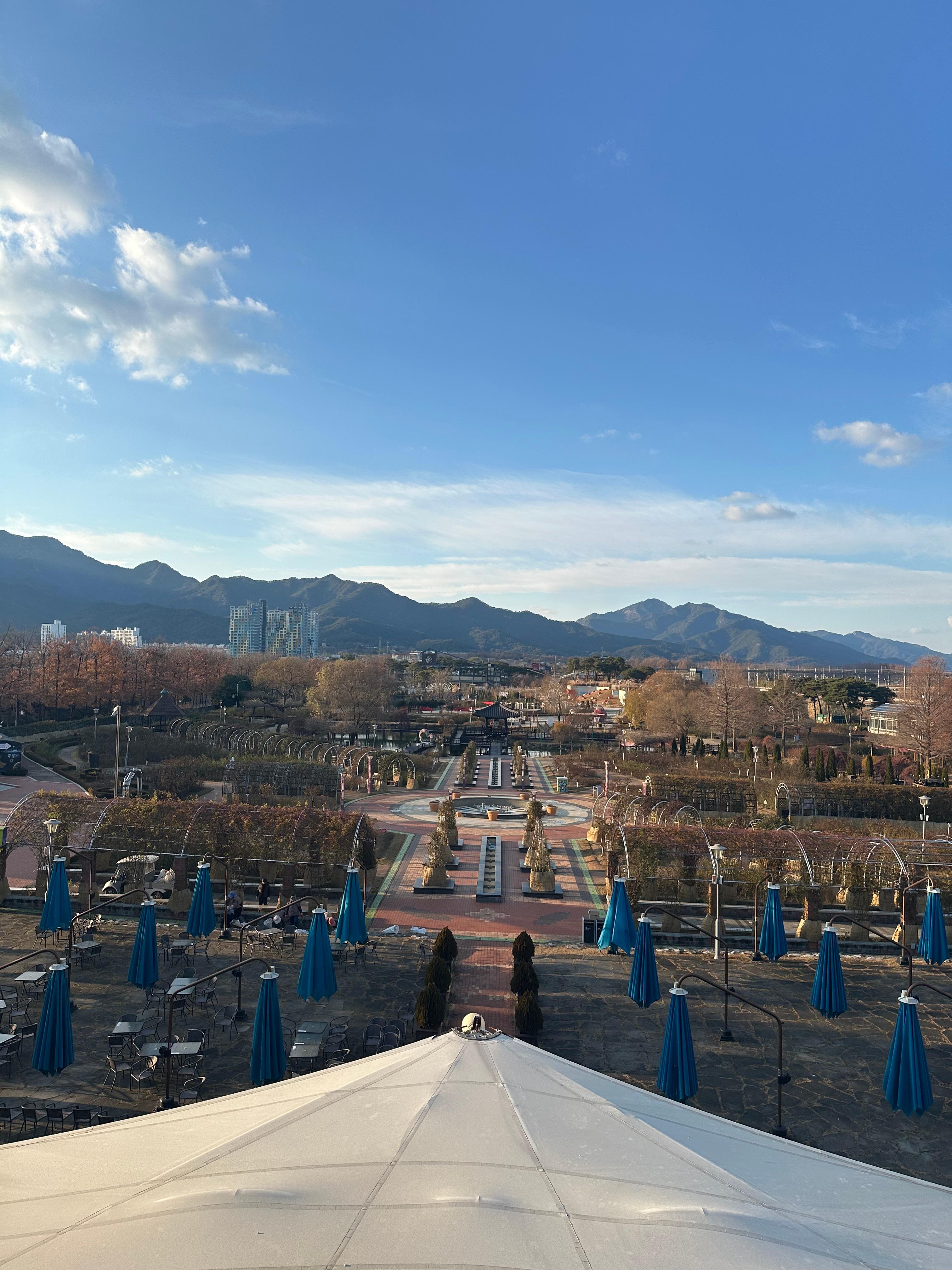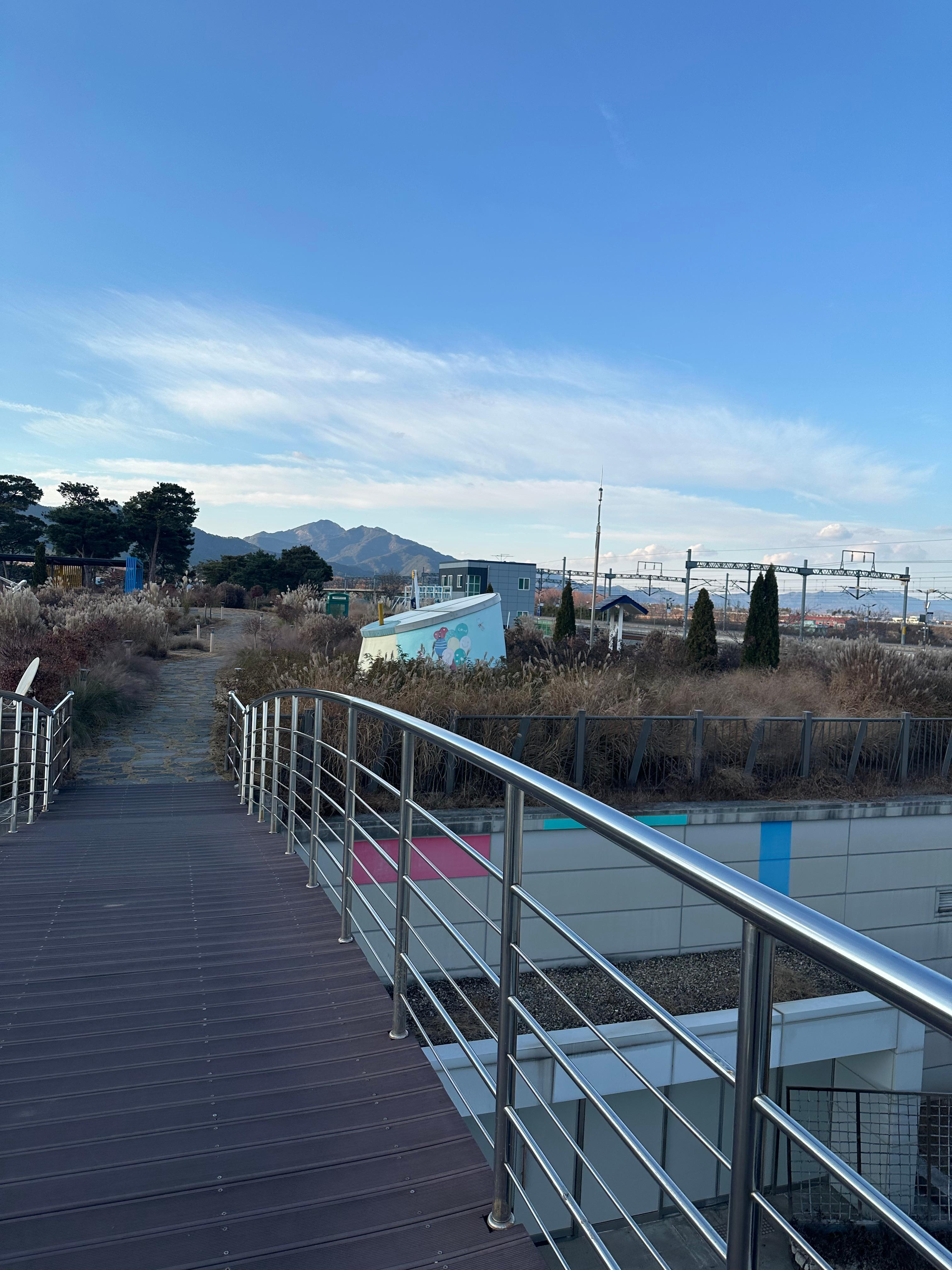 로즈 카카오라고 불리는 곳으로 계단 따라 올라가면 구 곡성역과 현재이 곡성역의 주변의 풍경을 볼 수 있는 전망대가 있습니다. 특히 지금의 전라선 곡성역 방향이 더 좋은데요. 장미공원과 함께 멀리는 산과 현재이 곡성역이 보여서 더할 나위없이 풍경이 좋았습니다. 겨울이라 그런지 장미가 보이지 않았지만 아마도 봄과 가을에는 장미 꽃들이 더 많지 않을까 싶습니다.
