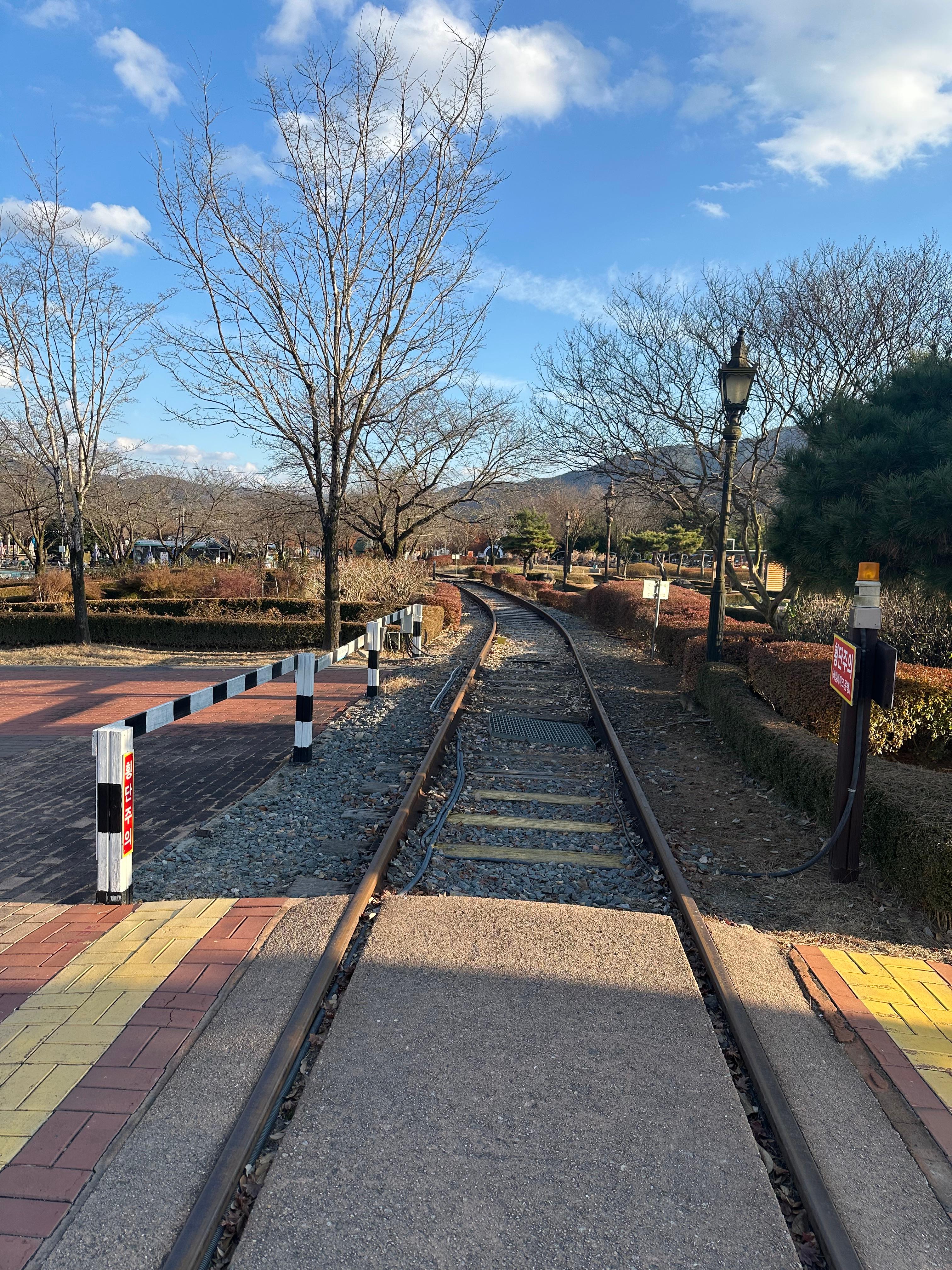 구 곡성역에서 14시 30분에 탑승해서 종점인 가정마을까지 갔다가 돌아오니까 대략 1시간 30분 소요되어 15시 45분에 도착했습니다. 해가 빨리지는 겨울이라서 4시만 되어도 일몰의못브을 볼 수 있었던 겨울 곡성의 모습이었습니다. 구 곡성역 주변으로는 과거 구 전라선 선로를 남겨두었는데요. 그리고 그 주변에 섬진강 기차마을이라는 공원을 조성하고 작은 놀이동산과 동물원을 만들었습니다. 구 전라선 곡성역이다보니 걷다보면 기찻길을 만날 수 있었습니다.