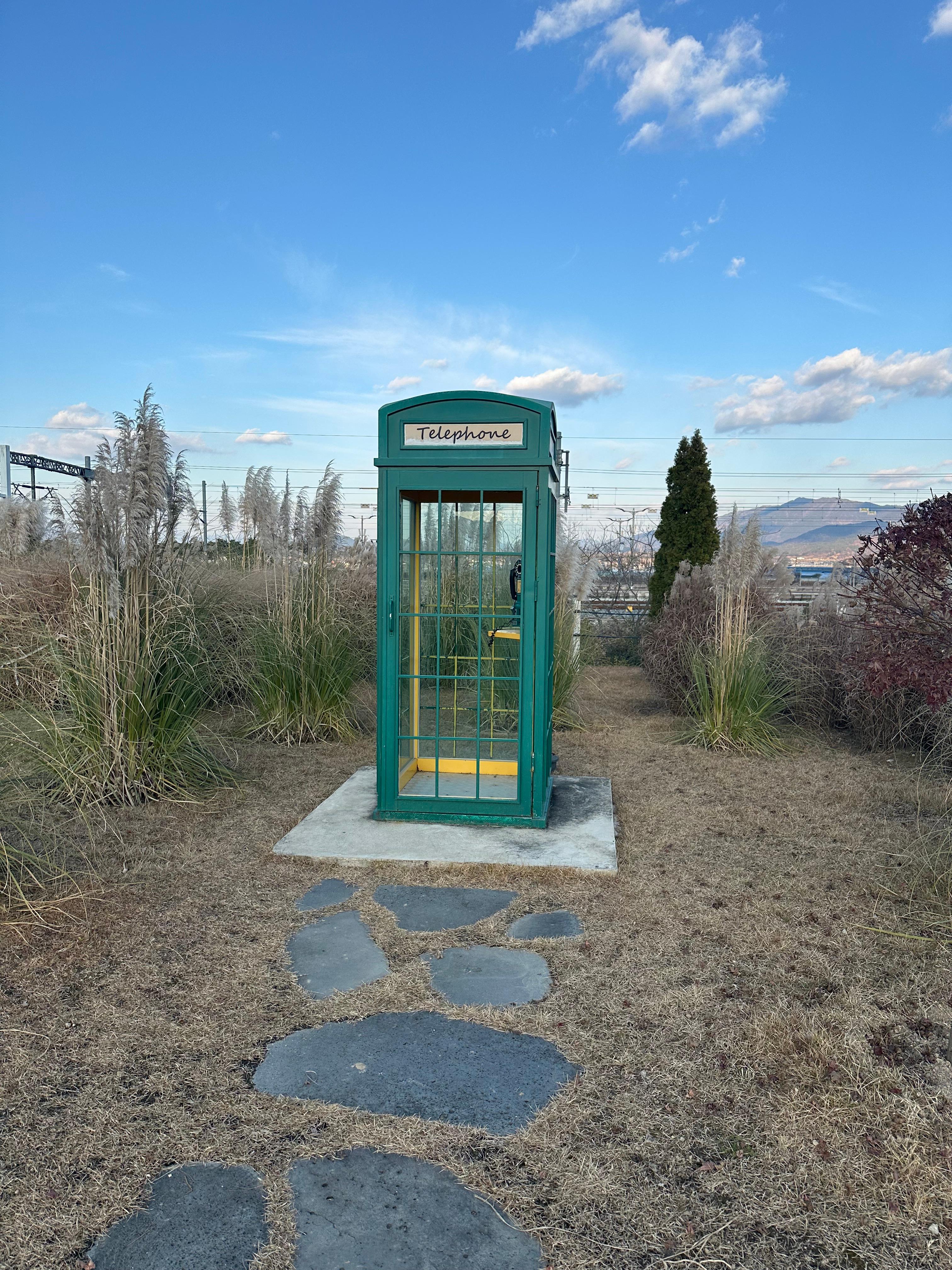 섬진강 기차마을의 매표소 건물이 보이고 있습니다. 언덕 위를 지나면서도 멋진 풍경들을 볼 수 있었는데요. 곡성역 승강장을 배경으로 하고 있는 것처럼 약간 이국적인 분위기가 느껴지는 공중전화박스가 이색적인 느낌이었습니다. 몇년만에 다시 찾은 곡성역이었는데요. 정말 많이 변했습니다. 관광명소도 계속 변해가는 세상입니다. 변하지 않아도 그 자체로 아름다움도 있지만 사람들의 눈길을 이끌기 위해서는 계속 변해야하는 것은 사물이든 사람이든 당연한 것 같습니다. 그렇게 곡성 기차마을에서 타보고 싶었던 증기기관차까지 모두 마치고 저는 출구를 통해 곡성역으로 발걸음을 빠르게 옮겼습니다.