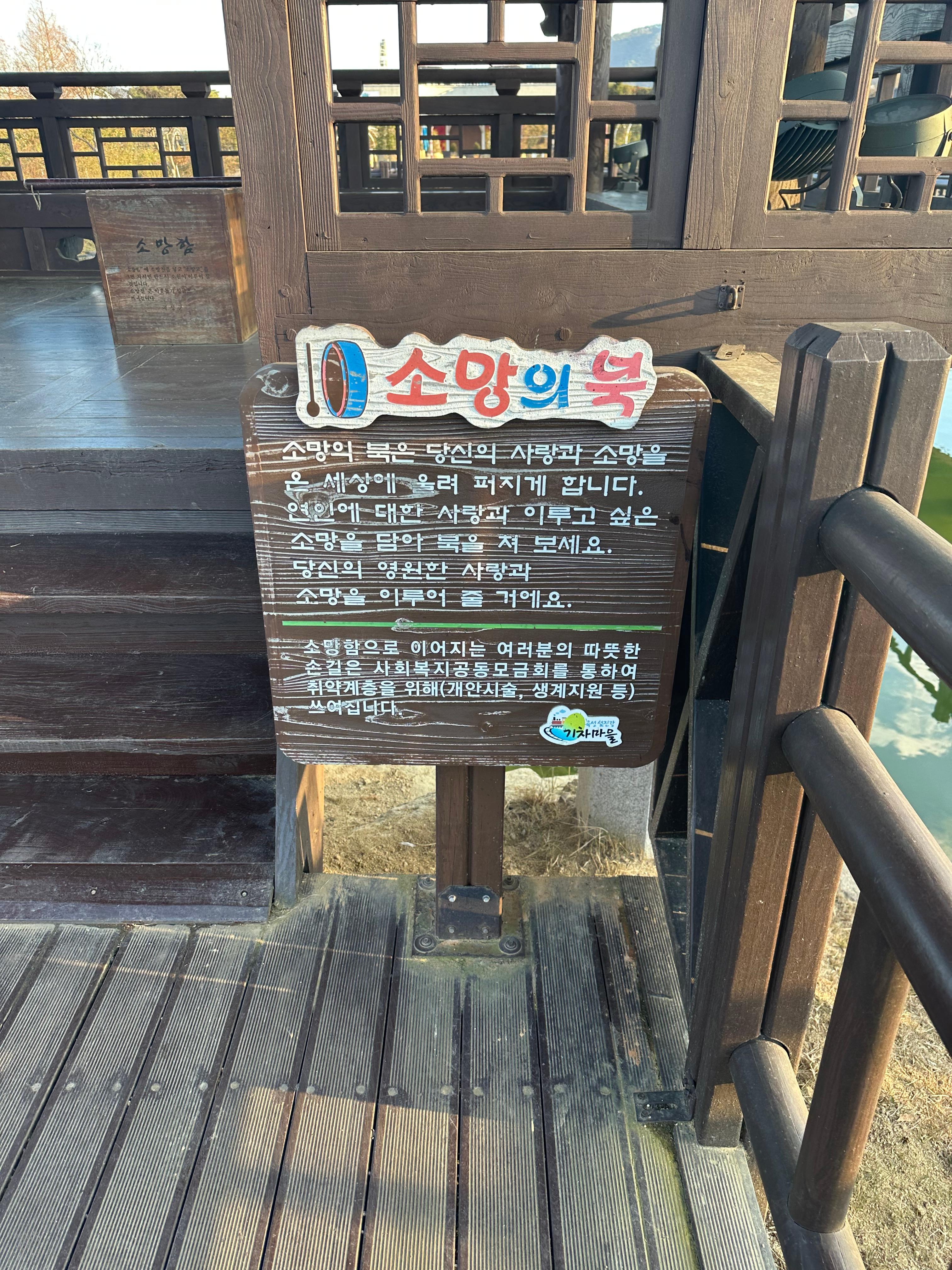 저는 이번에도 북을 3번 치고 소원을 빌었습니다. 그리고 소망정 안쪽에는 소망함이라고 해서 기부도 할 수 있는데요. 내소원을 비는 만큼 남에게 베푸는것도 중요하다는 것을 알려주는 것 같았습니다. 그만큼 사람은 돕고 사는것인가 봅니다. 한달만에 찾았지만 소망정 옆에는 섬진강 기차마을 대모험이라는 도깨비라는 구하라는 이벤트도 볼 수 있었습니다.